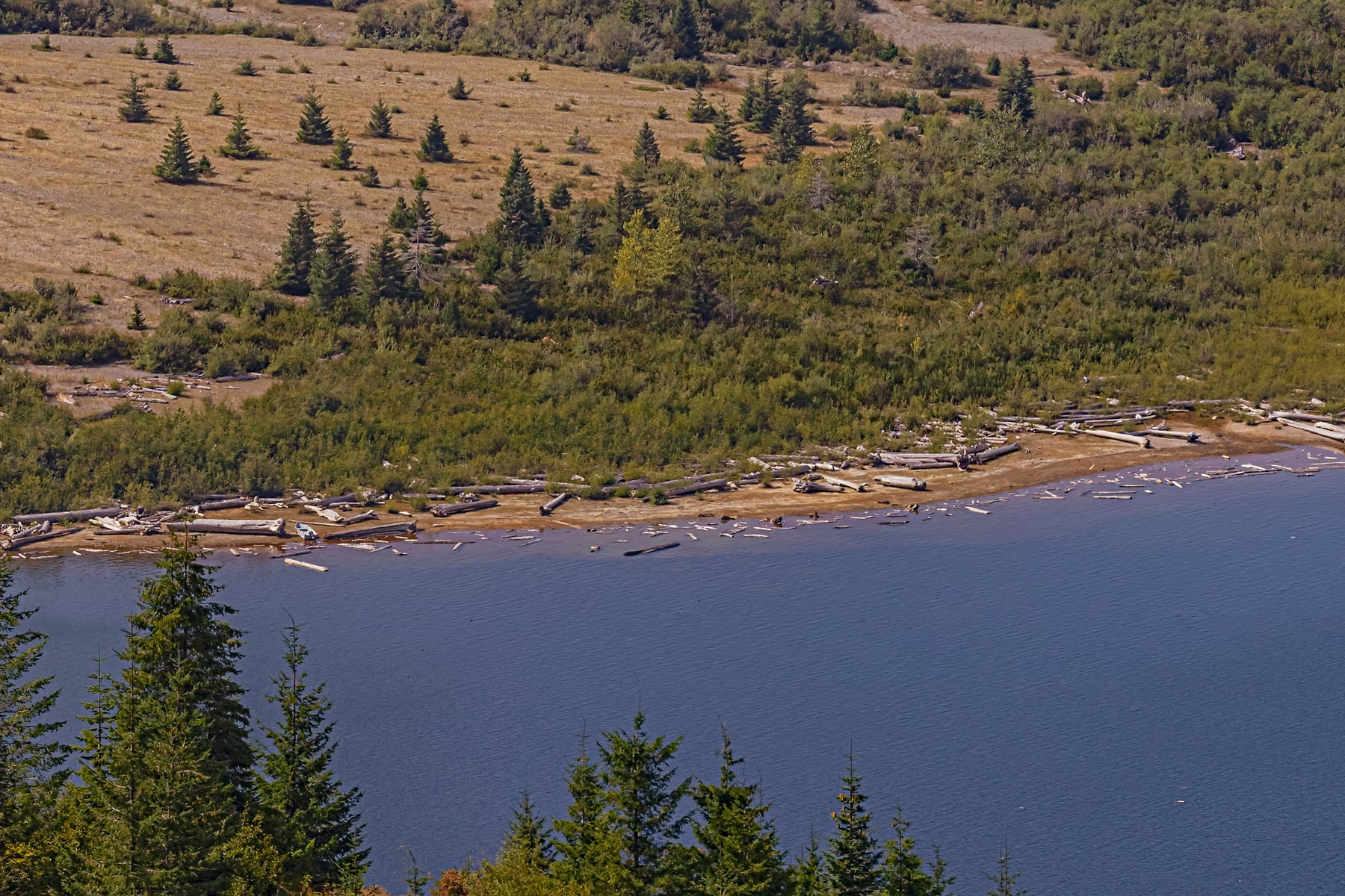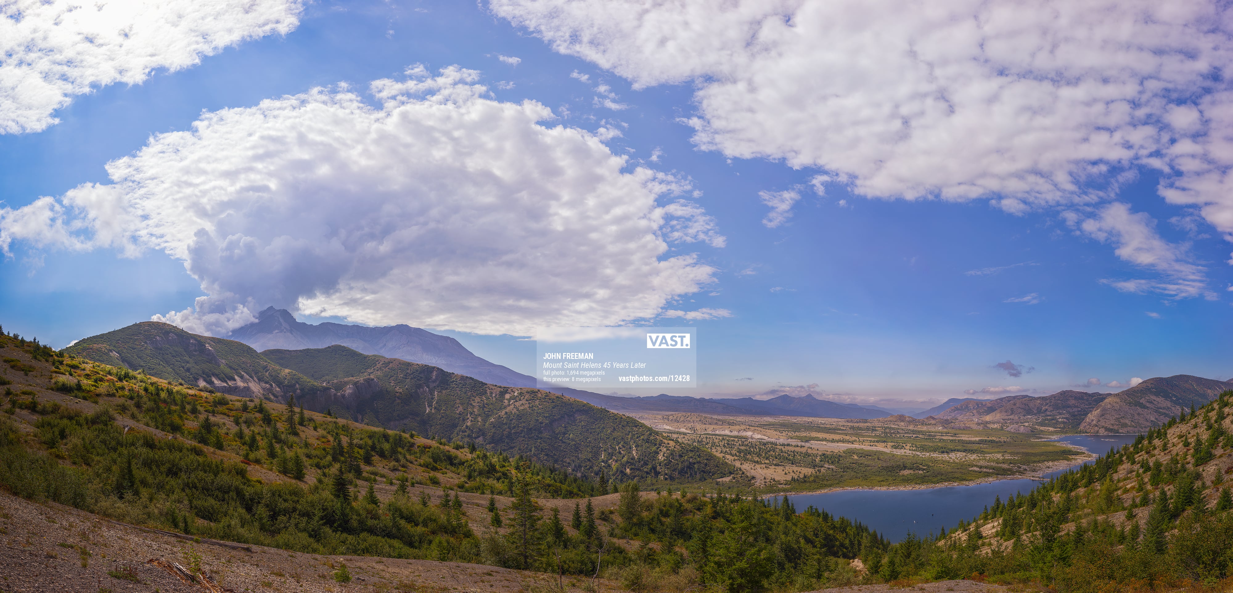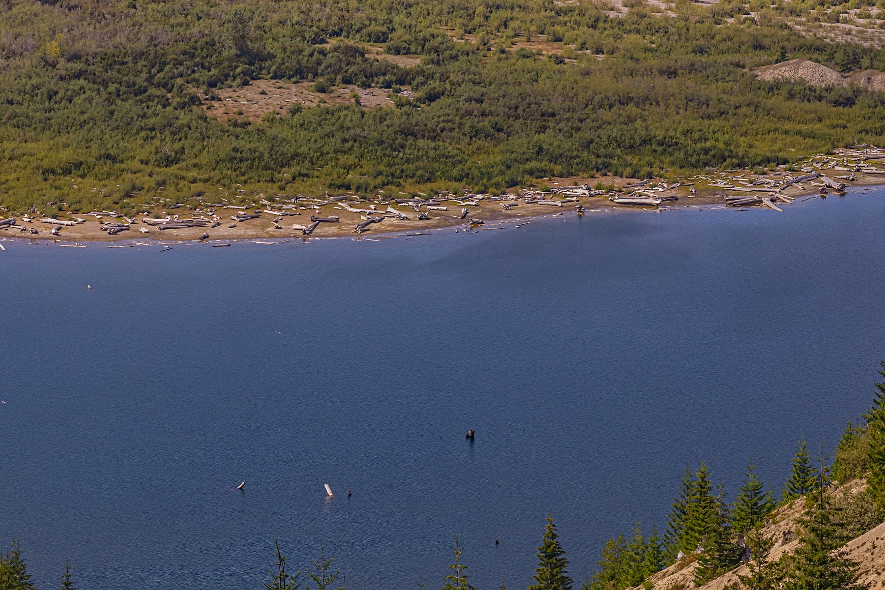 It's been 45 years since the volcano's 1980 eruption. Yet 45 years later the lake in the photo has numerous logs from the trees that were snapped like toothpicks when the mountain exploded.