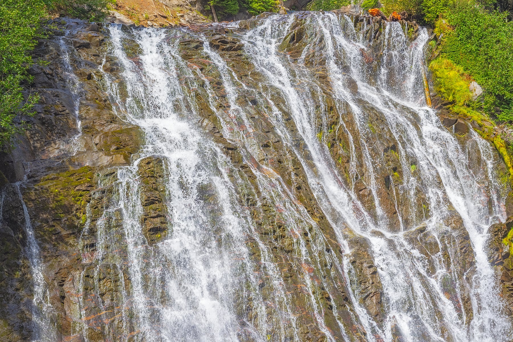 At the end of the short but steep trail, the entire 168-foot-high waterfall is visible. The vista is not only about dramatically falling water but also the rock that creates the steep drop. Here the Paradise River plunges over the edge of a relatively recent flow of hard Andesite lava that abuts much older rock. This lava’s cooling was accelerated by contact with the icy surface of the glacier that once filled this valley. The Paradise River runs clear, not milky, because it originates from snowfields, not debris-laden glaciers.