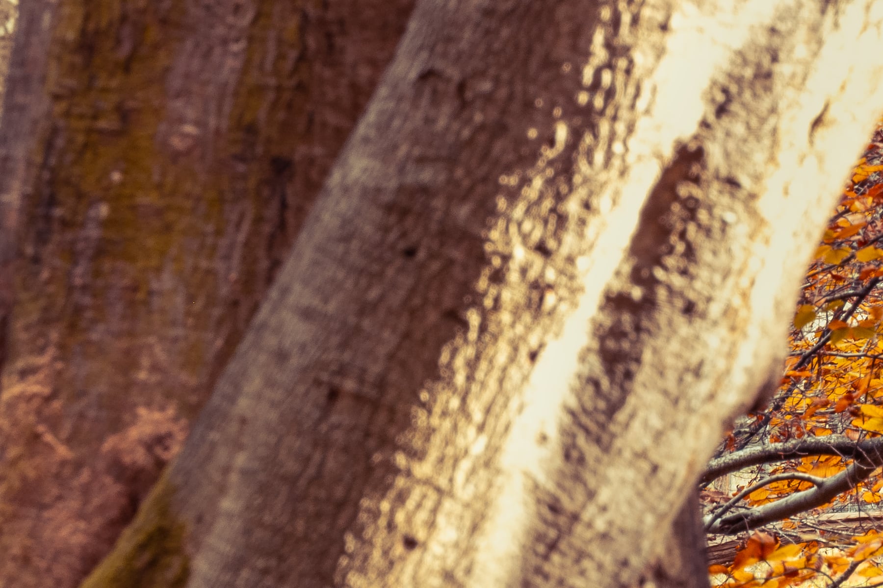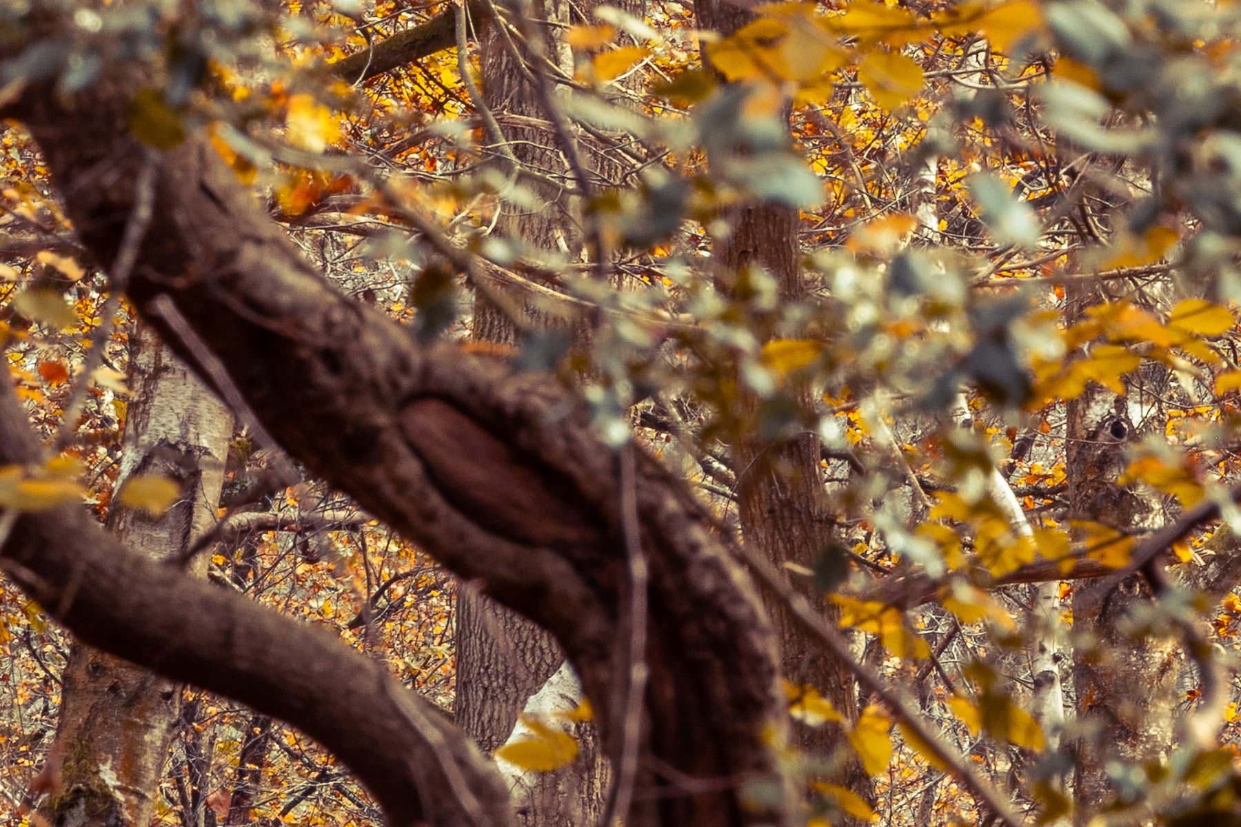 A mesmerizing autumn forest pathway stretches into the distance, framed by towering ancient trees with twisted trunks and sprawling branches. Their golden leaves create a canopy overhead, filtering the soft, diffused light that bathes the entire scene in a warm, amber glow. The ground is blanketed in a thick carpet of fallen leaves, adding to the enchanting atmosphere of this woodland retreat. The rugged bark of the trees, some leaning at dramatic angles, tells stories of resilience and time, while scattered branches and logs on the forest floor contribute to the raw beauty of the scene.
