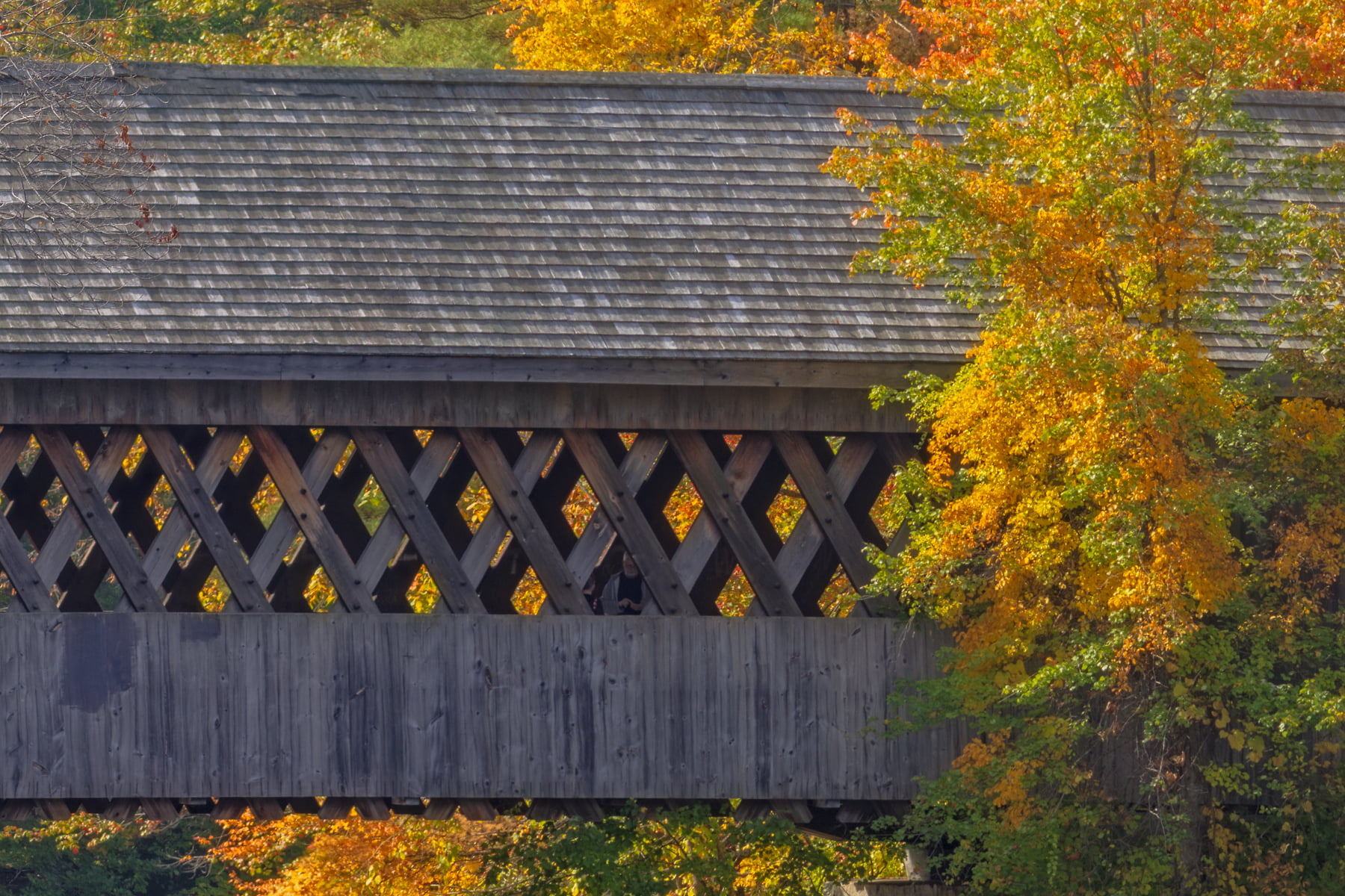 This bridge, which crosses the Contoocook river, located on Grove St in Henniker, New Hampshire, near the New England College campus was built by Milton Graton and his son Arnold in 1972 using traditional methods. The bridge serves New England College and the community of Henniker as a footbridge. Town lattice truss; 136 feet long.