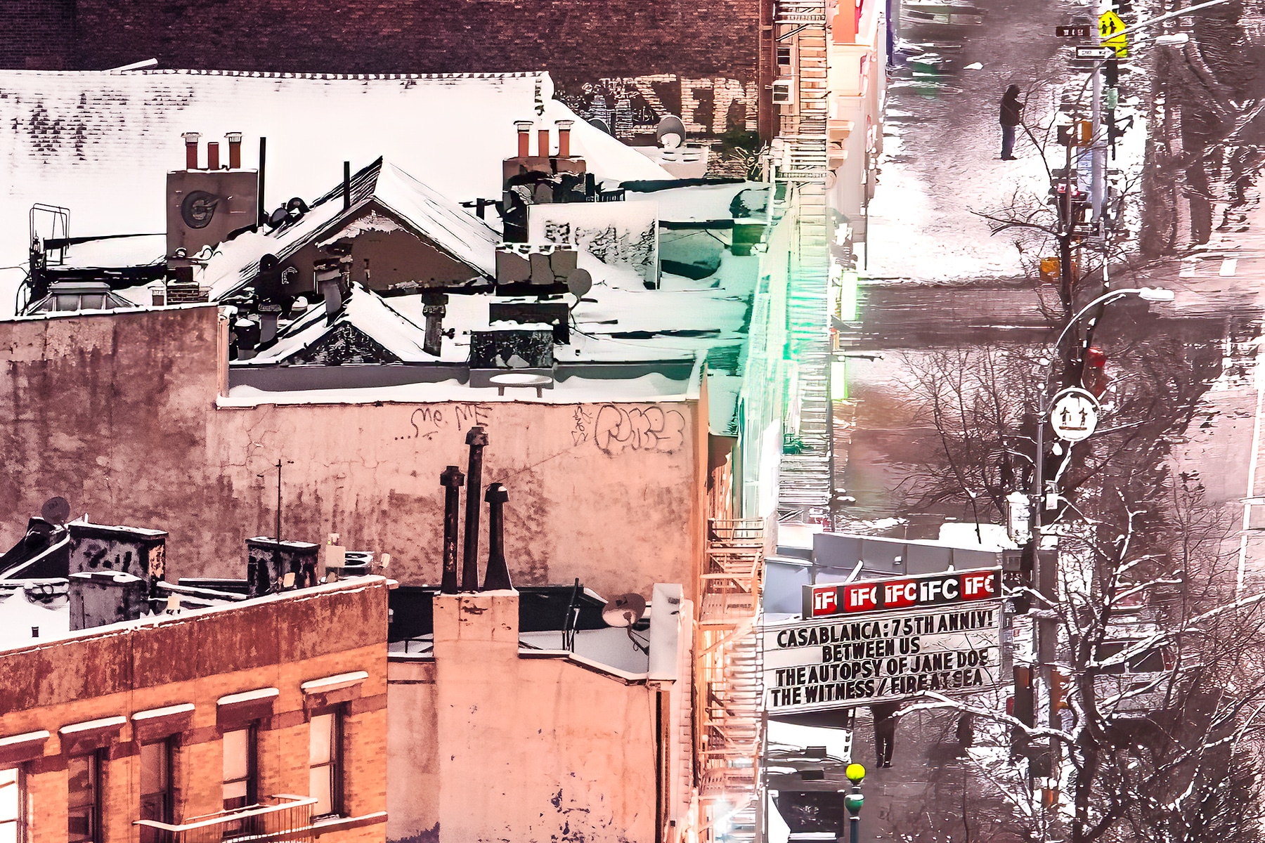 The sky began to illuminate with the faint glow of the swiftly oncoming sunrise and so I started shooting the regions of the image to be used for the center and right sections of the final photo. The sky grew brighter with each passing minute, casting the entire city in a heavenly light. Complementing this were the typically-drab rooftops that were now now shining with their thick coats of bright white snow. A handful of cars meandered up 6th avenue, some early-risers strolled down the West Village's sidewalks, and plumes of steam danced from faraway rooftops. The storm had quieted some of the usual activity, so the city was even more peaceful than it normally is on a Sunday morning.