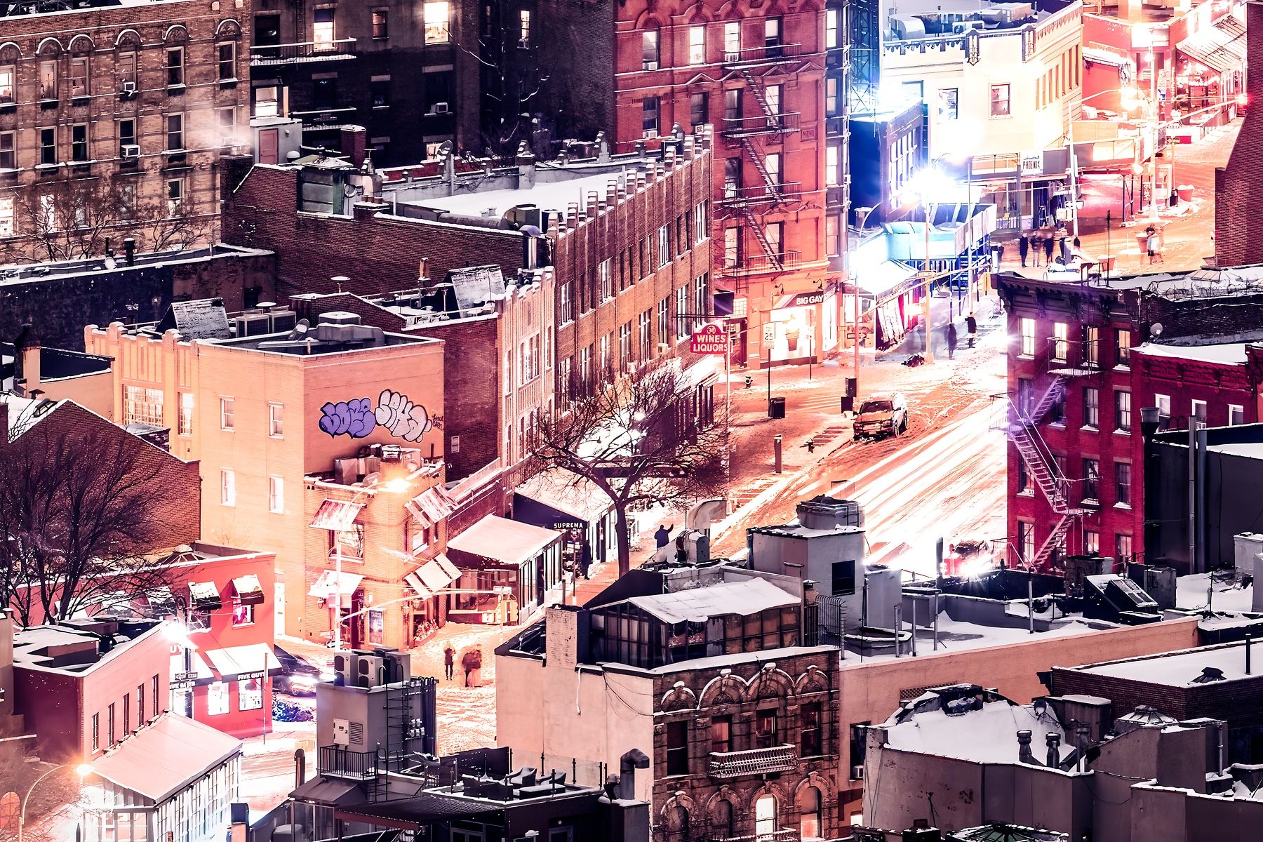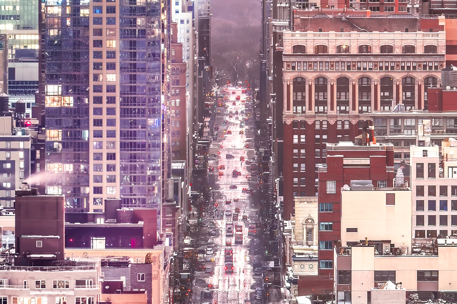 Reveling in the scene, I began exposing the long-exposure images that make up the left-side nighttime portions of the final photo. The fervor of cars racing up the avenues into the heart of the city rendered a beautiful glow on the buildings. Over the course of two hours, I meticulously recorded every last high resolution detail of this nighttime winter wonderland using a long telephoto lens mounted on my Canon 5Ds which I rotated using an extremely precise gimbal.