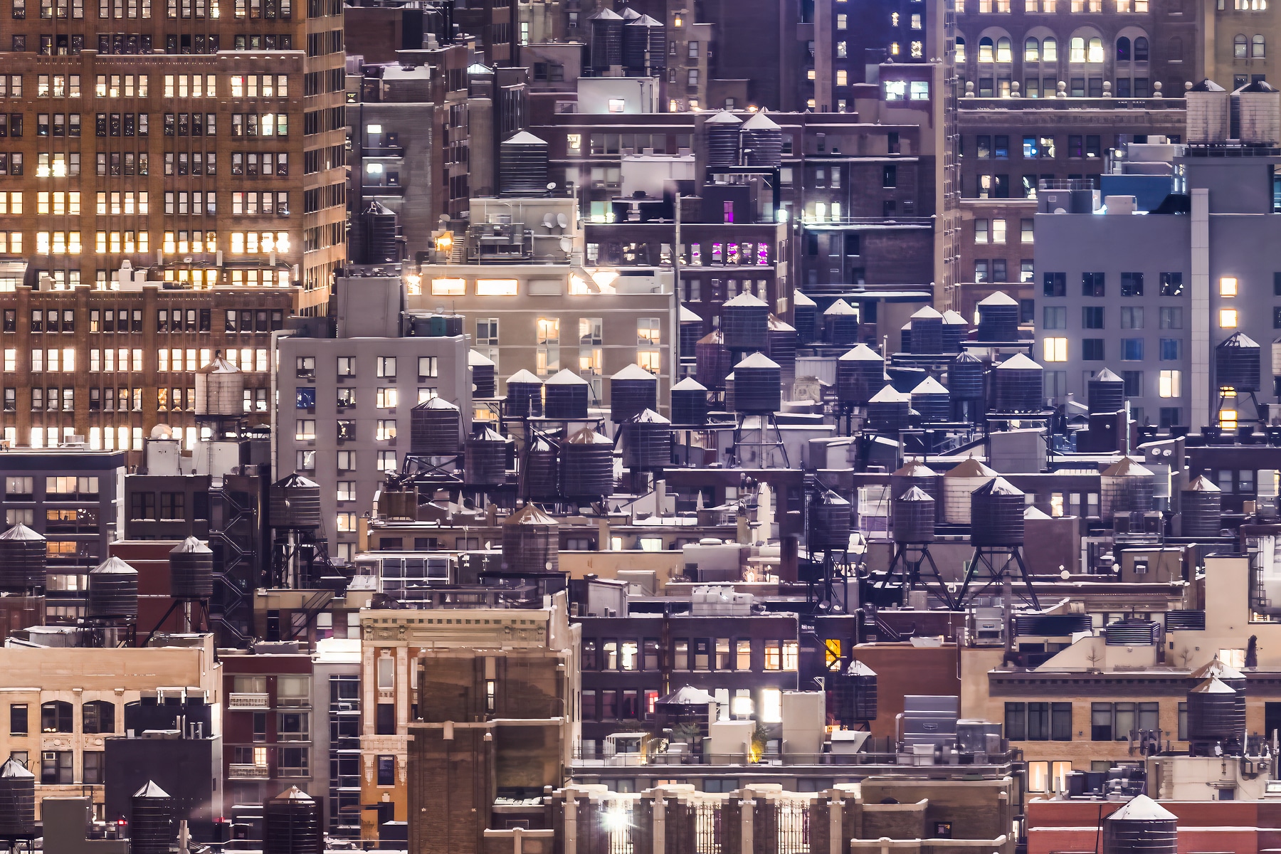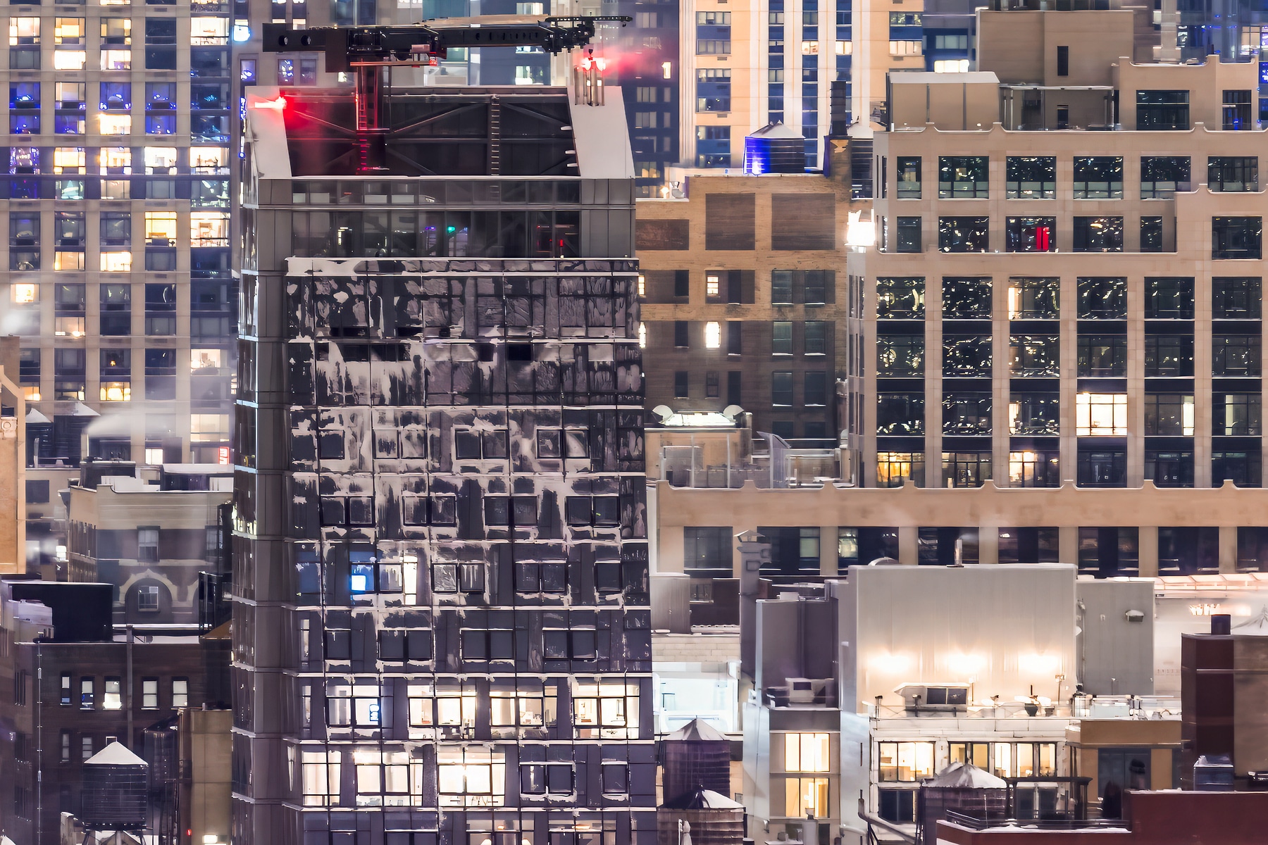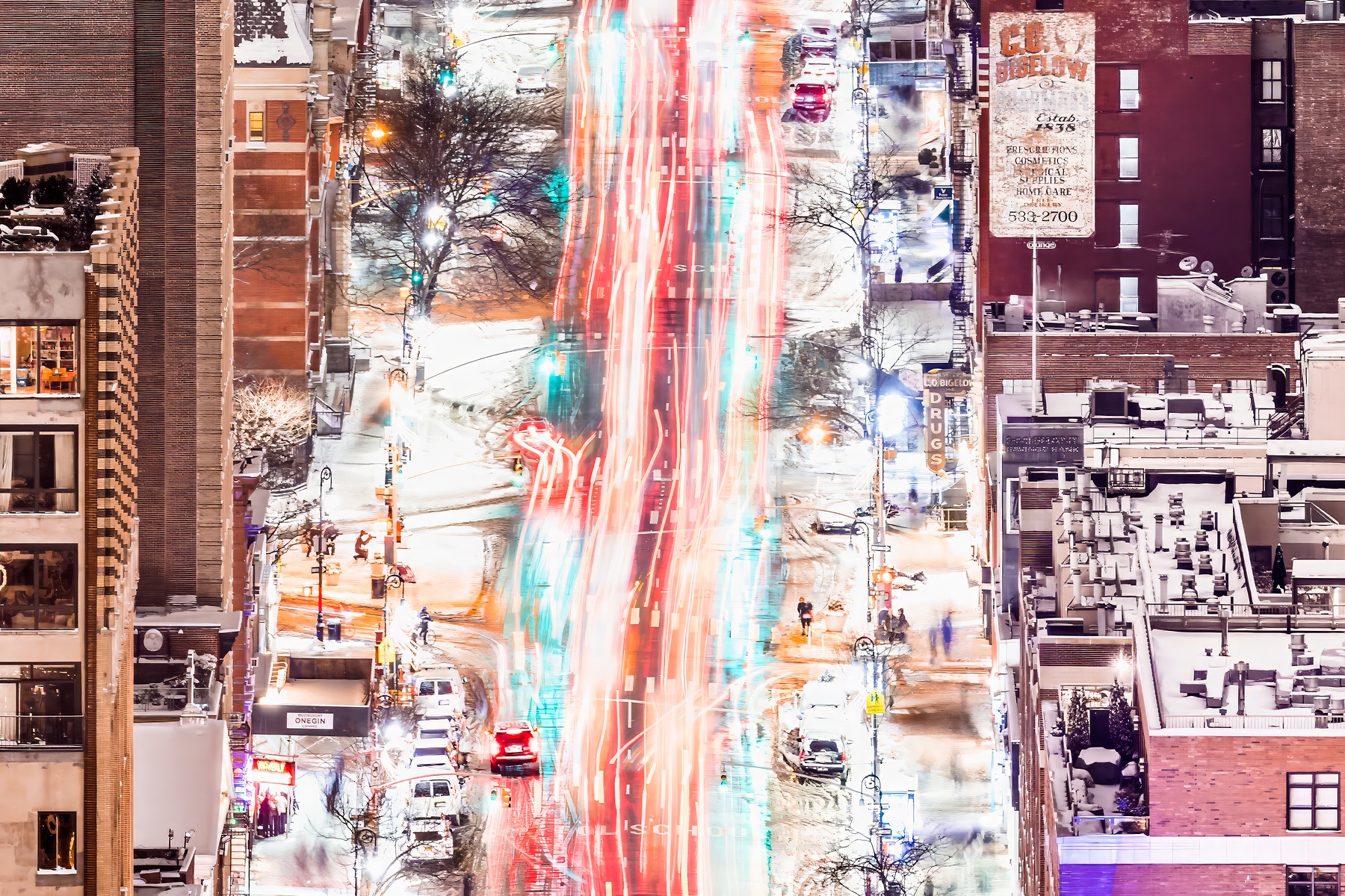The clarity of this VAST photo cannot be overstated. Buildings nearly a dozen miles away are clearly visible. Tiny details such as footprint patterns in snow-covered parks are easily discernible. Fascinating rooftop structures covered in snow drifts are revealed in striking resolution. Groups of friends out for a night on the town fill the sidewalks. The diverse characters of famous New York neighborhoods like the West Village, Chelsea, SoHo, and Gramercy can be palpably felt. And facades of numerous architectural masterpieces such as the Empire State Building are exquisitely rendered.