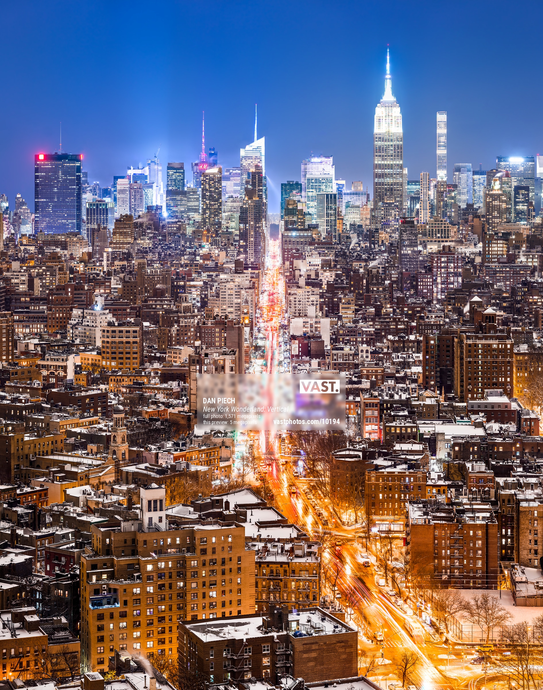 Giddy with excitement and reveling in the scene, I began exposing the 67 long-exposure images that make up this VAST photo. The fervor of cars racing up 6th avenue into the heart of the city continued uninterrupted during the two hours it took to meticulously record every last high resolution detail of this urban winter wonderland. In the weeks that followed, I spent over one hundred hours polishing and assembling the individual photos into this final VAST photo.