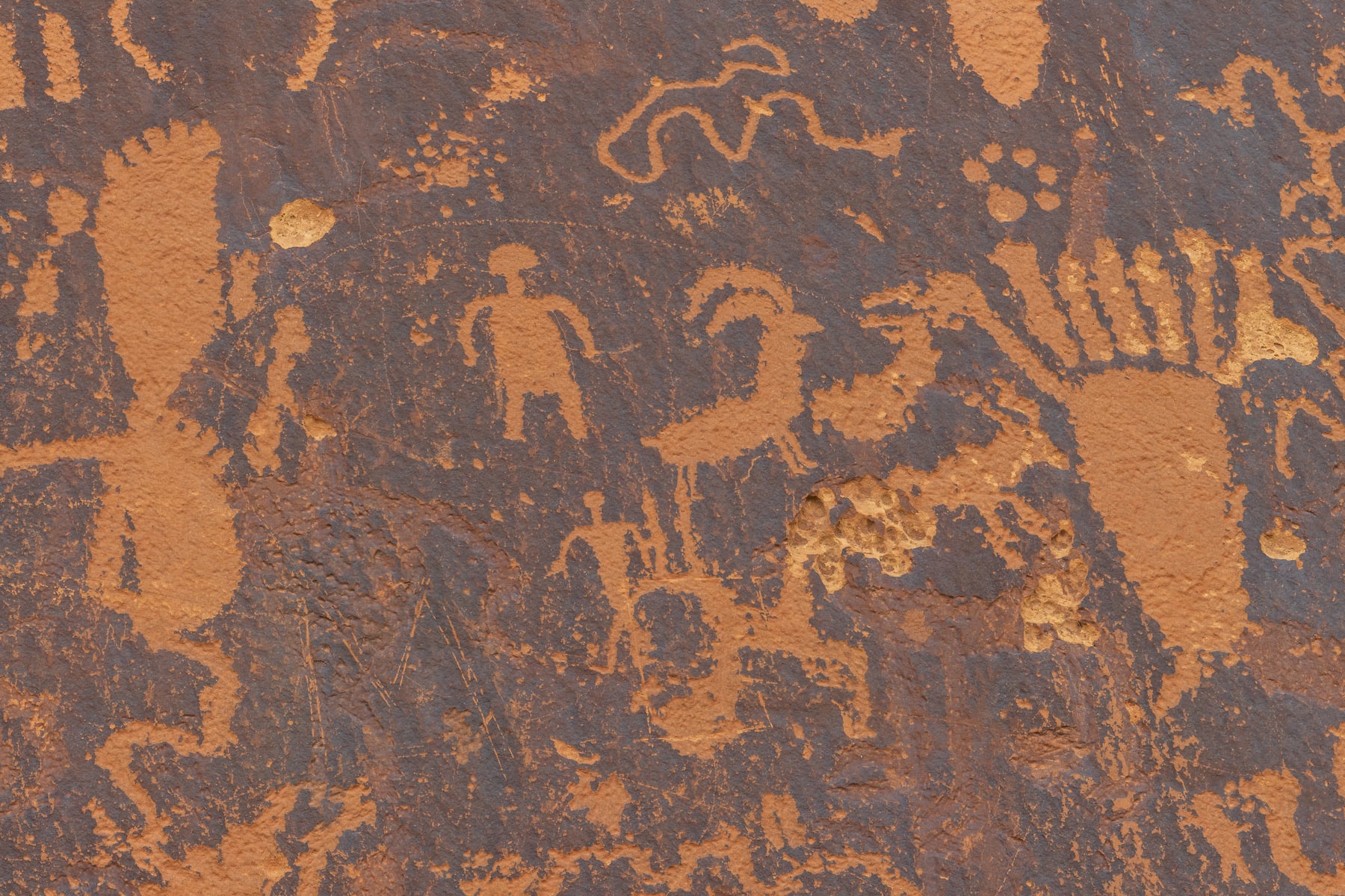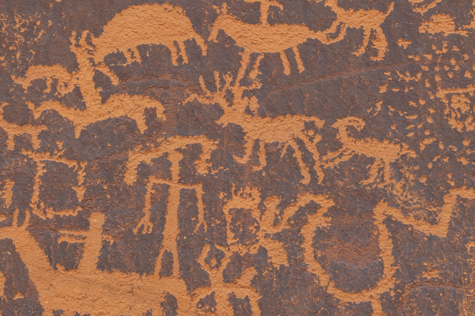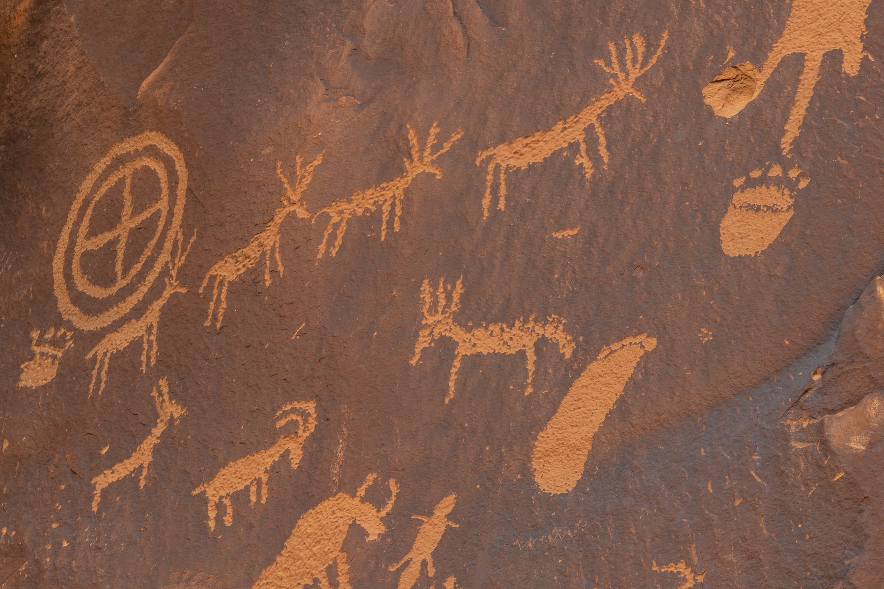 Newspaper Rock is perched just above the banks of Indian Creek on the eastern edge of the Bears Ears National monument, a large flat rock panel tucked under a small overhang preserves the stories of people who lived in and passed through this area for the past five centuries. Long recognized as a special place to multiple cultures, Newspaper Rock is among the first sites listed on the National Register of Historic Places in this region. The images at Newspaper Rock include animal pelts, figures of riding horses, and broad-shouldered figures with elaborate head decorations. Close examination will reveal numerous images of feet with six toes. Paw and foot prints are in evidence throughout the panel. Many animals are represented including dear, elk, bison and bighorn sheep. One of the images appears to be a rider shooting an arrow at an elk or deer. One of my goals of shooting this image is to create a ultra high resolution image of the location to preserve it for future generations.