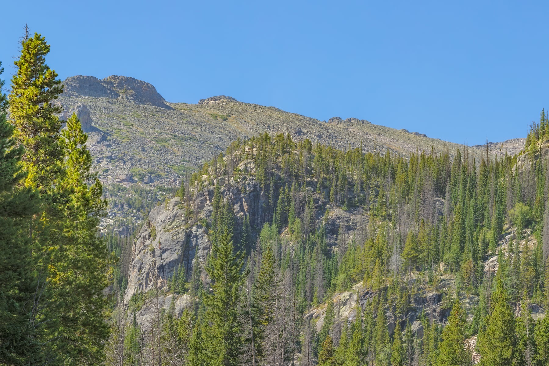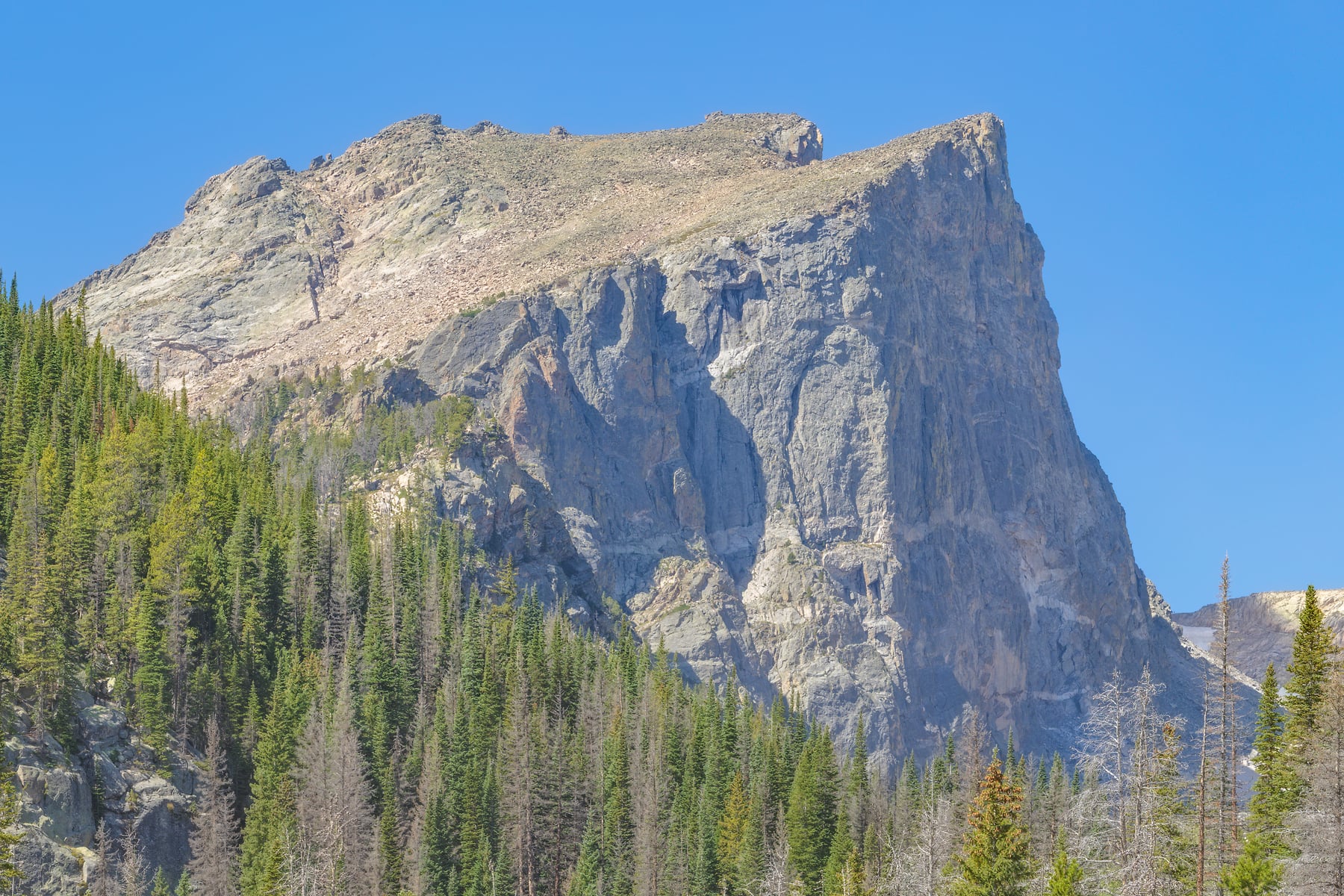 Hallett Peak is visible above Nymph Lake. Famous for the numerous yellow blossoms of the lily pads that cover its surface in Summer. Unfortunately , when I was there the lily pads had finished their annual bloom. Nymph Lake is one of the most popular short trails in the Rocky Mountain National Park (RMNP). It’s an easy 1/2 mile hike with only 236 feet of elevation gain from the Bear Lake Trailhead to Nymph lake. Most hikers will want to make the journey beyond Nymph to Dream and Emerald Lakes.