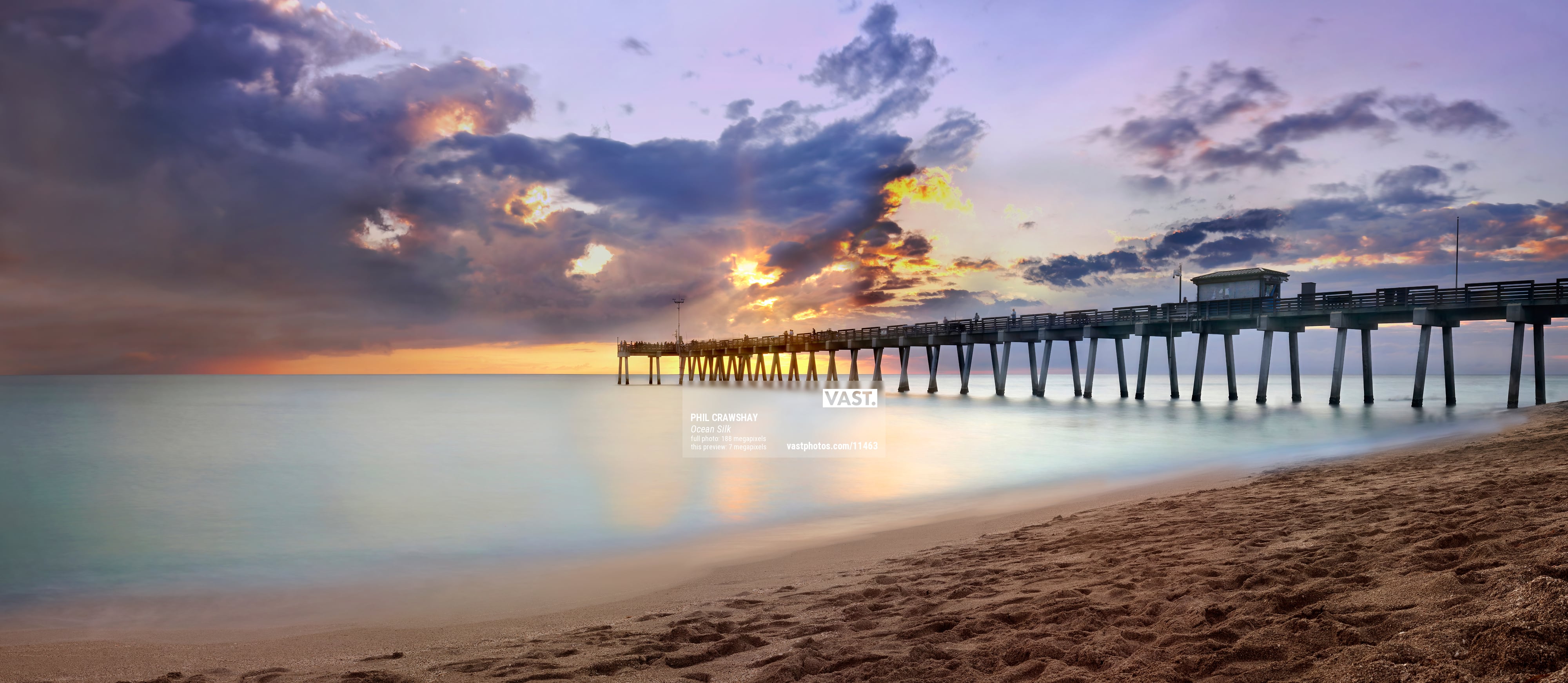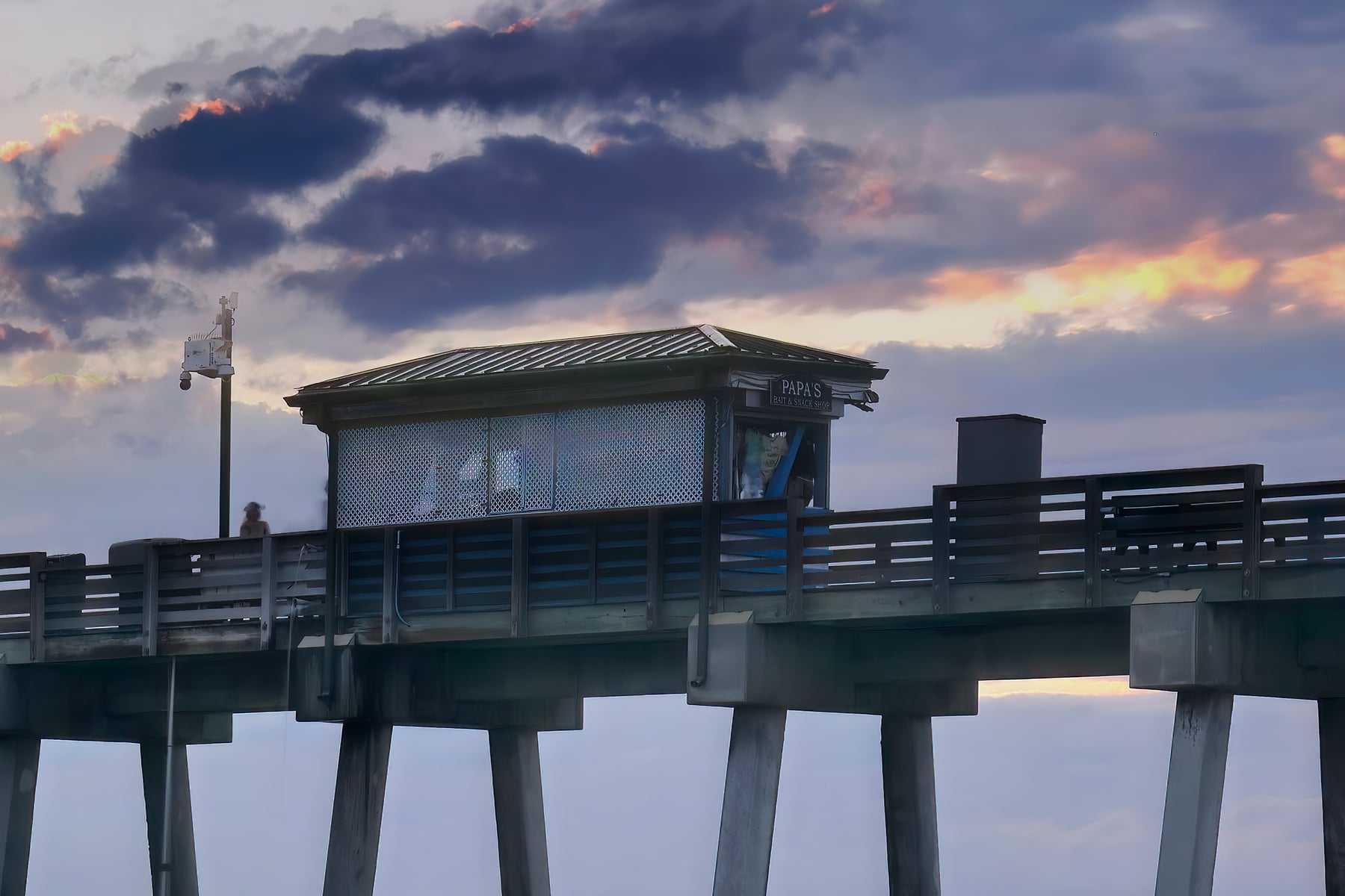 Taken as a very long exposure sequence which provided it's own set of unique challenges. The hardest part was that sundown and sunset rarely last long enough to complete a sequence of shots like this so timing the shot is of critical importance. The end result is one that shows the ocean water as completely smooth which creates a very calming scene. The serenity is also enhanced by the wonderful color of the sky with the sun rays poking through the clouds at the end of the long pier.