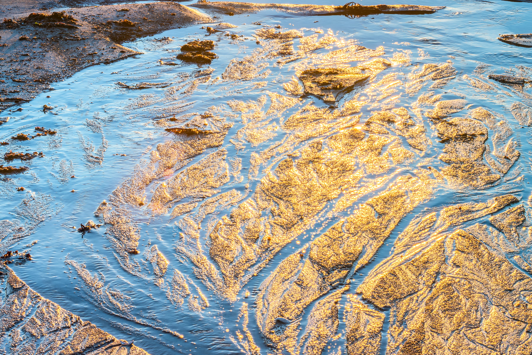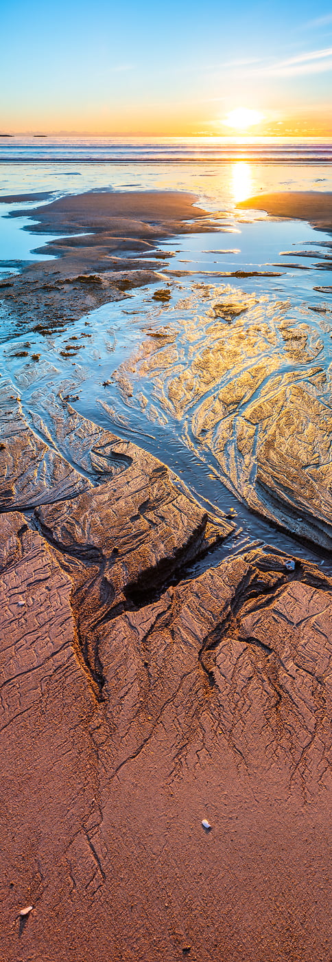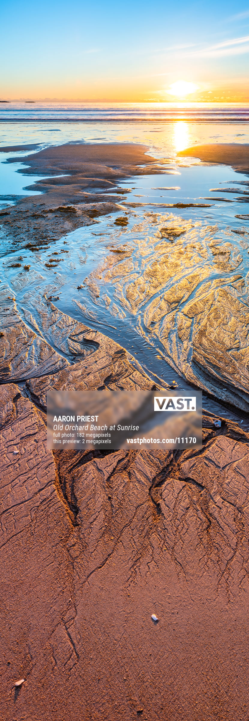 This is a vertorama of sunrise at Old Orchard Beach in Portland, Maine on December 8, 2018, 07:13. Low tide was a couple hours earlier and it was about 9°F. There is a little bit of sea smoke behind the waves in the distance. The intricate patterns in the sand were mesmerizing.
