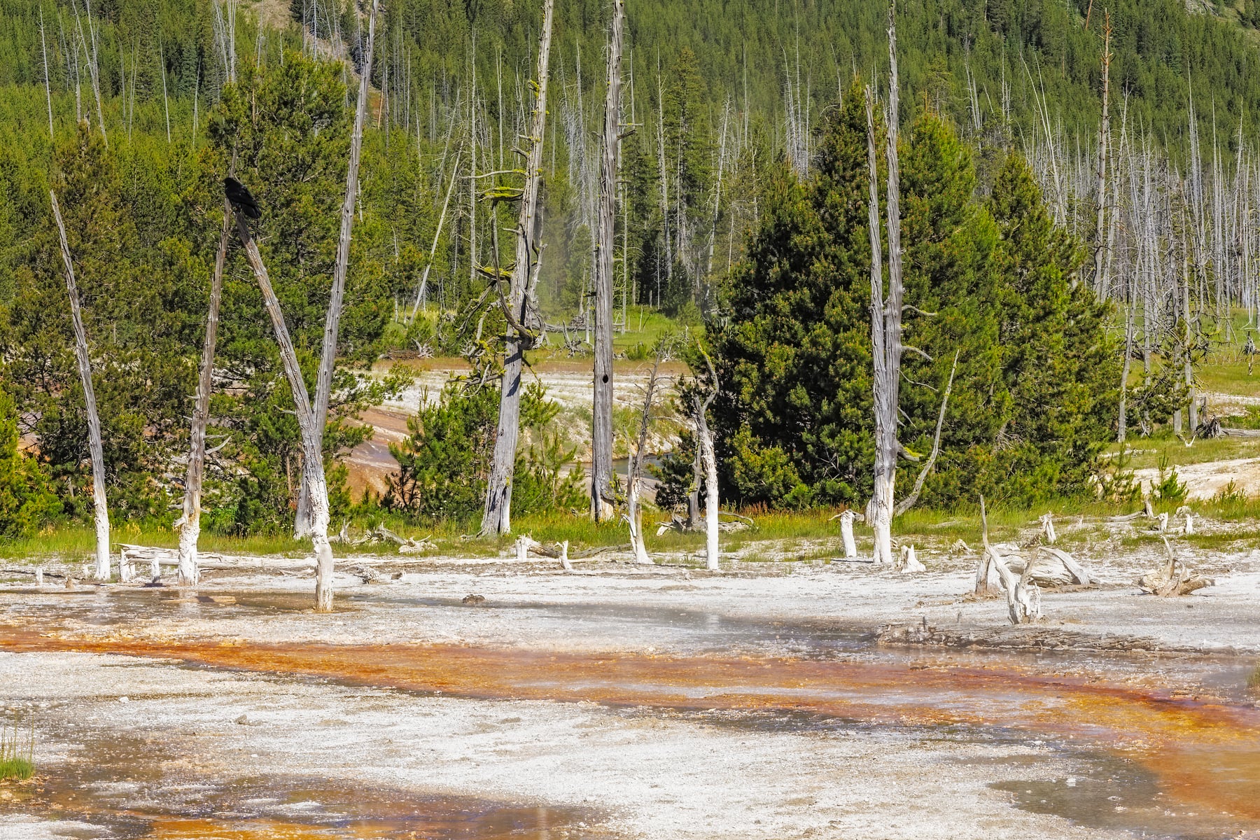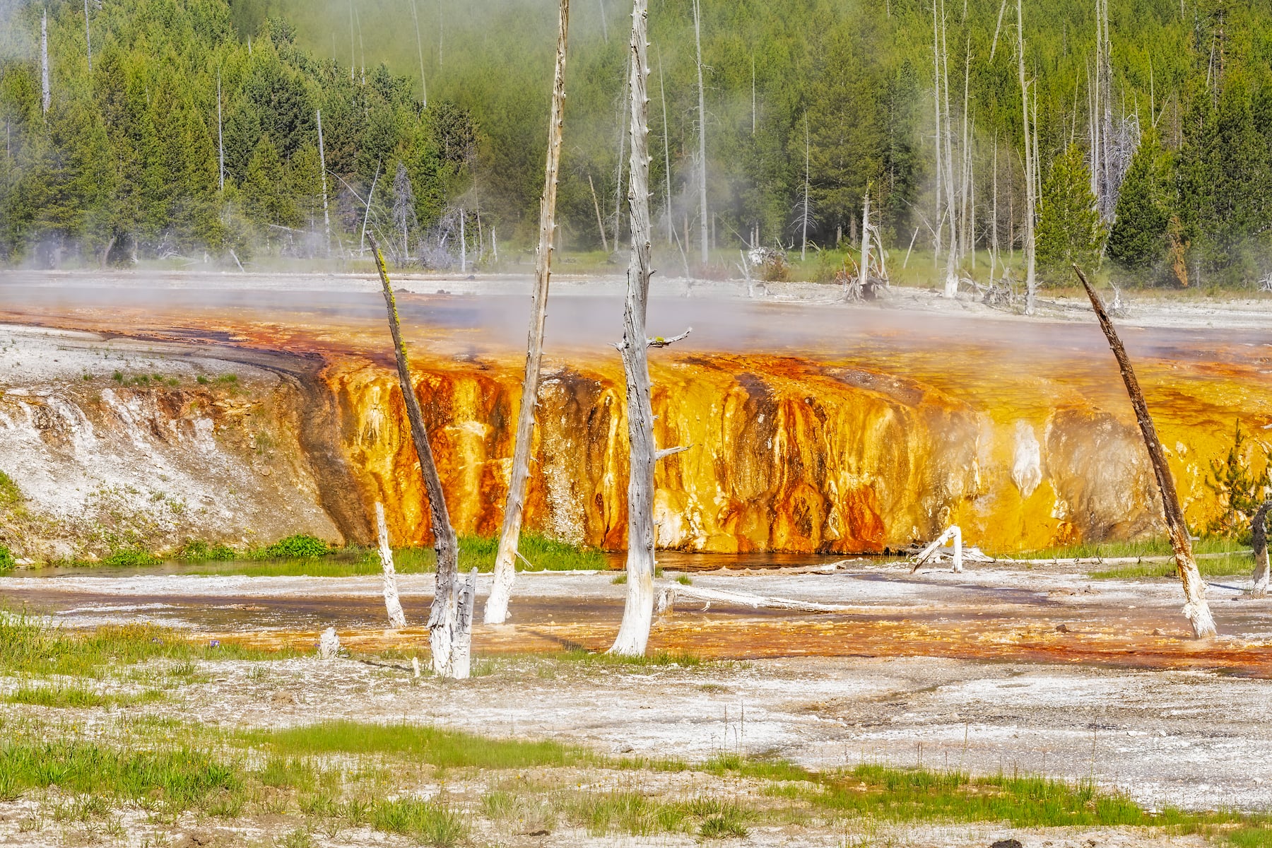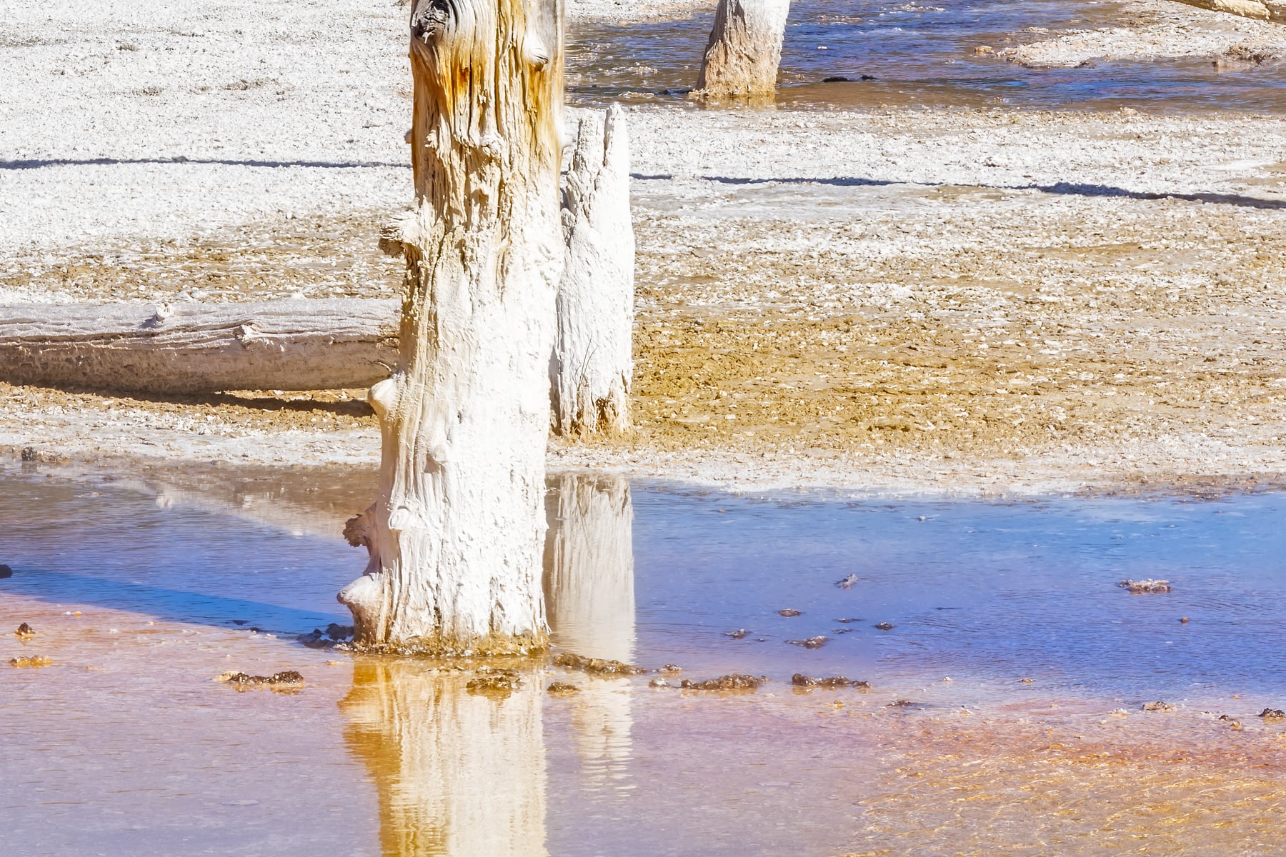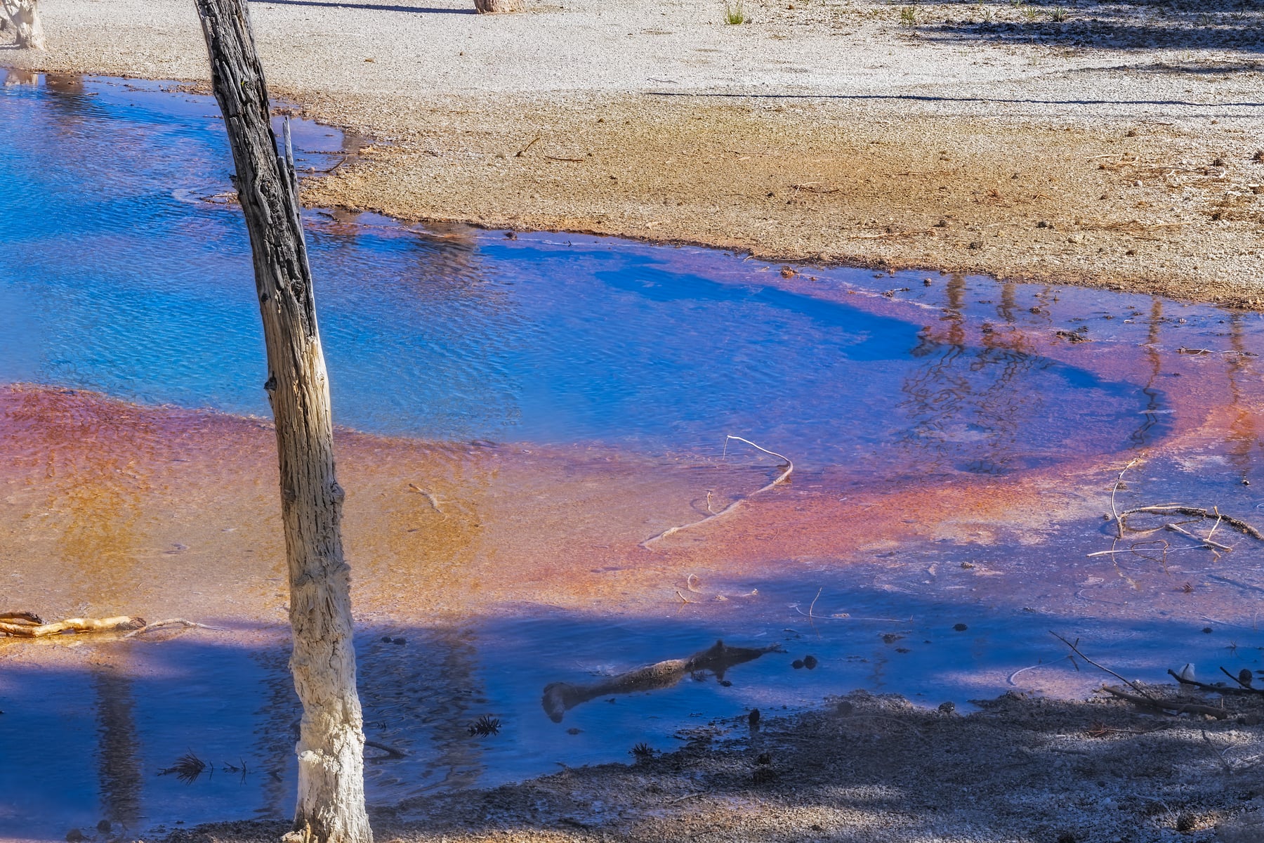 The Opalescent Pool is not an active hot spring but rather is fed by Spouter Geyser up stream from it. Thus the water is cooler at around 144°F and different bacteria grow in the pool resulting in it’s unique colors. Dead trees with silica-solidified bases surround the pool and stand in the runoff.