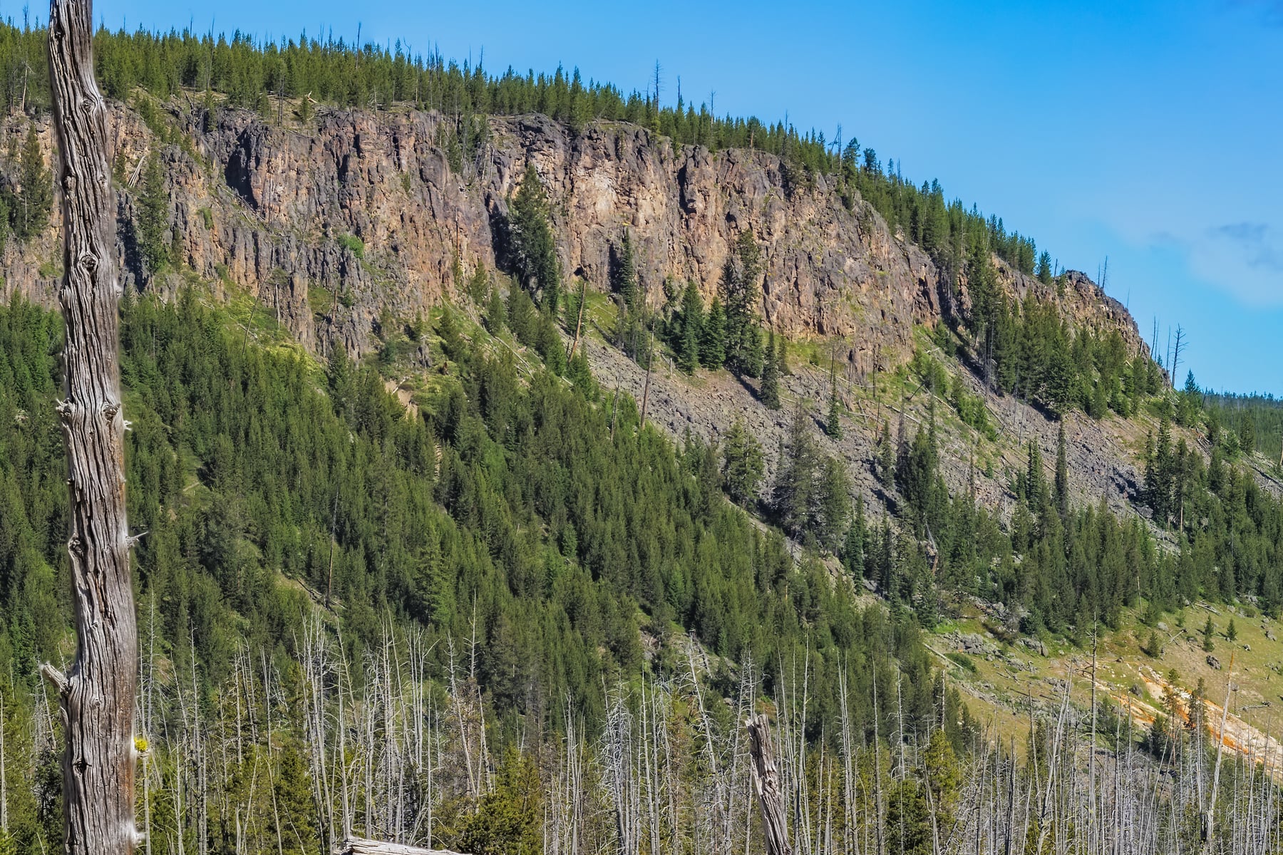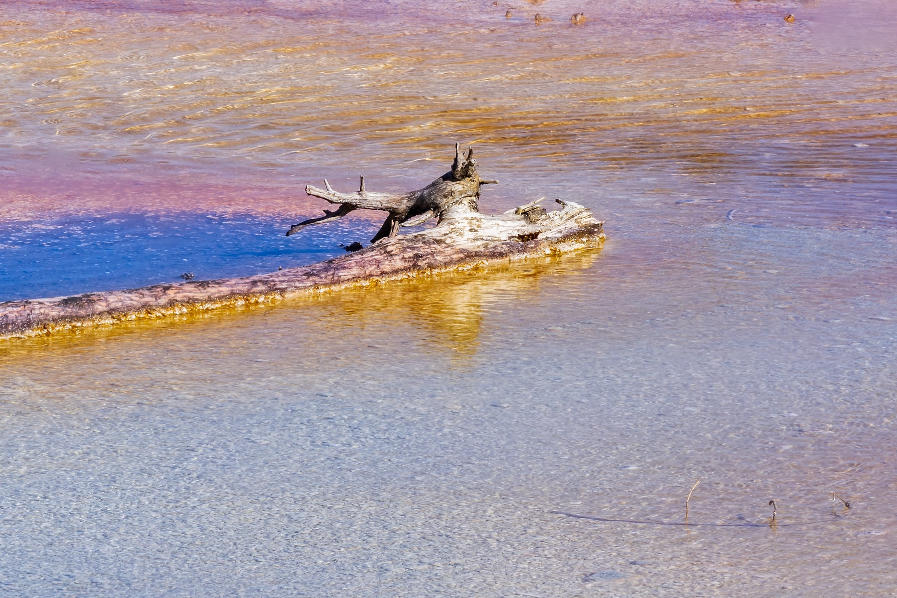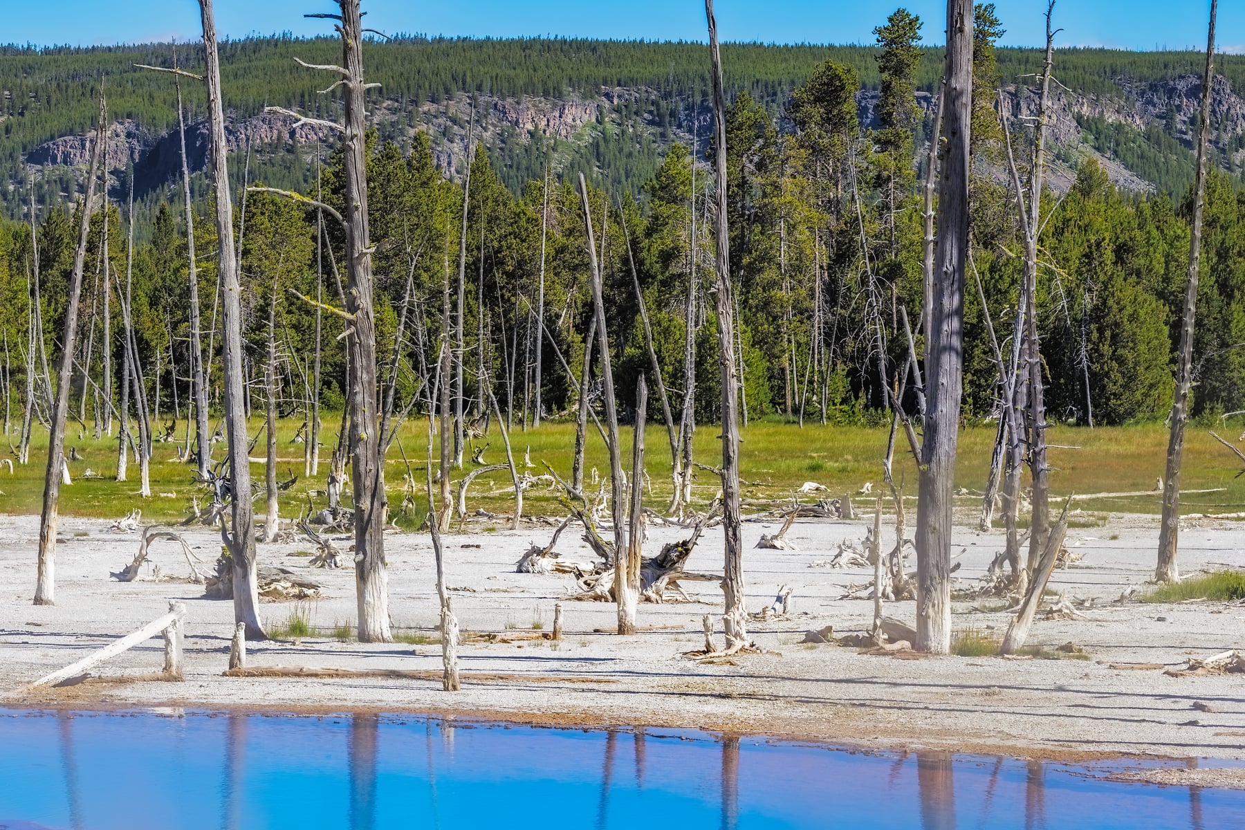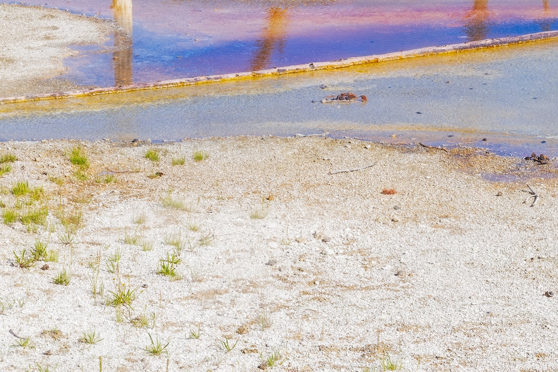 The Opalescent Pool is not an active hot spring but rather is fed by Spouter Geyser up stream from it. Thus the water is cooler at around 144°F and different bacteria grow in the pool resulting in it’s unique colors. Dead trees with silica-solidified bases surround the pool and stand in the runoff.