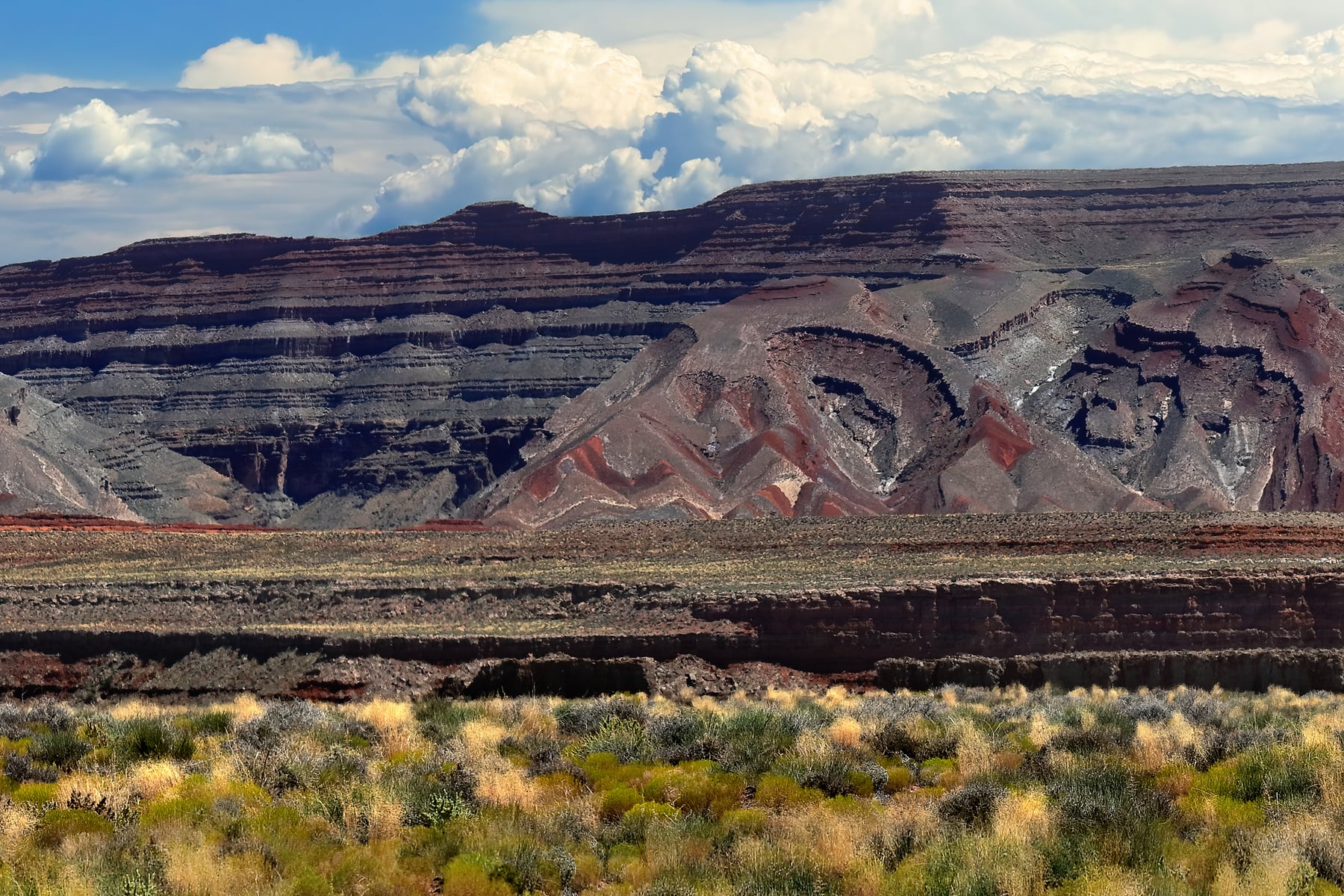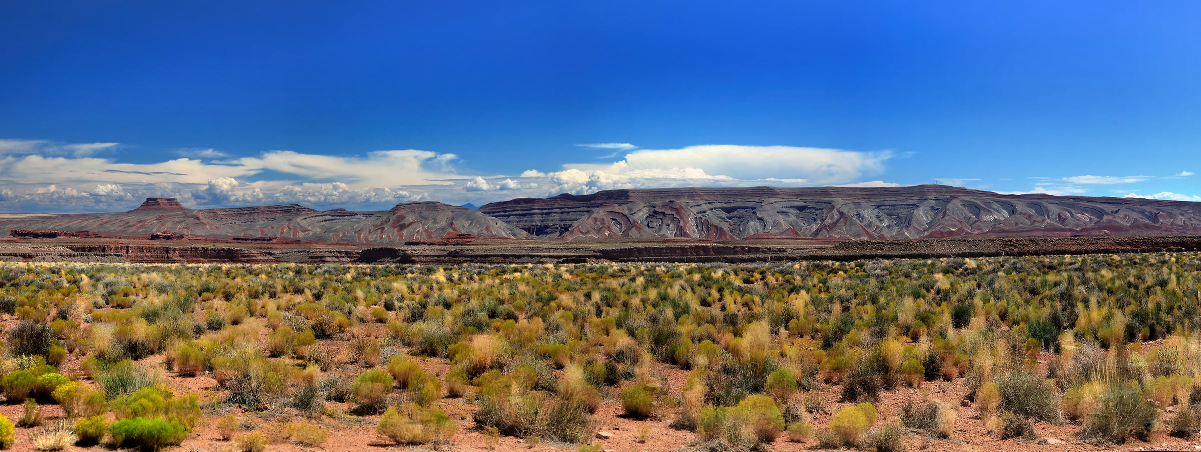 A panoramic photograph taken from Goosenecks State Park in Utah, looking out across a rugged desert foreground toward distant hills that appear naturally painted in soft bands of color. The textured terrain in the foreground features rocky outcrops, dry soil, and hardy desert plants that thrive in this harsh environment, adding contrast and depth to the wide, open scene.