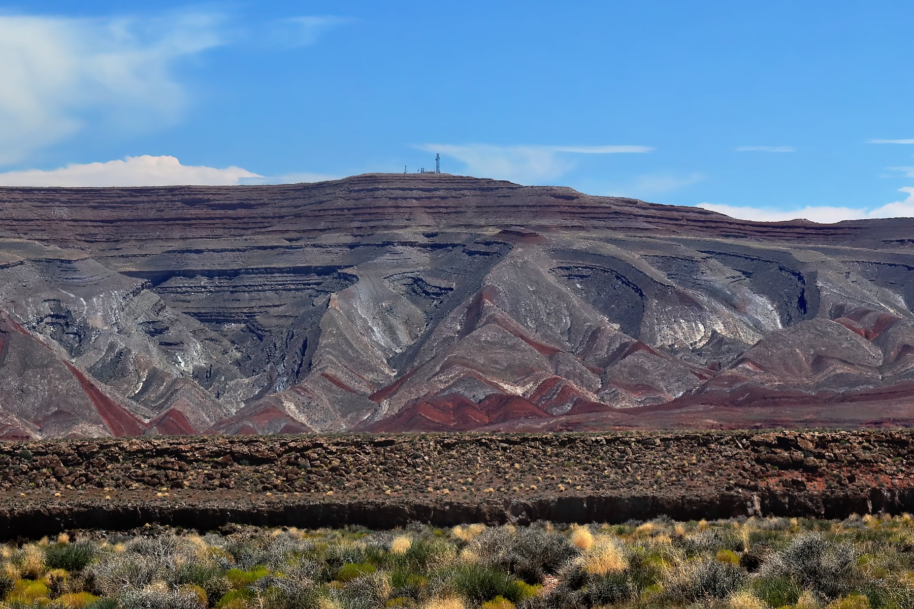 In the distance, layered hills stretch across the horizon, their soft reds, yellows, and earthy tones resembling the iconic Painted Hills, though viewed here from a unique vantage point. Overhead, a clear blue sky with scattered low clouds adds balance and brightness to the composition.
