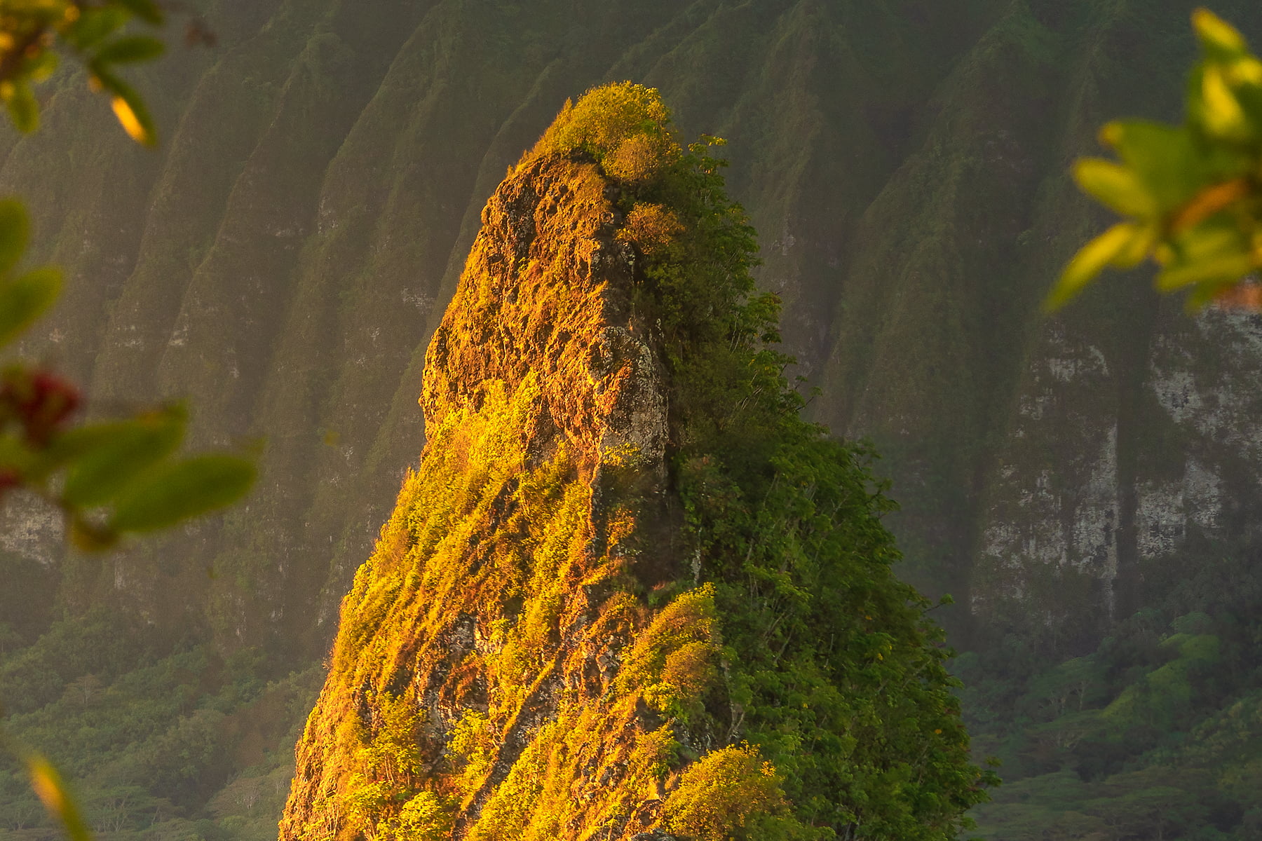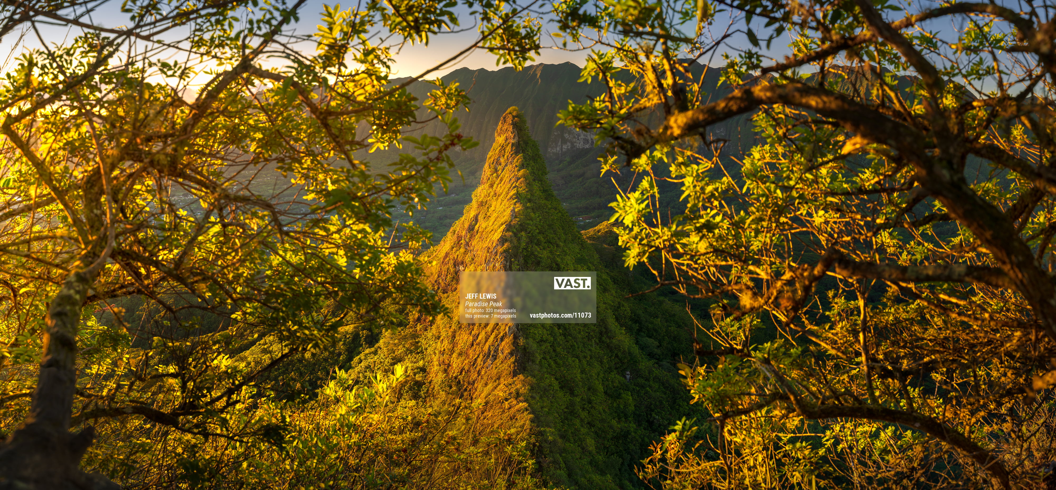 I also captured more "open" vistas this morning, but this perfect tree frame was my favorite. It was a rare, remarkably clear morning, with all the mountains fully visible, and powerful golden sunlight illuminating every leaf and hillside. This VAST photo showcases every detail on this particularly dramatic mountain peak, with a couple of the local neighborhoods below visible between the tree branches. What a view!