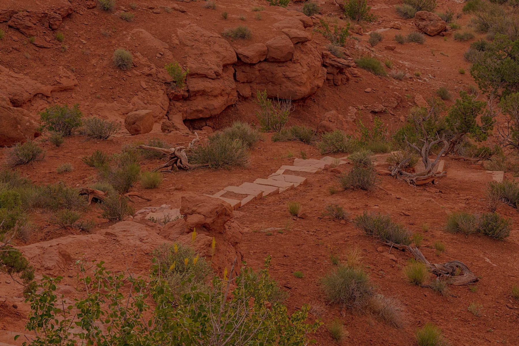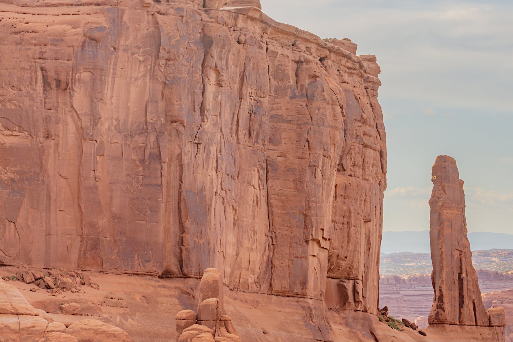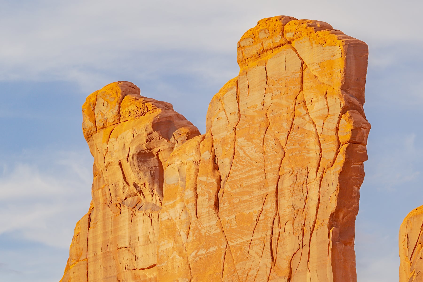 In this scene you see a trio of three walking down the trail that descends steeply into a spectacular canyon and continues to Courthouse Towers. Early on you will pass beneath a formation called Queen Nefertiti, a sculpted rock formation atop the west wall that looks like the profile of an Egyptian Queen. Sheer cliffs capped with fins soar above the east side of the canyon. As you progress through the wash views open to Argon Tower, a 270-ft. tower at the end of the west wall, and the Organ, rising above the east side of the Scenic Drive. Near the end of the hike the Three Gossips, a striking 350-ft tall tower with three summits sitting atop a sandstone pedestal, joins the scene