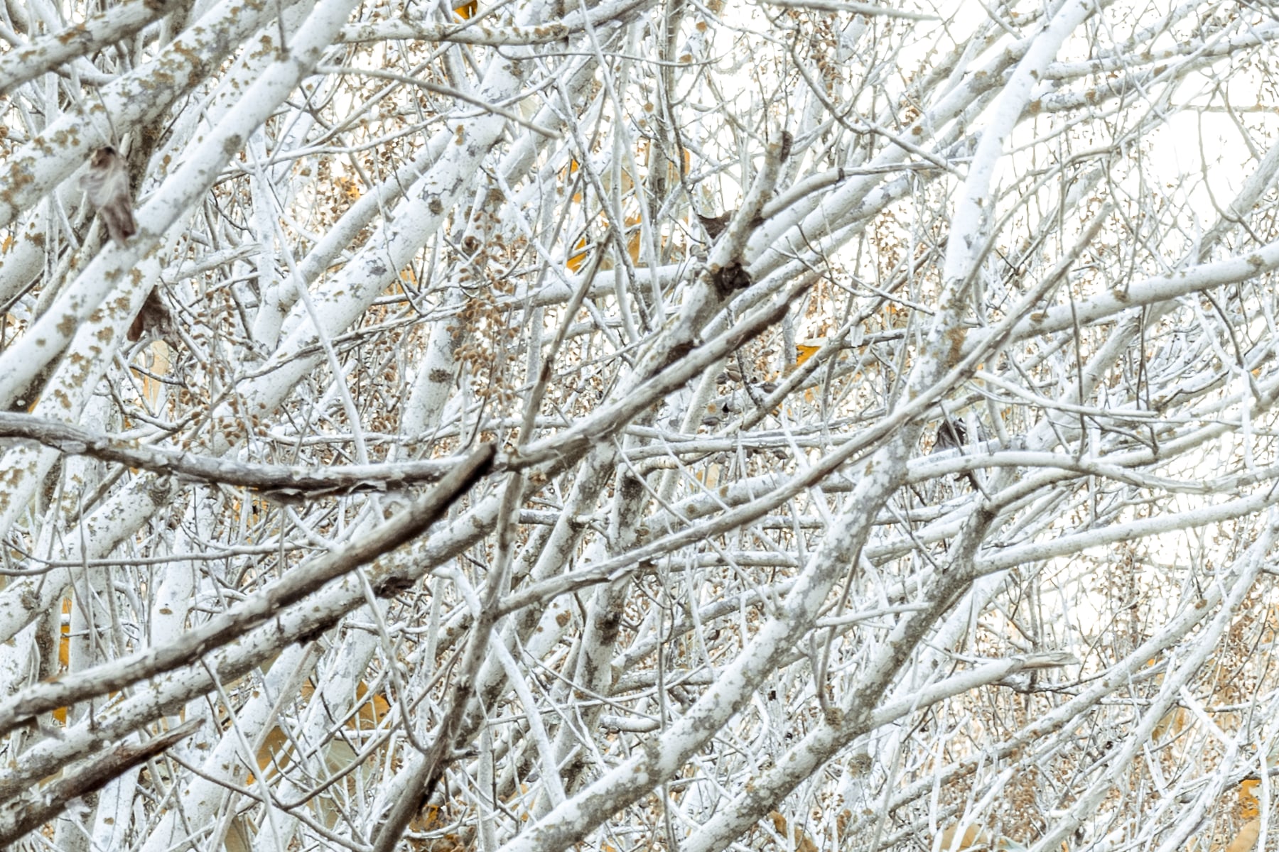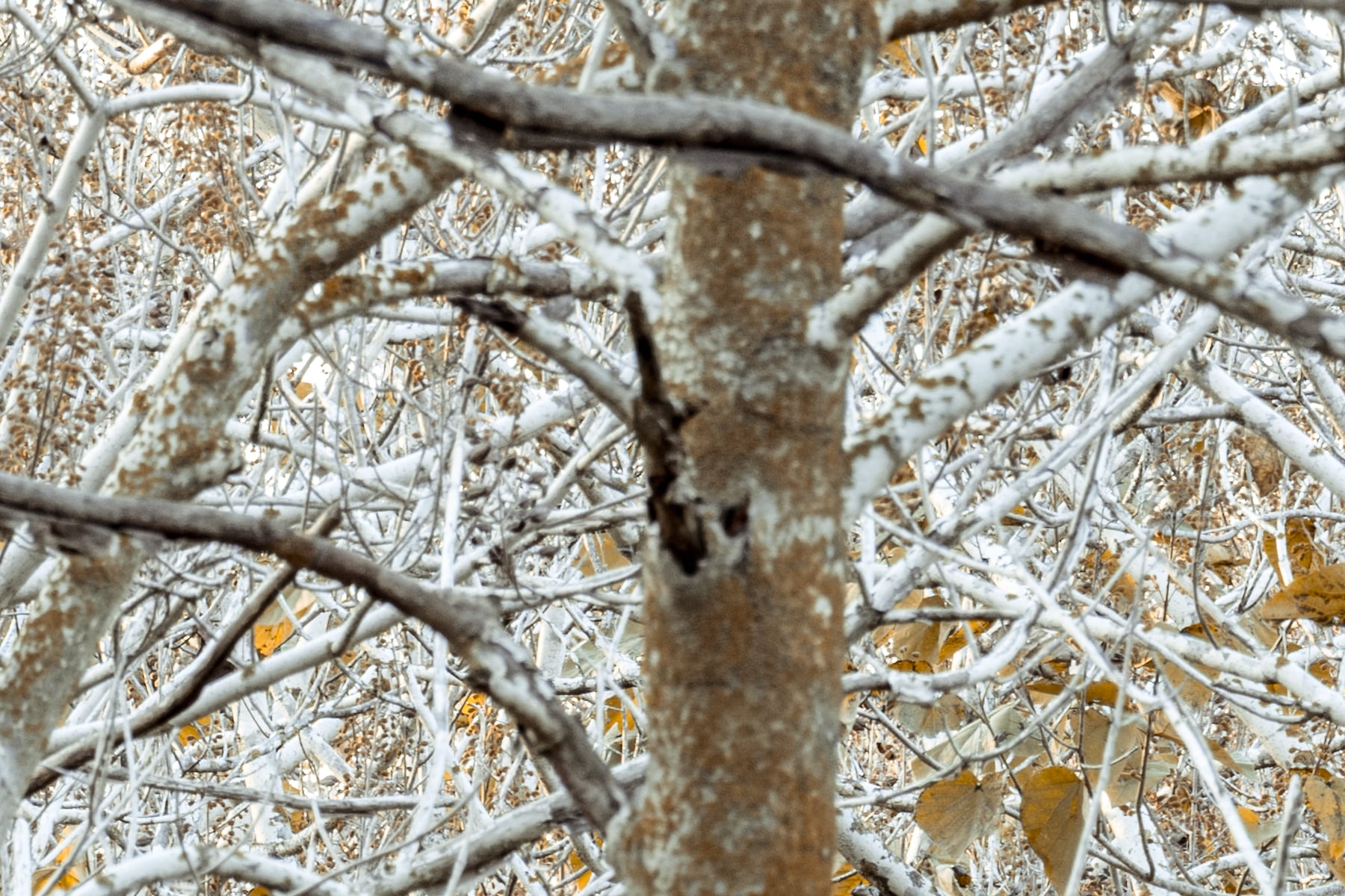 The depth and perspective in this image make it feel immersive, as if stepping into a peaceful, frozen dreamland. The delicate interplay of light and shadow emphasizes the textures of the trees and leaves, creating a sense of quiet stillness. Despite the wintry appearance, the subtle warmth of the golden foliage hints at the lingering essence of autumn, blending two seasons in a single, breathtaking moment.