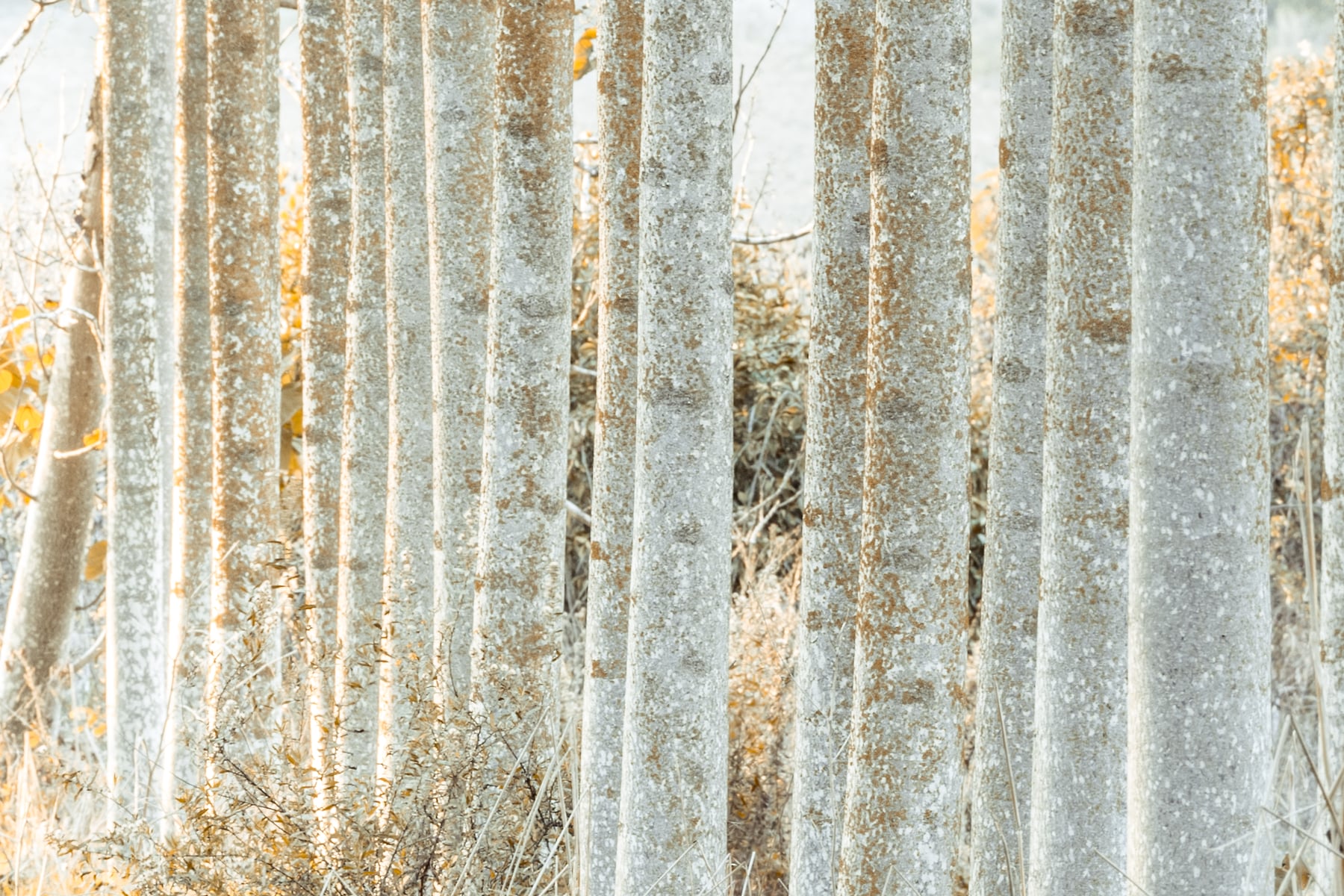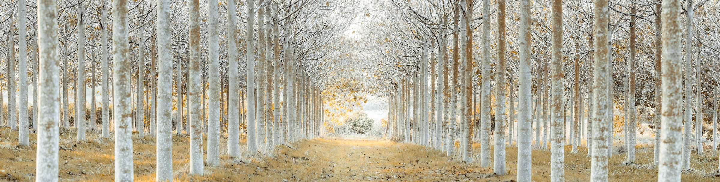 This stunning winter forest scene showcases a mesmerizing pathway lined with tall, frost-covered trees standing in perfect symmetry. The pale trunks, dusted with frost, create a tunnel-like effect, drawing the eye towards a glowing light at the end of the path. The ground is covered with a delicate layer of fallen leaves, their golden hues providing a striking contrast to the silvery-white tones of the trees. The soft, diffused light filtering through the branches adds an ethereal glow, enhancing the serene and almost otherworldly atmosphere of this tranquil woodland.