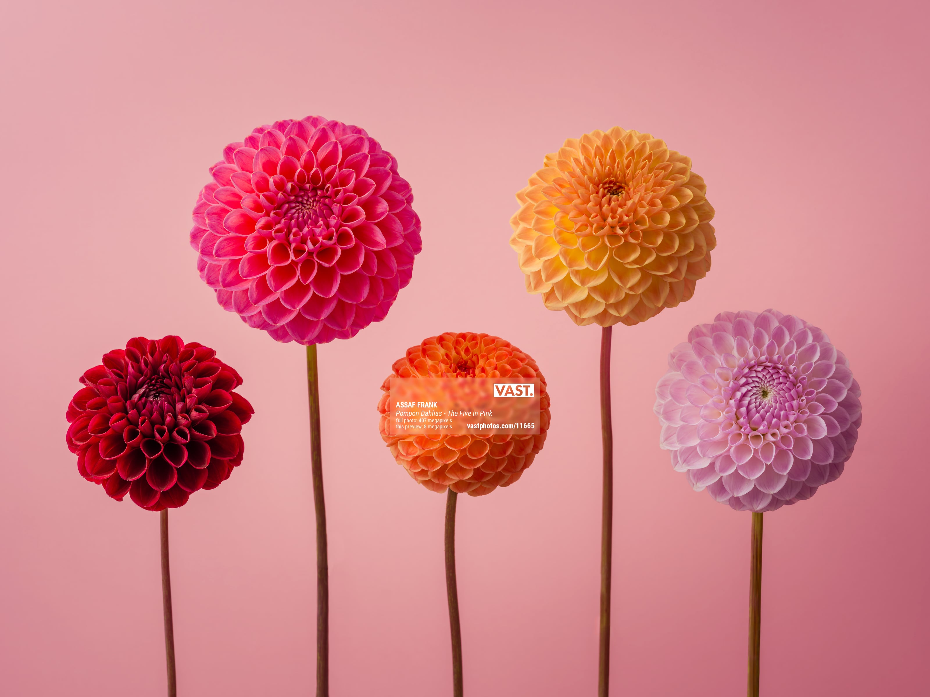 Set against a delicate pink canvas, five pompon dahlias come alive in a mesmerizing array of colours. Arranged in a thoughtful configuration — two poised above and three below — they create a visual spectrum reminiscent of a rainbow. Each dahlia, distinct in its hue, contributes to a multicoloured masterpiece that celebrates diversity and unity simultaneously.