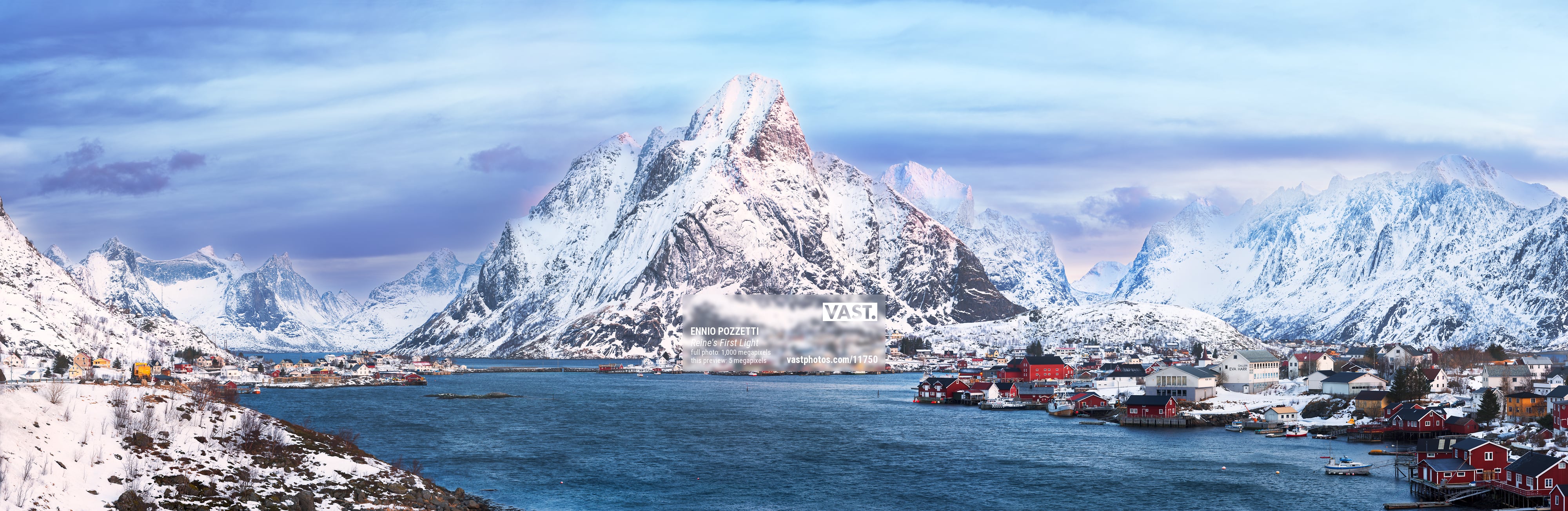 As the icy grip of dawn enveloped Reine in Lofoten, Norway, the landscape emerged in ethereal beauty. Captured in a giga panoramic image, this scene unfolds against a backdrop of snow-capped peaks illuminated by the delicate hues of the Arctic dawn.