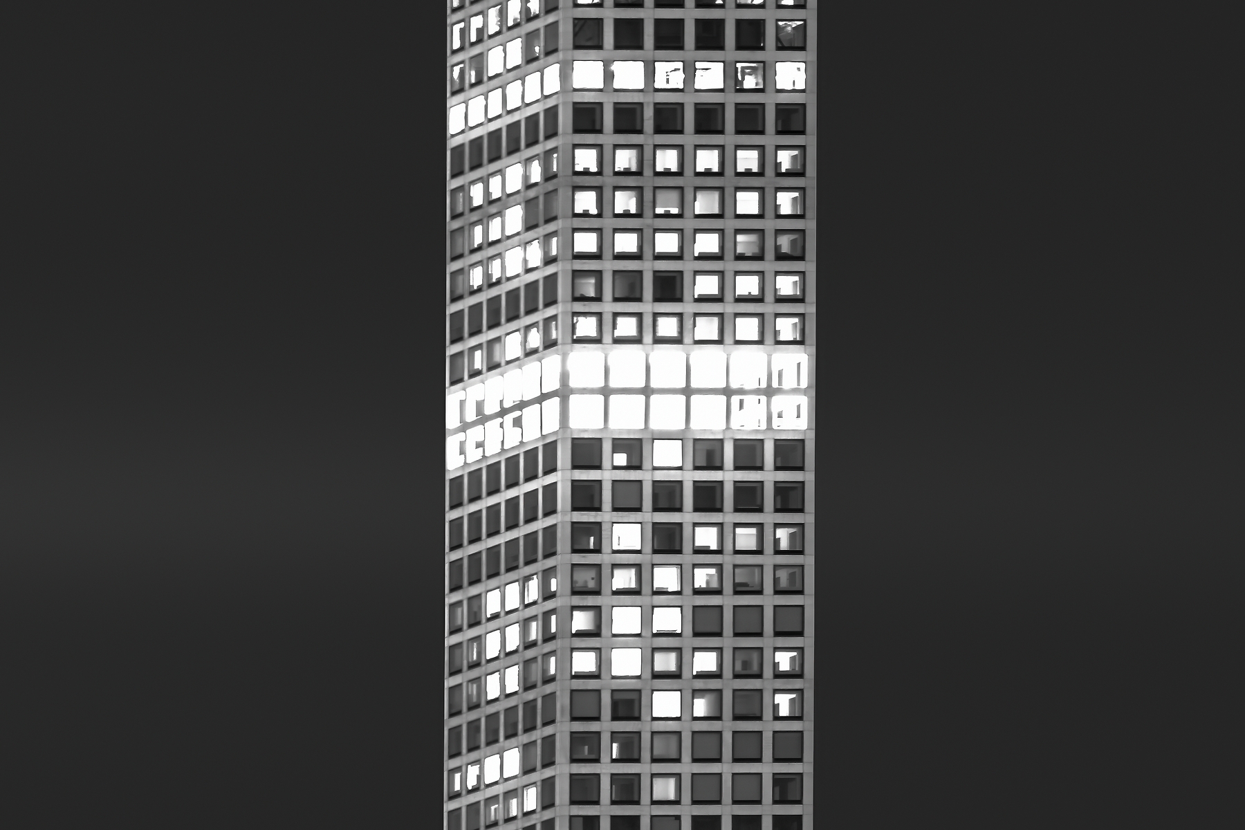 As midnight approached, the low-hanging cloud bank above Times Square glowed brightly from the festivities' pyrotechnics. A chorus of revelers counting down the last remaining seconds of the year could be heard in the distance. We kept shooting the long exposures used for this photo as the new years moment passed, the window lights began to turn off, and a light sprinkle of rain began to fall.