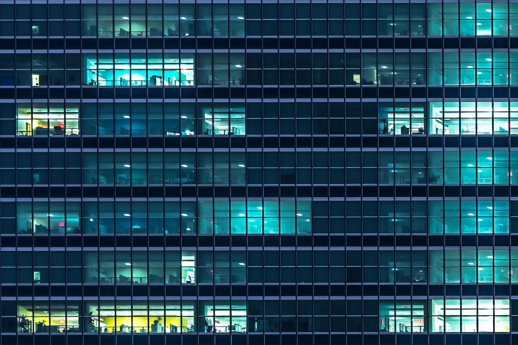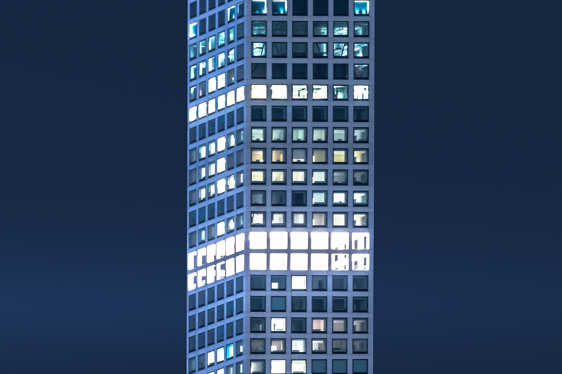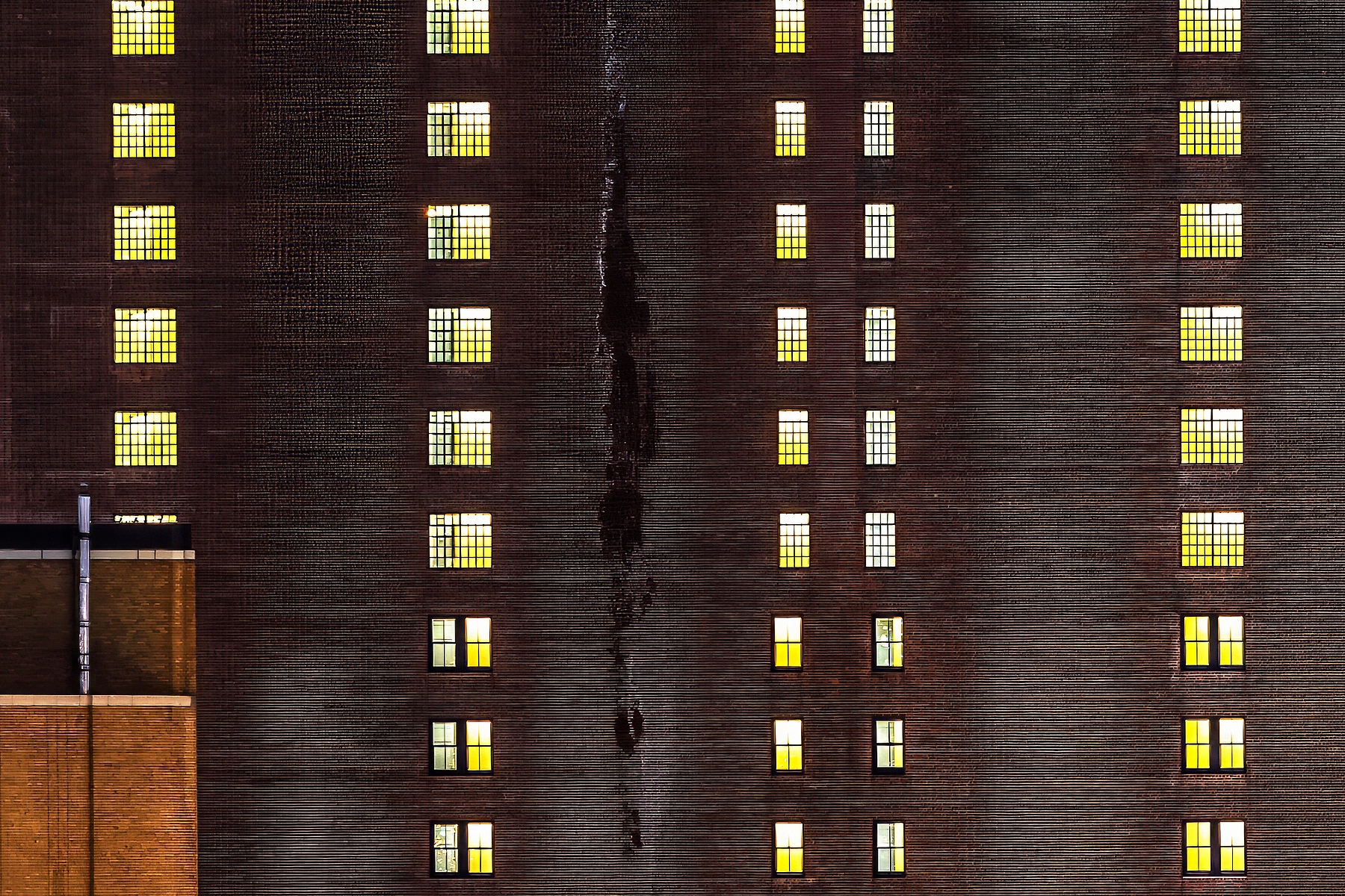 As midnight approached, the low-hanging cloud bank above Times Square glowed brightly from the festivities' pyrotechnics. A chorus of revelers counting down the last remaining seconds of the year could be heard in the distance. We kept shooting the long exposures used for this photo as the new years moment passed, the window lights began to turn off, and a light sprinkle of rain began to fall.