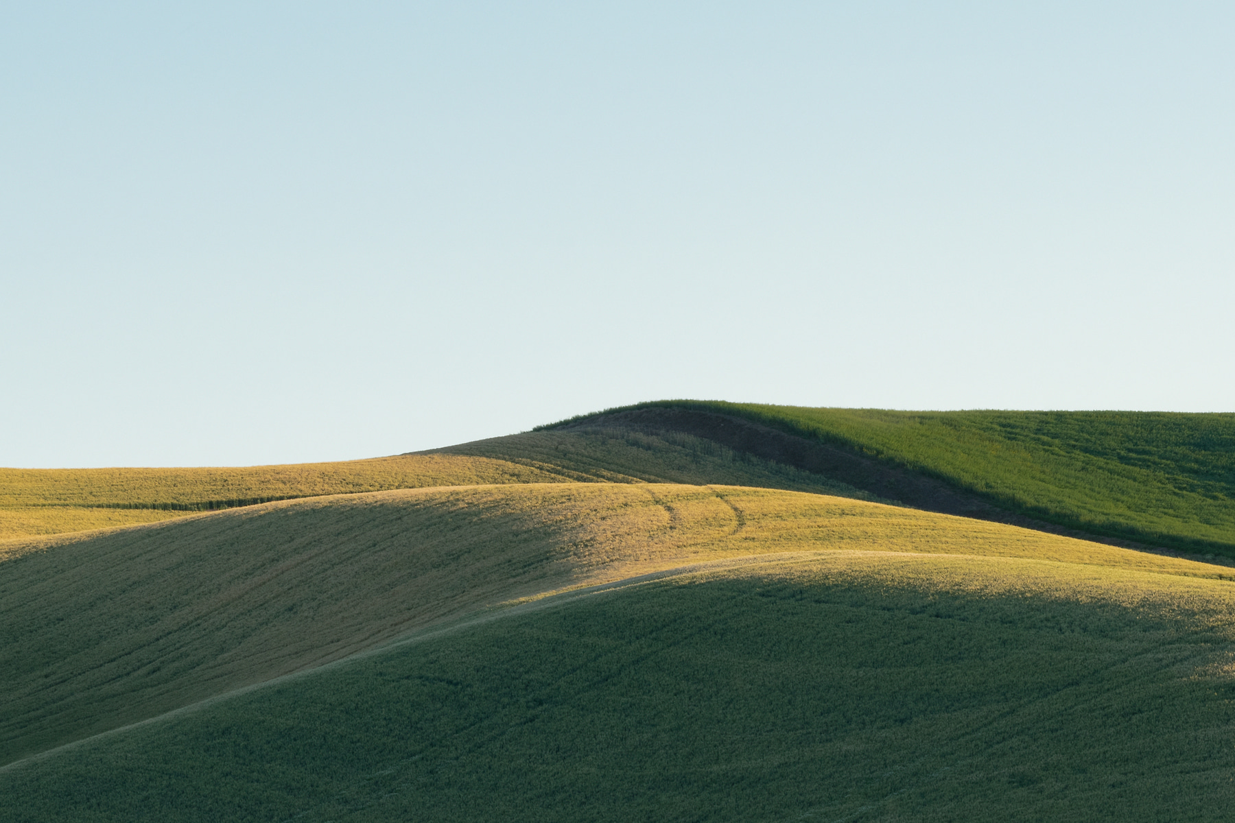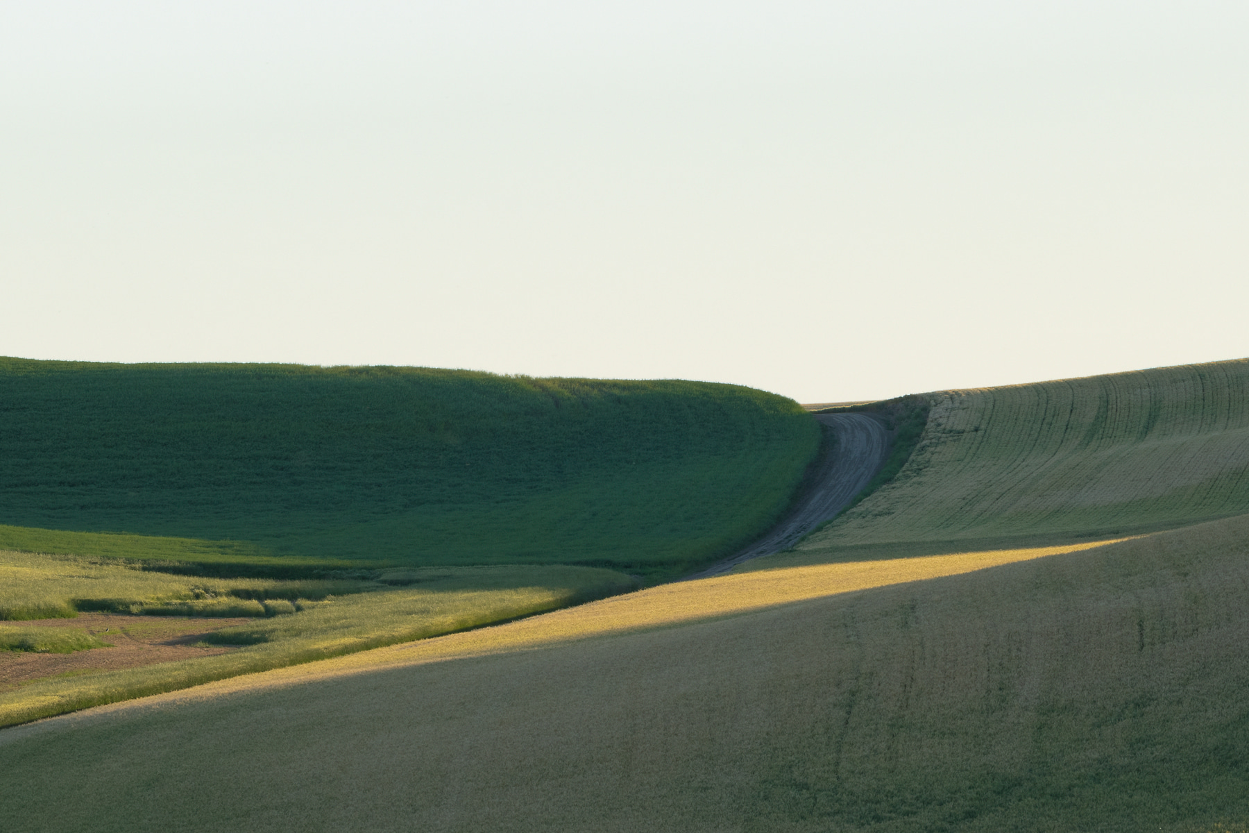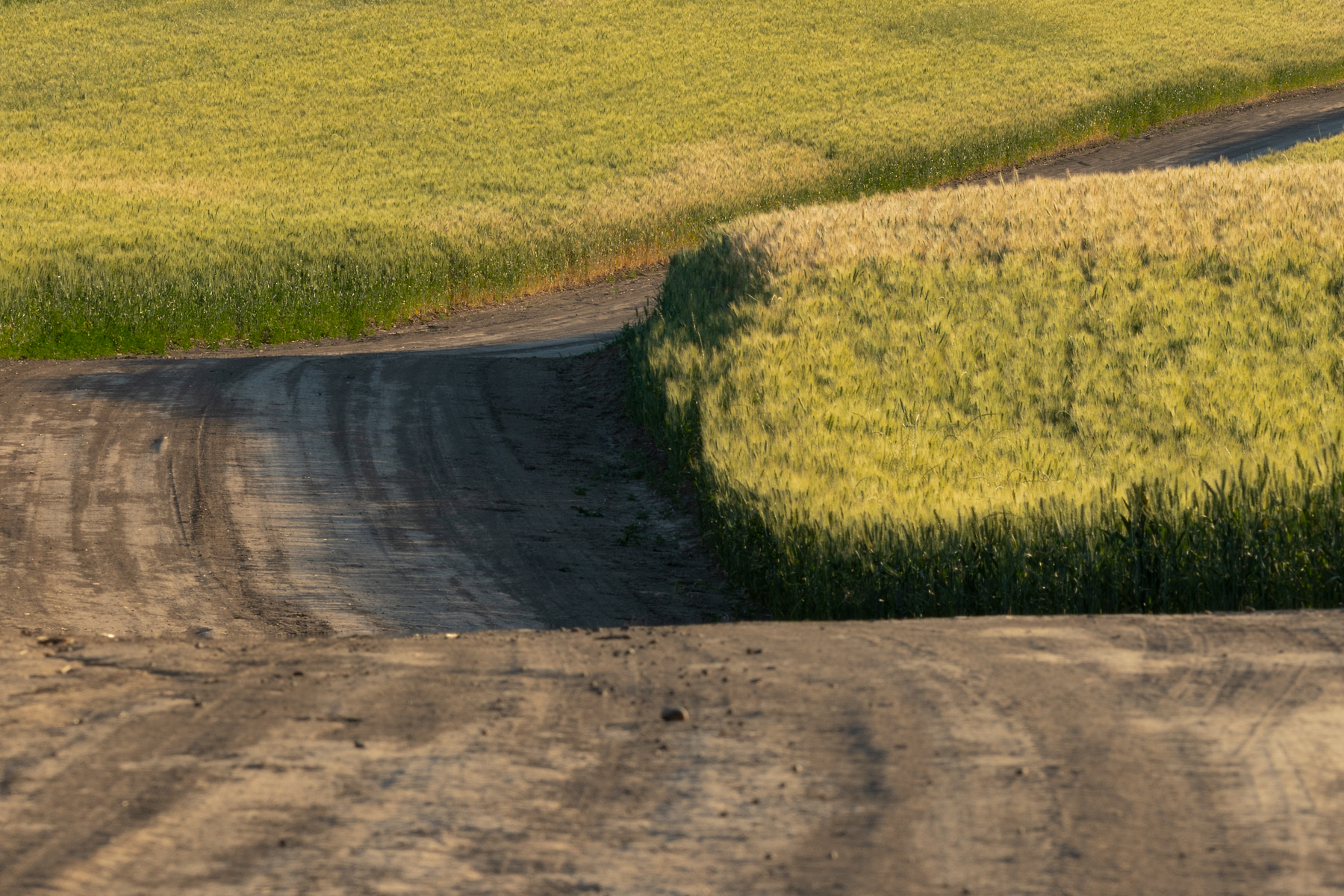 This is an iconic "Summer" road in the Palouse. It's only drivable in the Summer. During the Fall and Winter it's a soft muddy mess to drive on, AAA will not come and tow you if you get stuck. This road goes for miles, up and over ridges and finally intersects with another dirt road which does the same thing. It's narrow and if you come head to head with another car you both have to get skinny and inch into the wheat. If you come up against a combine you have to back up, may a mile or so until you can find a pull out. Photographing in the Palouse is always an adventure, you will commonly come away sweaty and dirty and with a smile on your face.