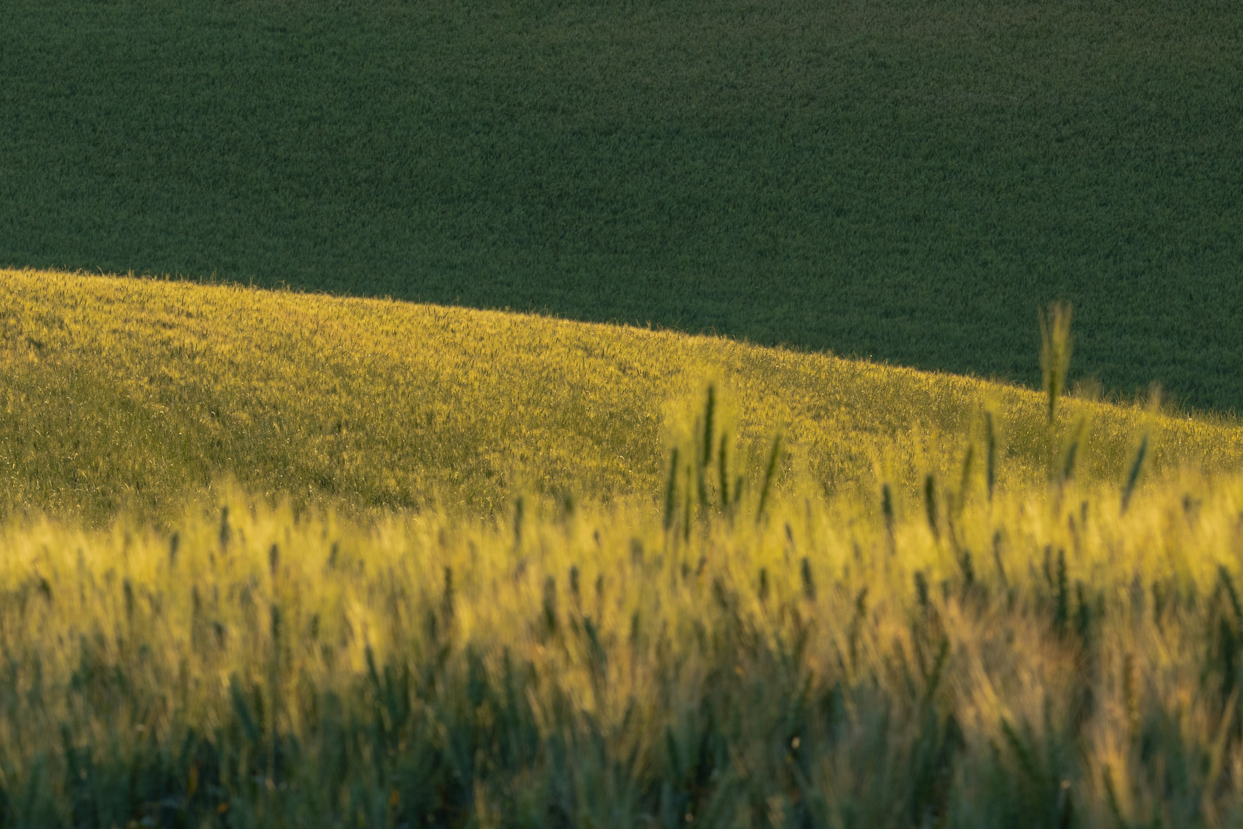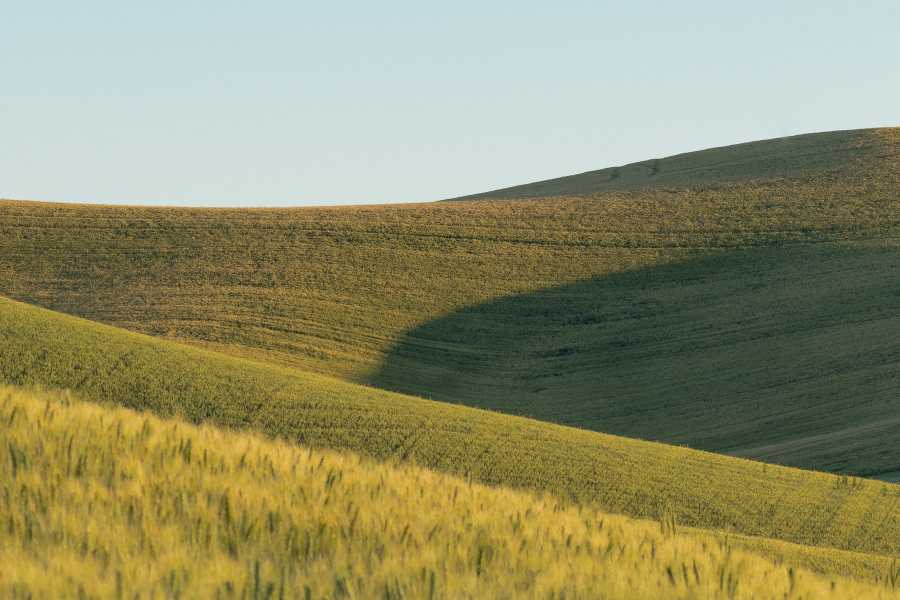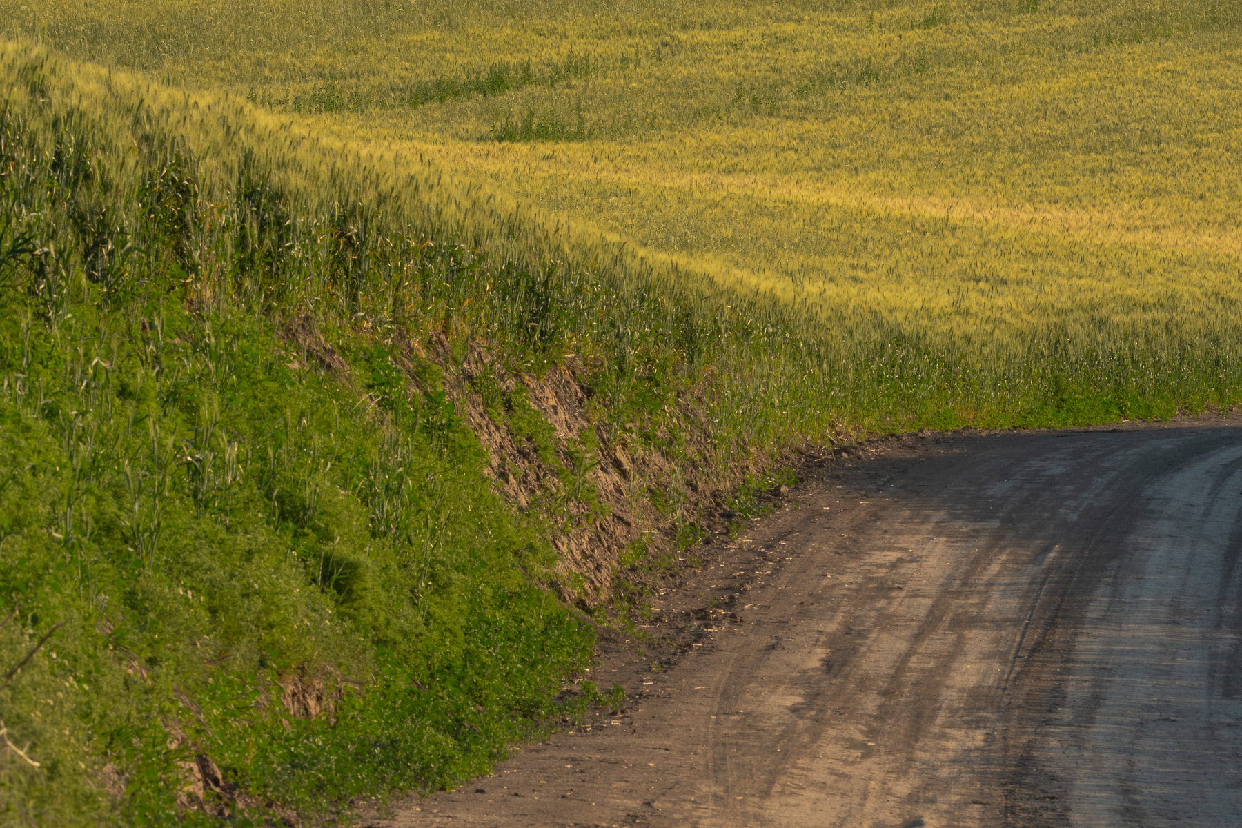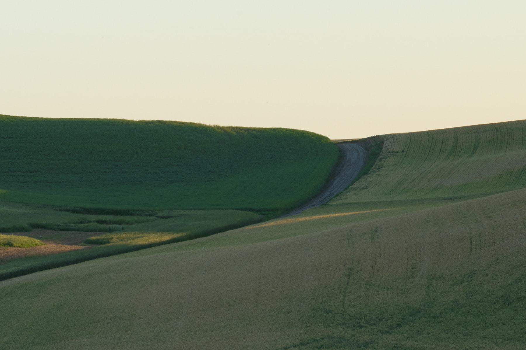 This is an iconic "Summer" road in the Palouse. It's only drivable in the Summer. During the Fall and Winter it's a soft muddy mess to drive on, AAA will not come and tow you if you get stuck. This road goes for miles, up and over ridges and finally intersects with another dirt road which does the same thing. It's narrow and if you come head to head with another car you both have to get skinny and inch into the wheat. If you come up against a combine you have to back up, maybe a mile or so until you can find a pull out. Photographing in the Palouse is always an adventure, you will commonly come away sweaty and dirty and with a smile on your face.