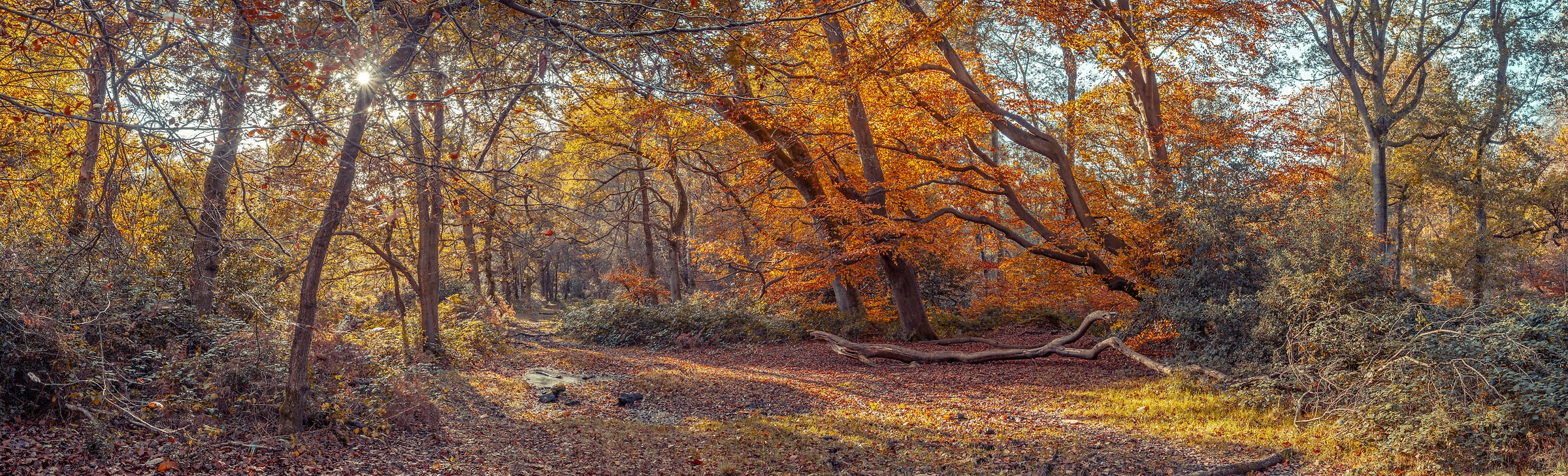 A pathway meanders through a breathtaking autumn forest, where golden leaves shimmer under the soft glow of sunlight. The towering trees, adorned with vibrant shades of orange and amber, create a mesmerizing canopy that filters the light, casting a warm and inviting atmosphere. The forest floor is blanketed in a rich tapestry of fallen leaves, while patches of green vegetation add contrast to the scene. The pathway, flanked by twisted branches and rugged undergrowth, draws the eye into the depths of the woodland, evoking a sense of exploration and tranquillity. Sunlight peeking through the branches adds a dynamic interplay of light and shadow, enhancing the textures of bark, foliage, and scattered forest debris.