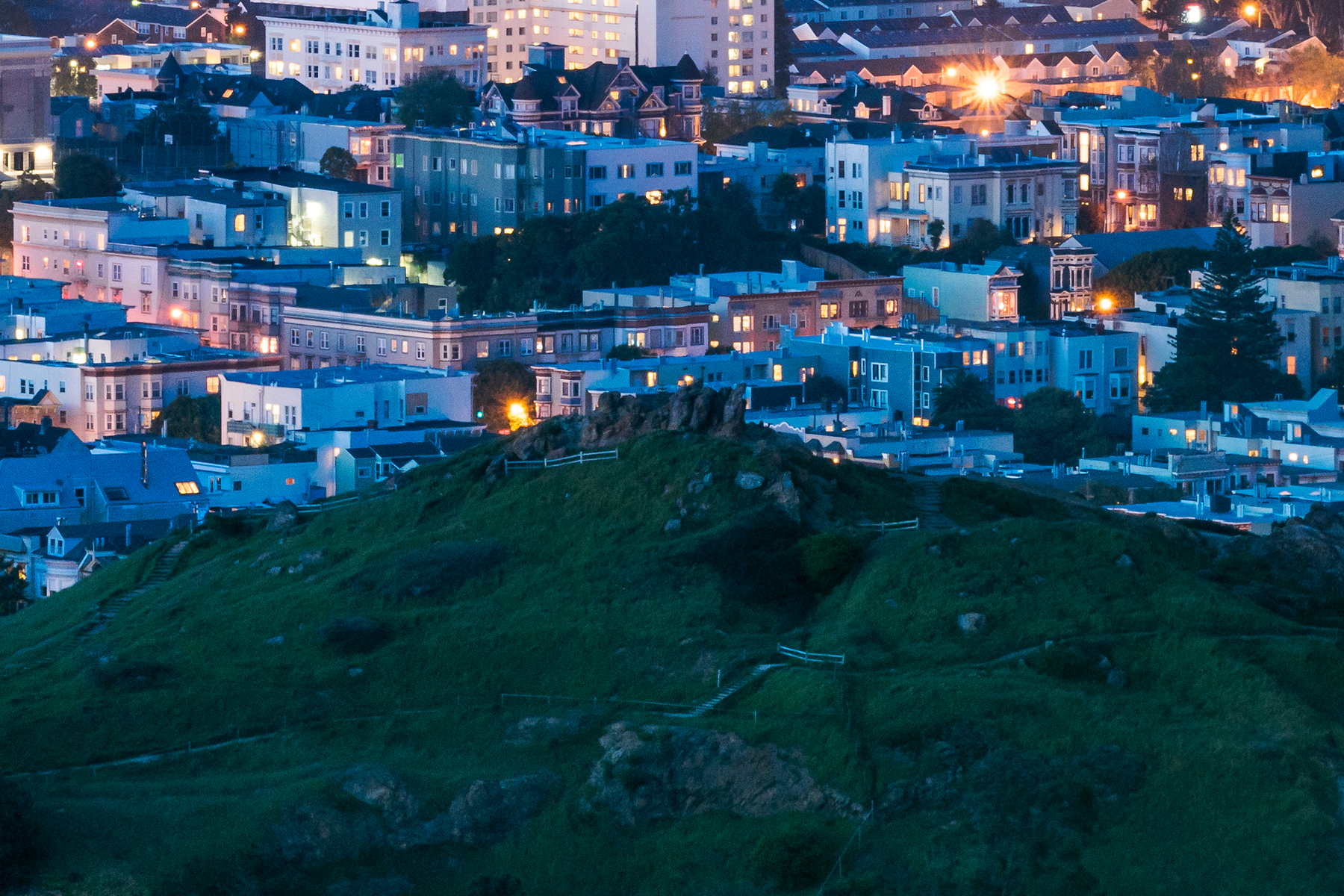 On this particularly cold evening, I worked my way past the main viewpoint, and down the hillside where I could be in perfect position. I wanted to be able to see the famous Ferry Terminal building all the way at the end of Market Street. I sat on the side of the hill and waited for the sun to go down behind me and for all the other visitors to leave. In the span of about ten minutes, the temperature dropped about 15 degrees, and the wind picked up dramatically. Without the extra layers and a sturdy tripod, this shot would not have happened.