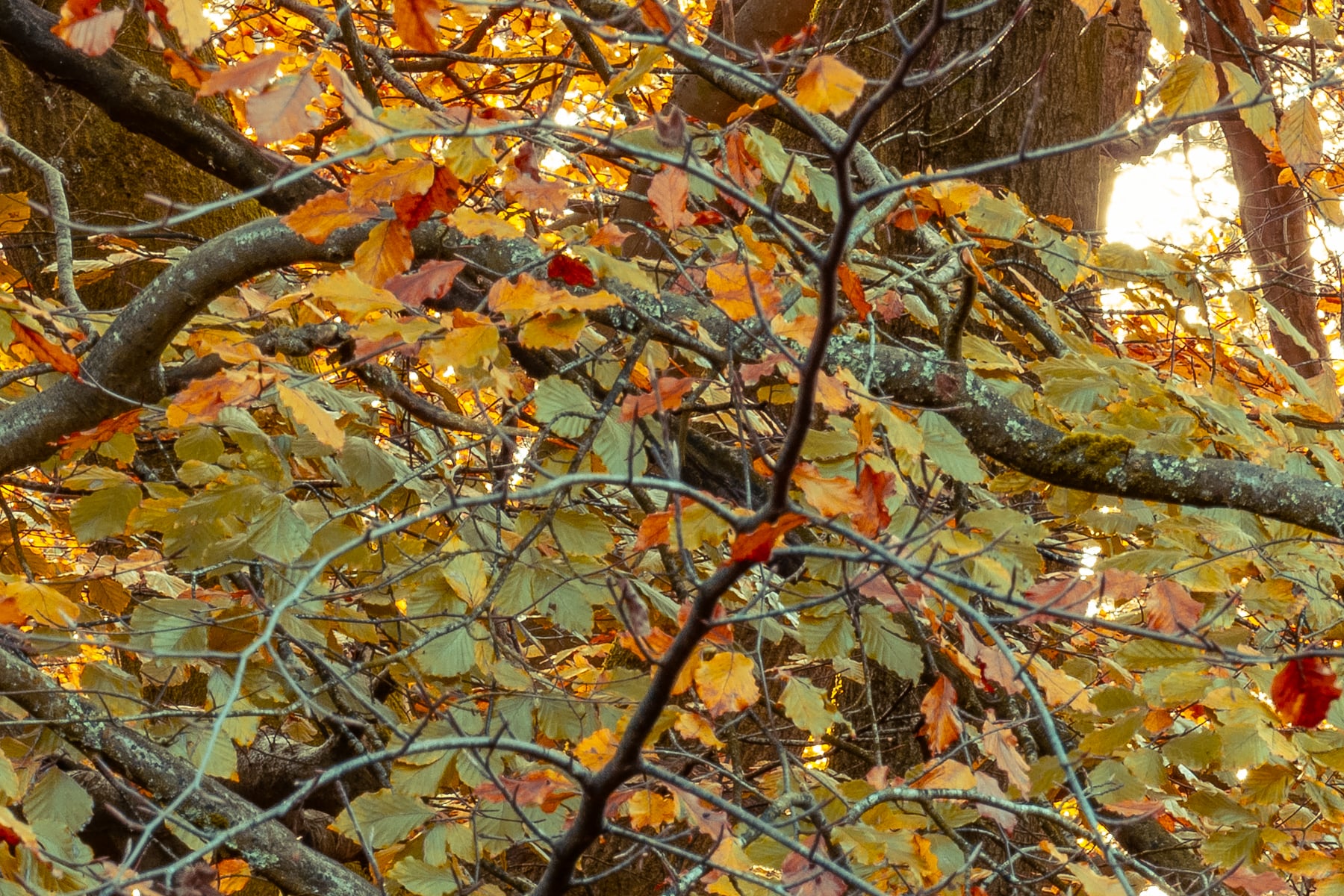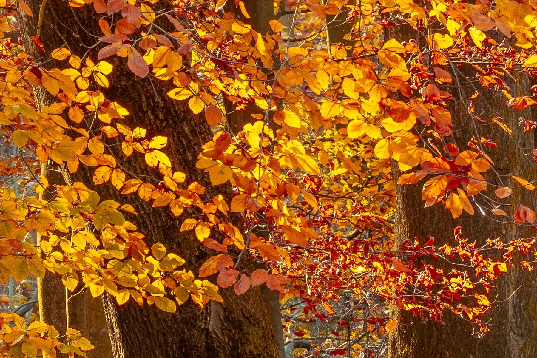 On either side of the trail, dense foliage and graceful ferns frame the pathway, adding texture and depth to the composition. The sunlight plays through the branches, casting a mesmerizing interplay of light and shadow that highlights the intricate details of the leaves and tree trunks. The soft golden glow, combined with the crisp autumn air, creates an atmosphere of serenity and quiet reflection, perfect for a peaceful walk or an escape into nature.