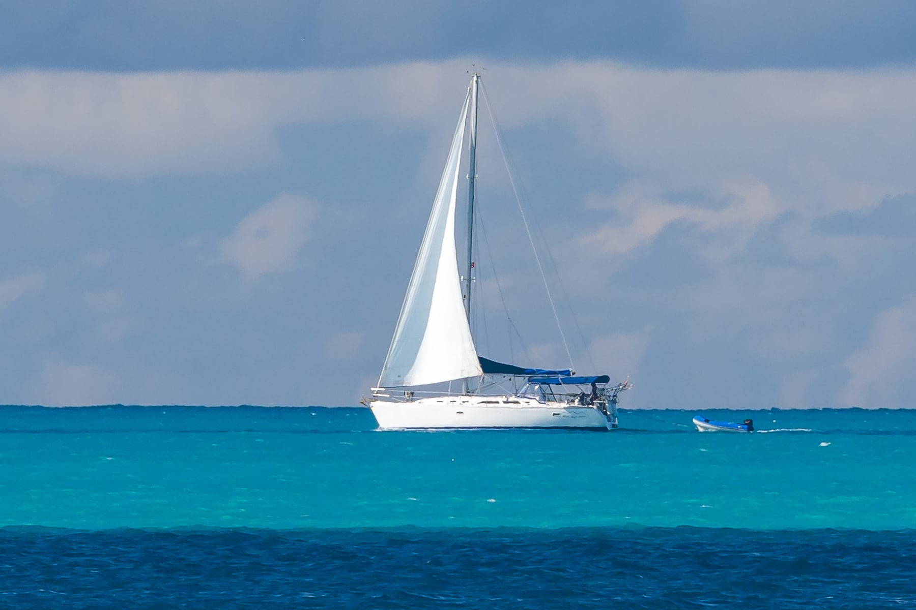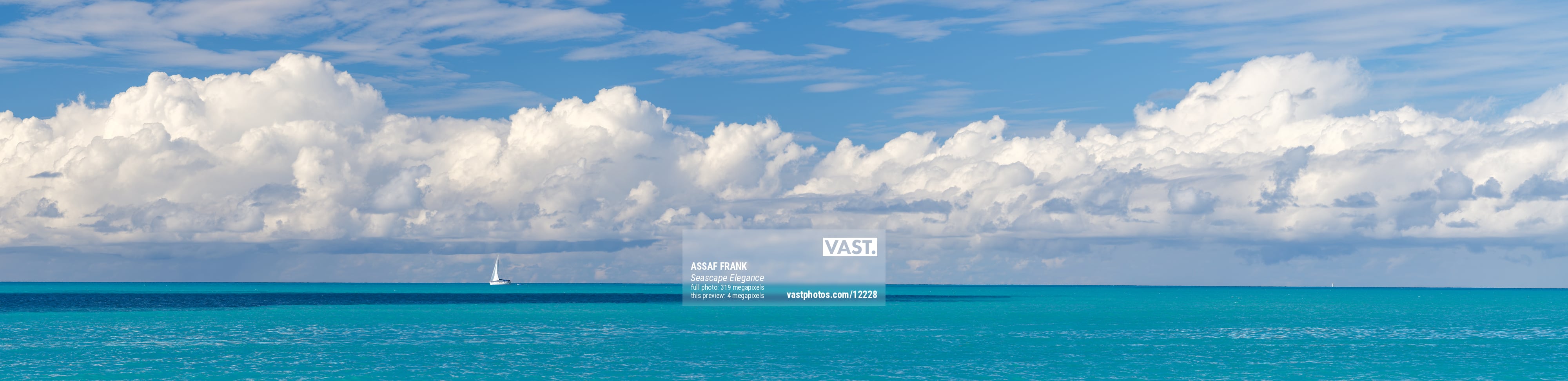 This panoramic photograph showcases the mesmerizing beauty of a tranquil seascape. A vast expanse of turquoise blue water stretches seamlessly into the horizon, where it meets a dramatic sky adorned with billowing white clouds. The soft gradient of ocean blues contrasts harmoniously with the crisp cloud formations, creating a calming and immersive visual experience. A distant sailboat can be spotted on the horizon, adding a sense of scale and adventure to the serene setting.