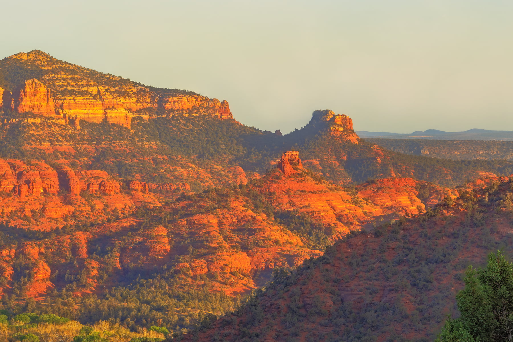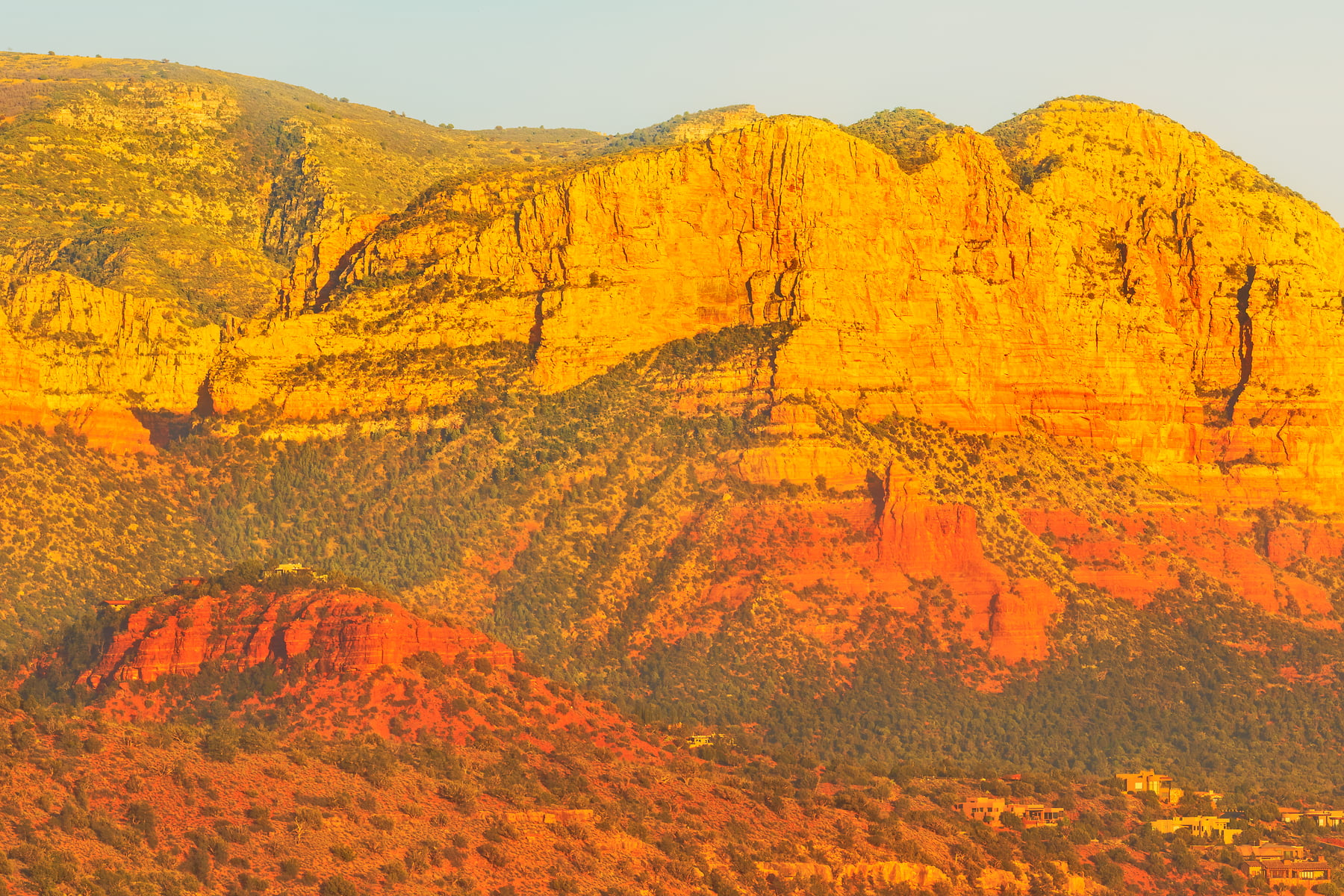 Magic Hour or Magic Time in Sedona is a special time of day. The famous sunset "Glow" illuminates Twin Buttes, Schnebly Hill, Courthouse Butte and Cathedral Rock in the setting Sun's last light.