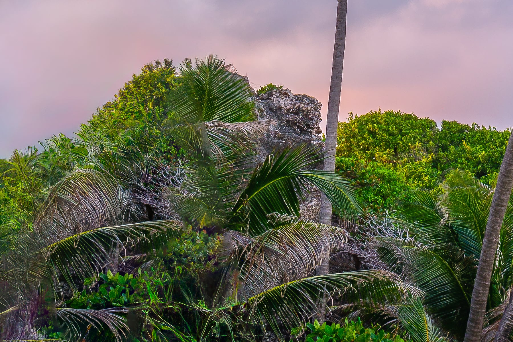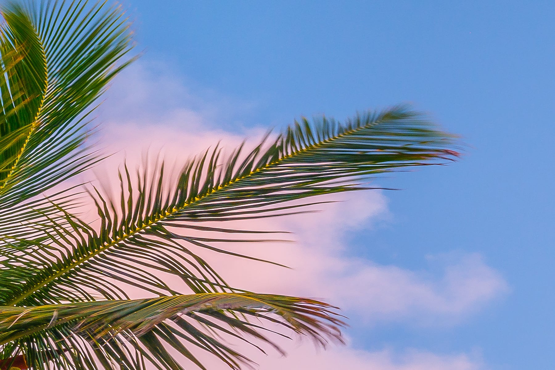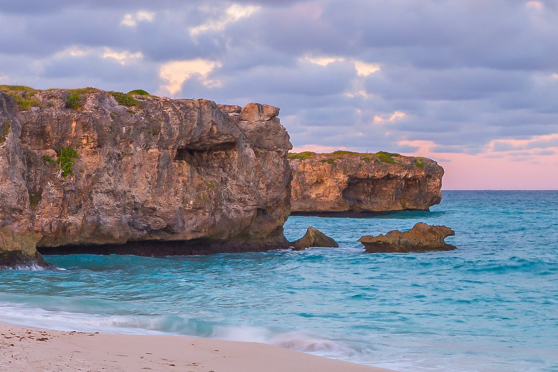 This stunning panoramic image captures a tranquil tropical beach at dusk in the Caribbean. Towering palm trees gently sway in the coastal breeze, casting long shadows over the soft, white sand. The sky is painted in pastel hues of pink, lavender, and blue as the sun sets behind the horizon, reflecting its colors across the calm turquoise waters. Puffy clouds drift lazily overhead, completing this idyllic seascape.