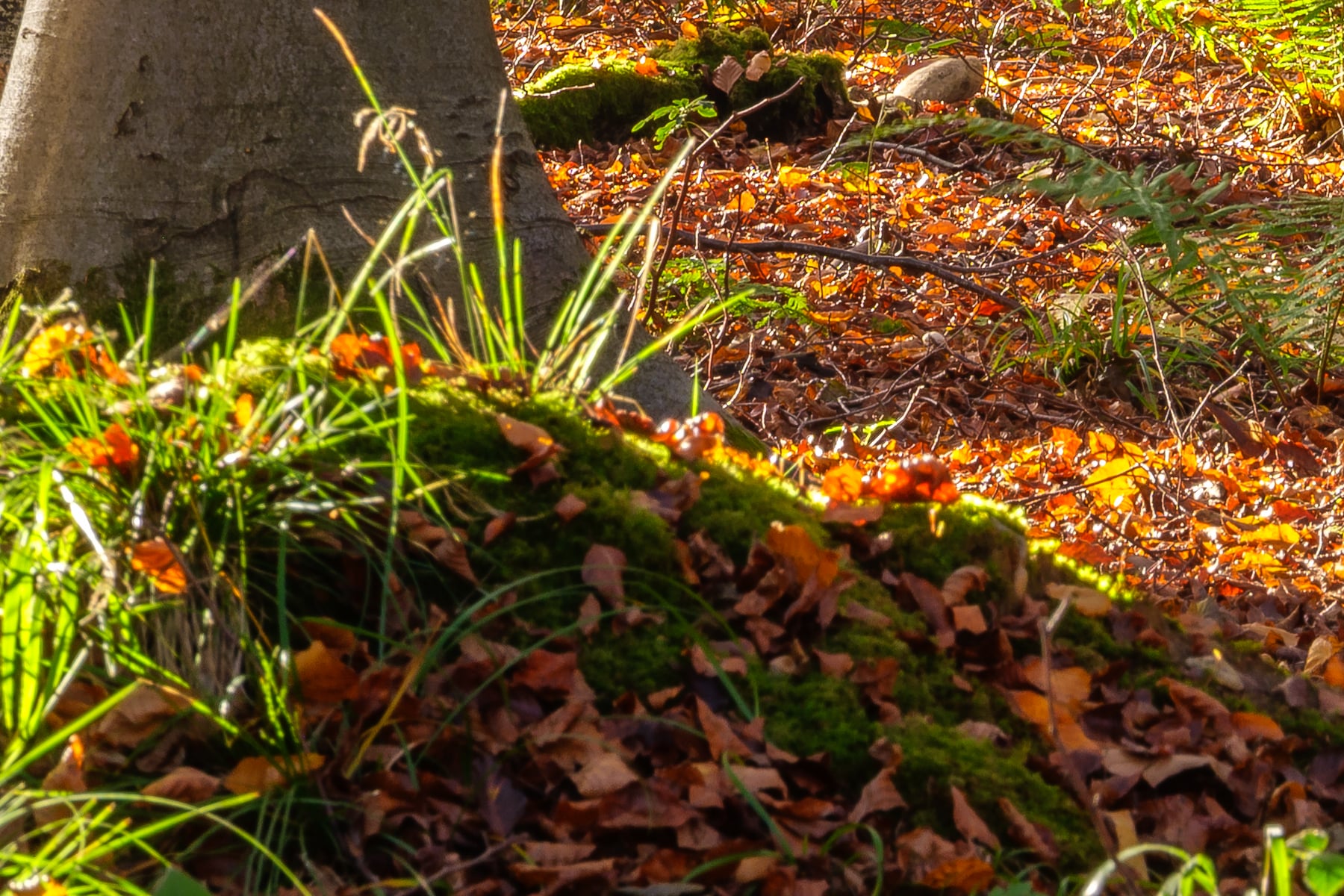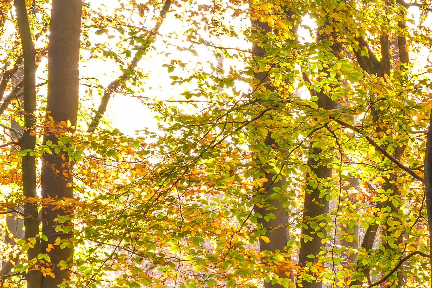 A captivating autumn forest bathed in golden sunlight captures the beauty of the season’s transformation. The towering trees, adorned with warm hues of orange, yellow, and amber, create a mesmerizing canopy, filtering the soft morning light. The sun’s rays pierce through the foliage, casting long shadows and illuminating the vibrant leaves with a radiant glow. The forest floor, covered in a blanket of fallen leaves, contrasts with the lush green ferns, adding depth and texture to the serene woodland scene.