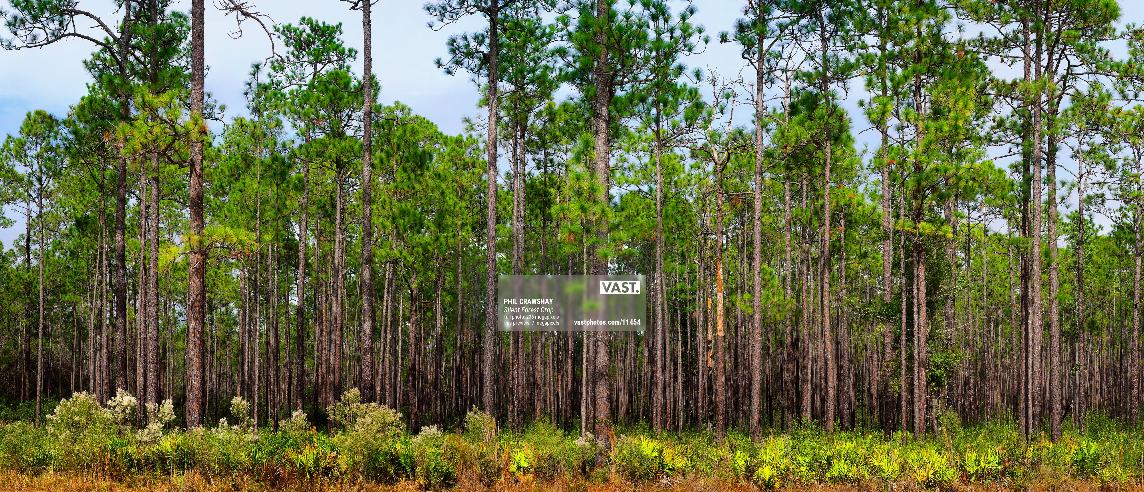 The photograph captures these tall and majestic trees standing still on an almost windless day. I used a long lens to bring out every intricate detail of the trunks and foliage which results in the image looking extremely sharp whether standing close up or from a distance.