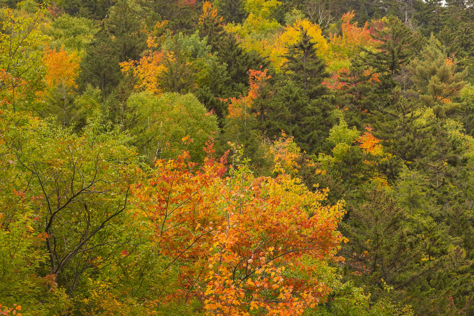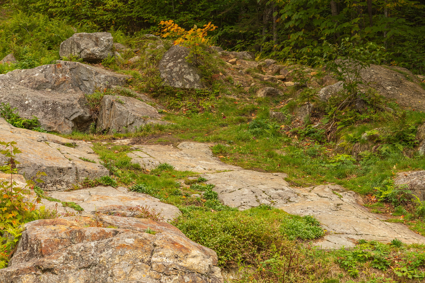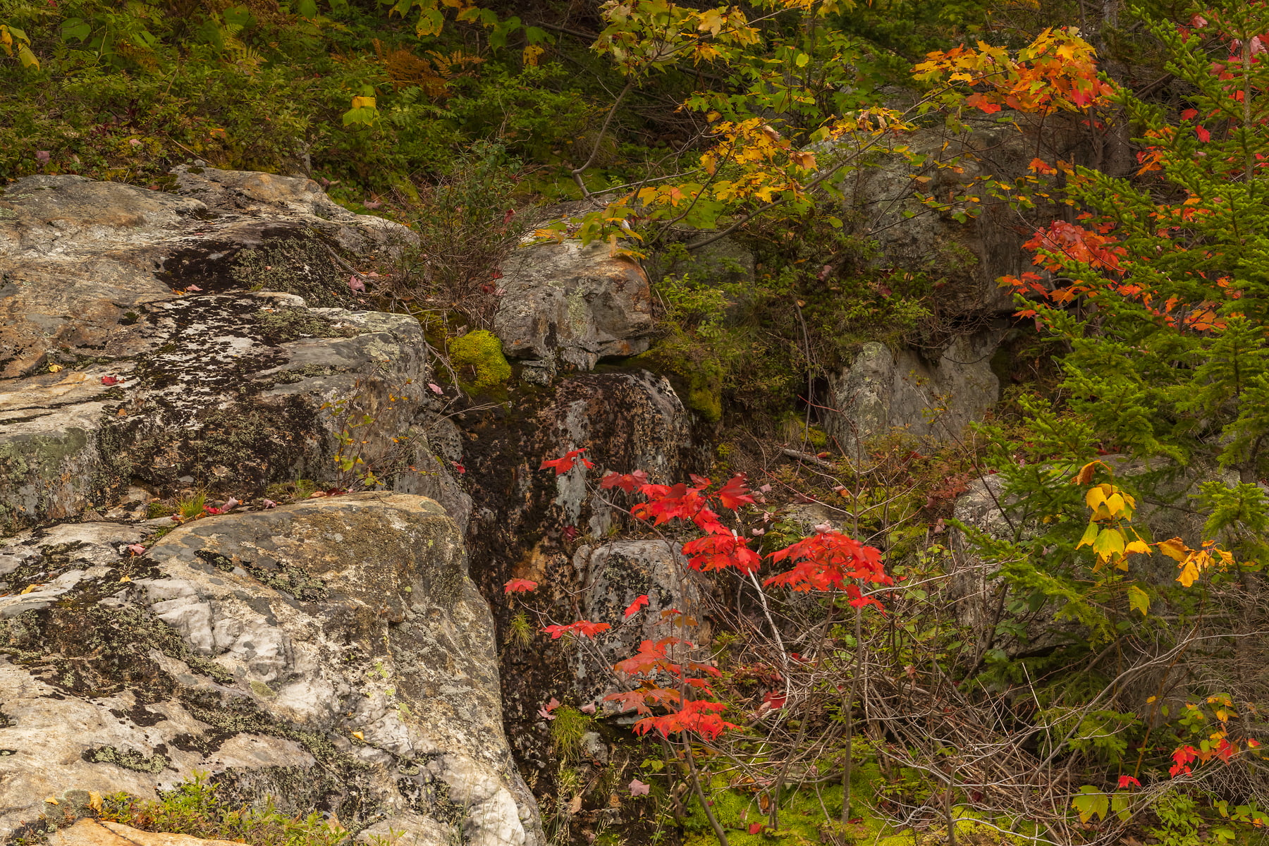 October's, fall's magical transition of hardwoods are starting to turn mountainsides into a blazing riot of color. This innocent looking white ribbon has managed to slice through the tough granite, making its own notch that funnels icy waters under the roadway.