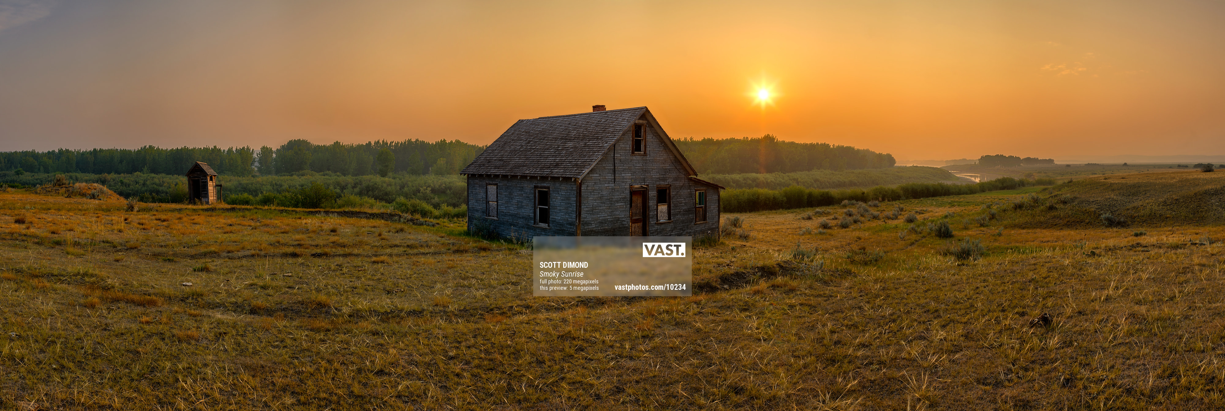 I knew from experience that, even on a cloudless morning, smoky haze low on the horizon can transform sunlight into a lovely soft orange glow that stretches for miles. Such was the case on this early morning when I set up the special equipment I needed to create this VAST photo in front of an old abandoned homestead along the South Saskatchewan river.