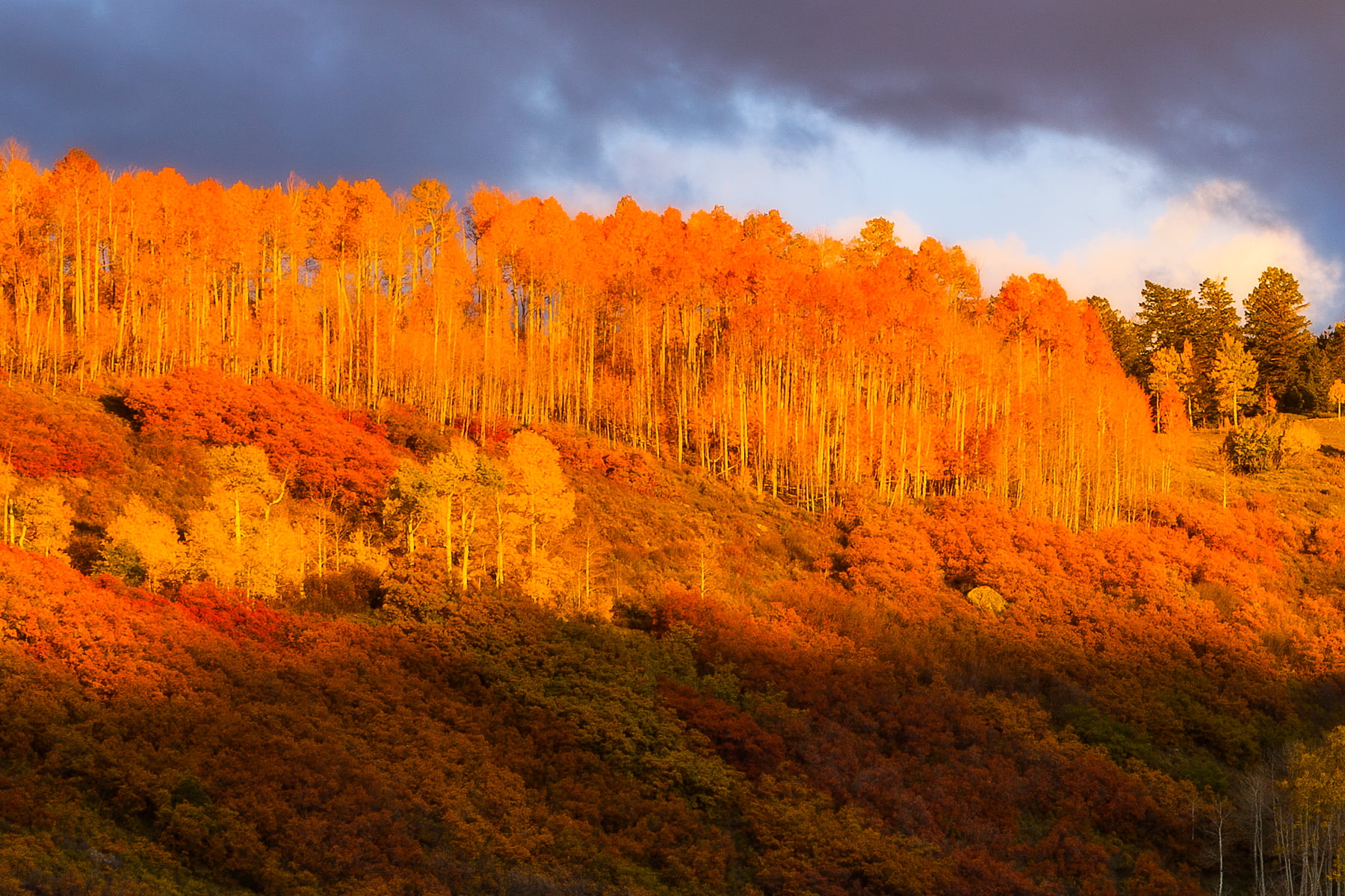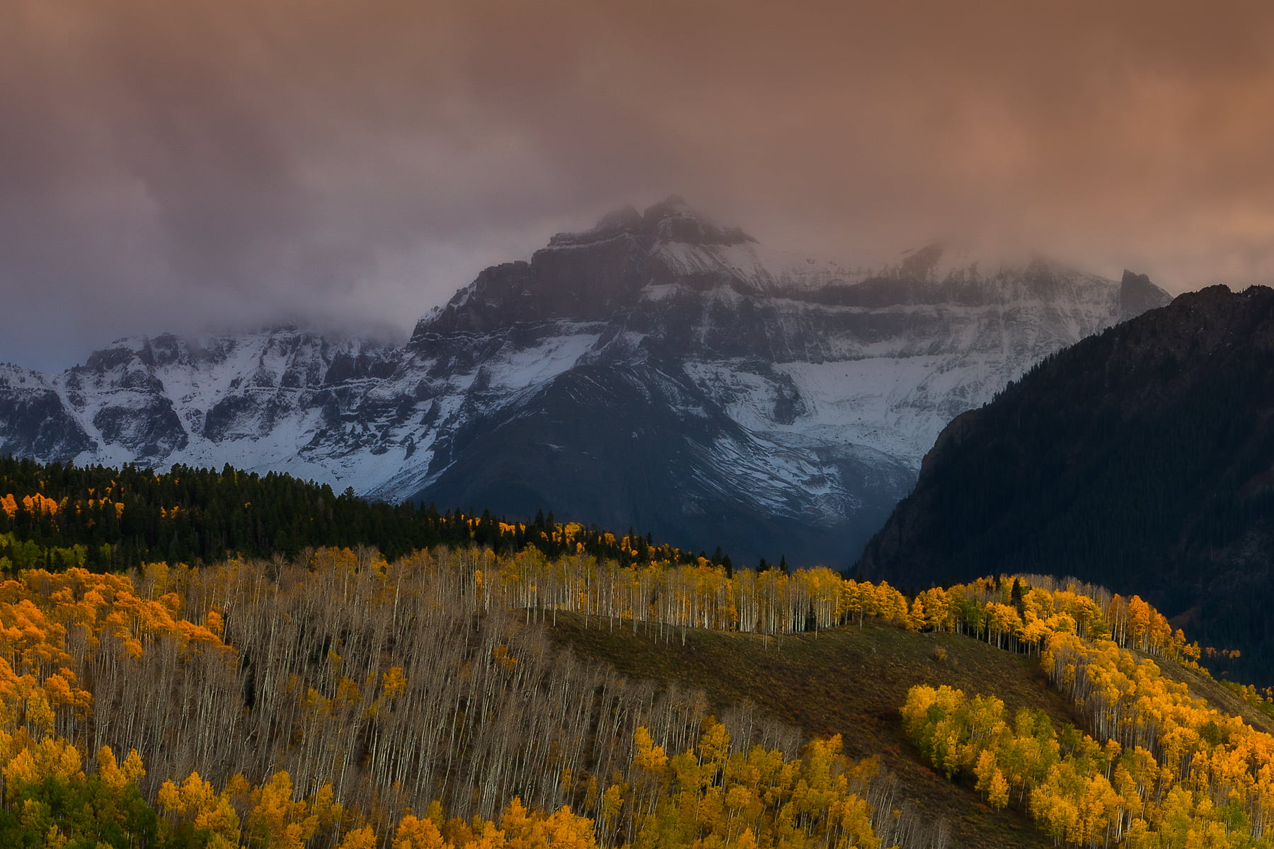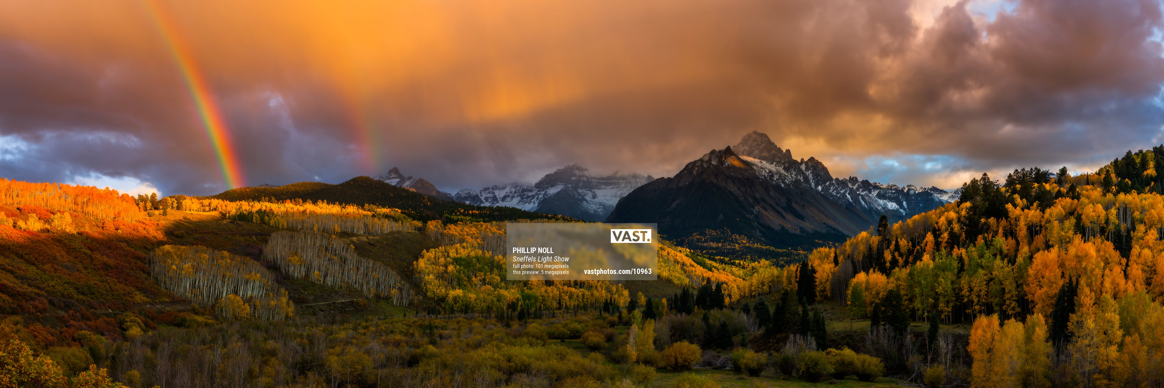 This view of Mount Sneffels rising above the Dallas Creek Valley is one of the most stunning views in Colorado. On this evening I arrived at my chosen vantage point and awaited sunset. A passing storm filled the sky with rain, color, and even a rainbow!