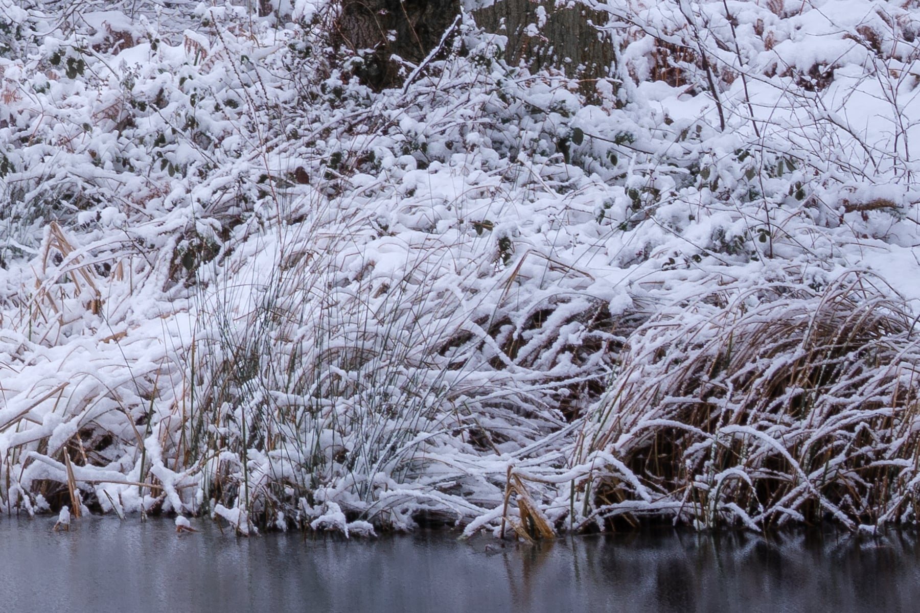 The composition expertly balances the natural elements with the bold pop of color, creating a harmonious and visually engaging image. This photograph beautifully encapsulates the peaceful and reflective mood of a snowy day by the canal, highlighting winter's simple yet profound beauty.