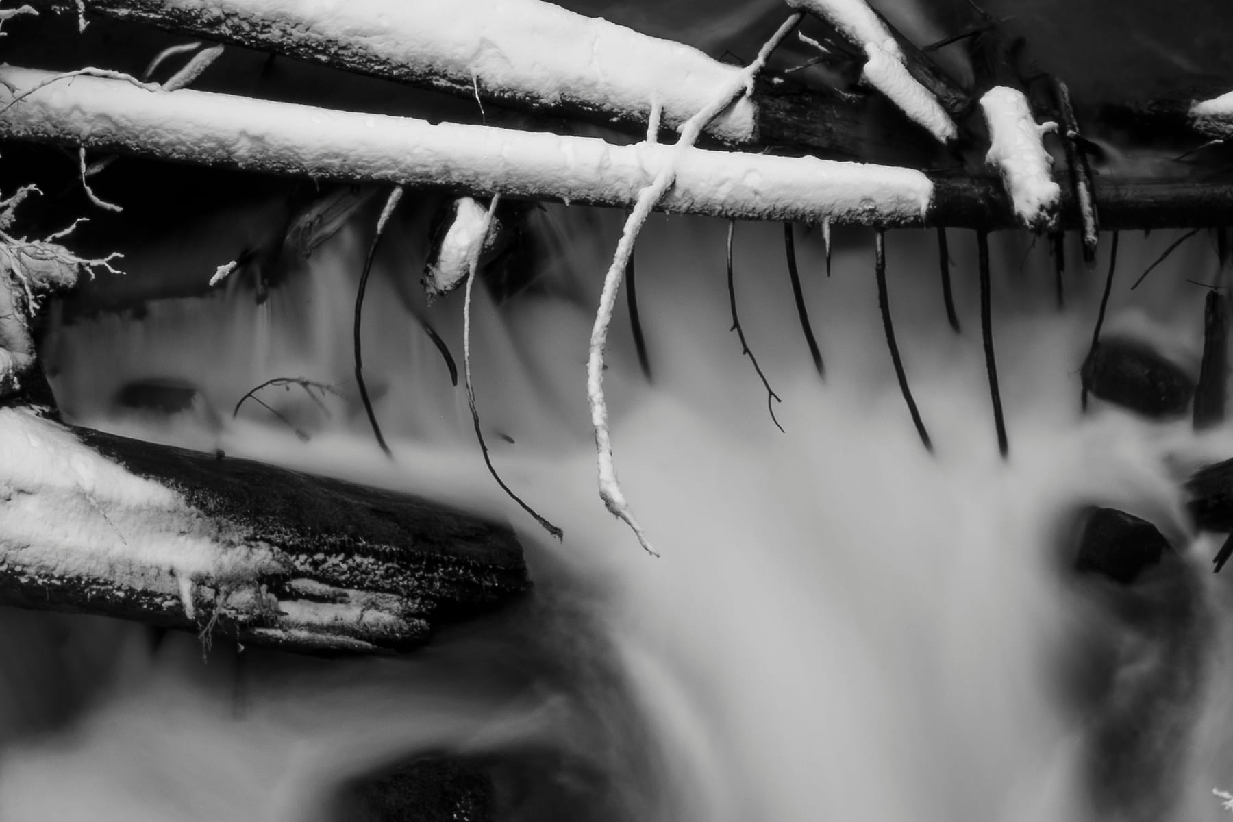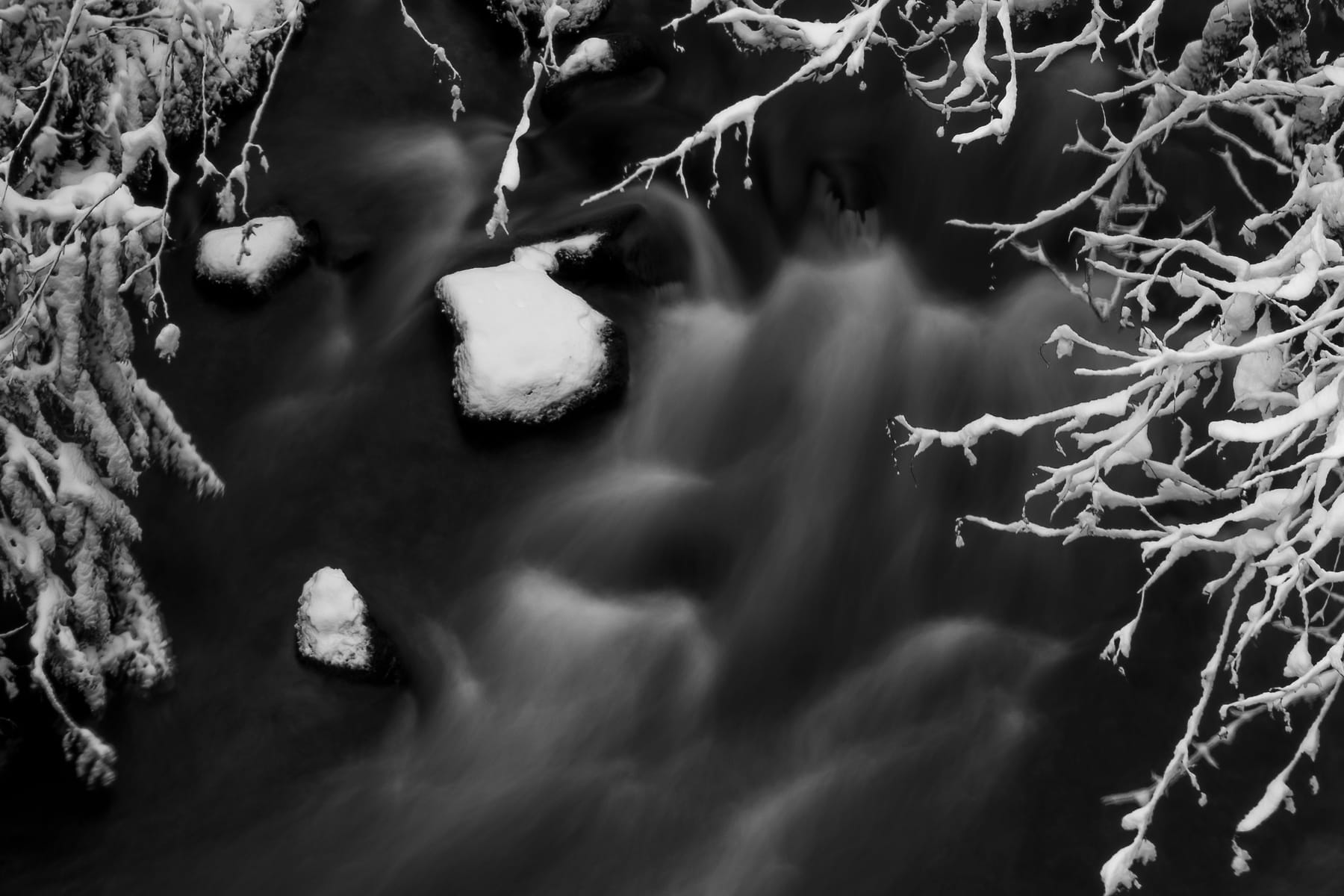 On this winter's day in early February, I relished in the beautiful continuity of tones as the contrasting whitewater and darkened depths of the pools mirrored the highlighted forms of the trees, while the forest floor held pockets of darkness.