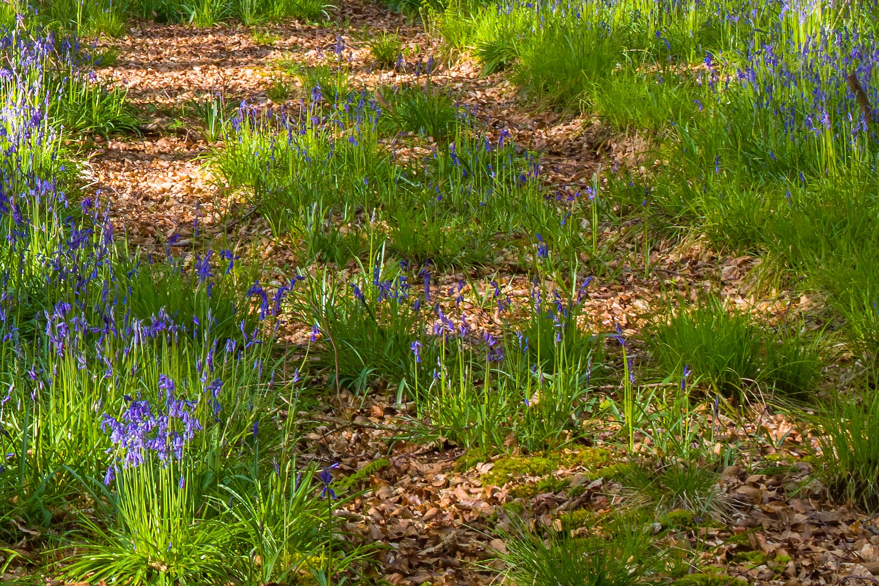 The wide-angle perspective enhances the immersive experience, inviting the viewer into this untouched woodland paradise. A narrow dirt path winds gently through the scene, adding depth and a sense of peaceful exploration. Every element—from the scattered fallen leaves and bluebell clusters to the towering trunks—combines to create a rich tapestry of natural textures and tones.