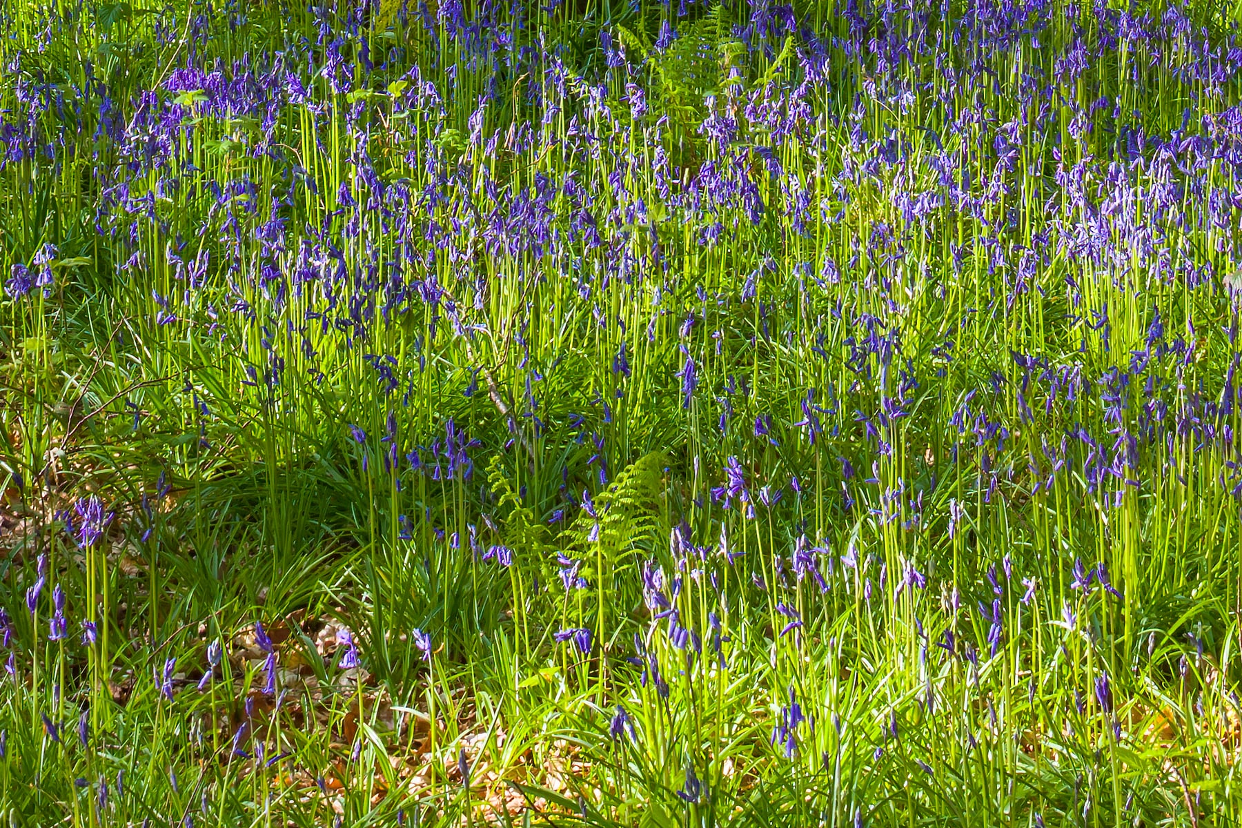 This panoramic image captures the enchanting tranquility of a bluebell forest in Hampshire, UK, during peak spring bloom. Towering, straight-trunked trees rise skyward, their newly sprouted leaves forming a soft green canopy that allows golden light to gently filter through. The forest floor is blanketed with a dense spread of vibrant bluebells, their purple-blue hues contrasting beautifully with the lush green undergrowth and the sturdy, dark bark of the trees.