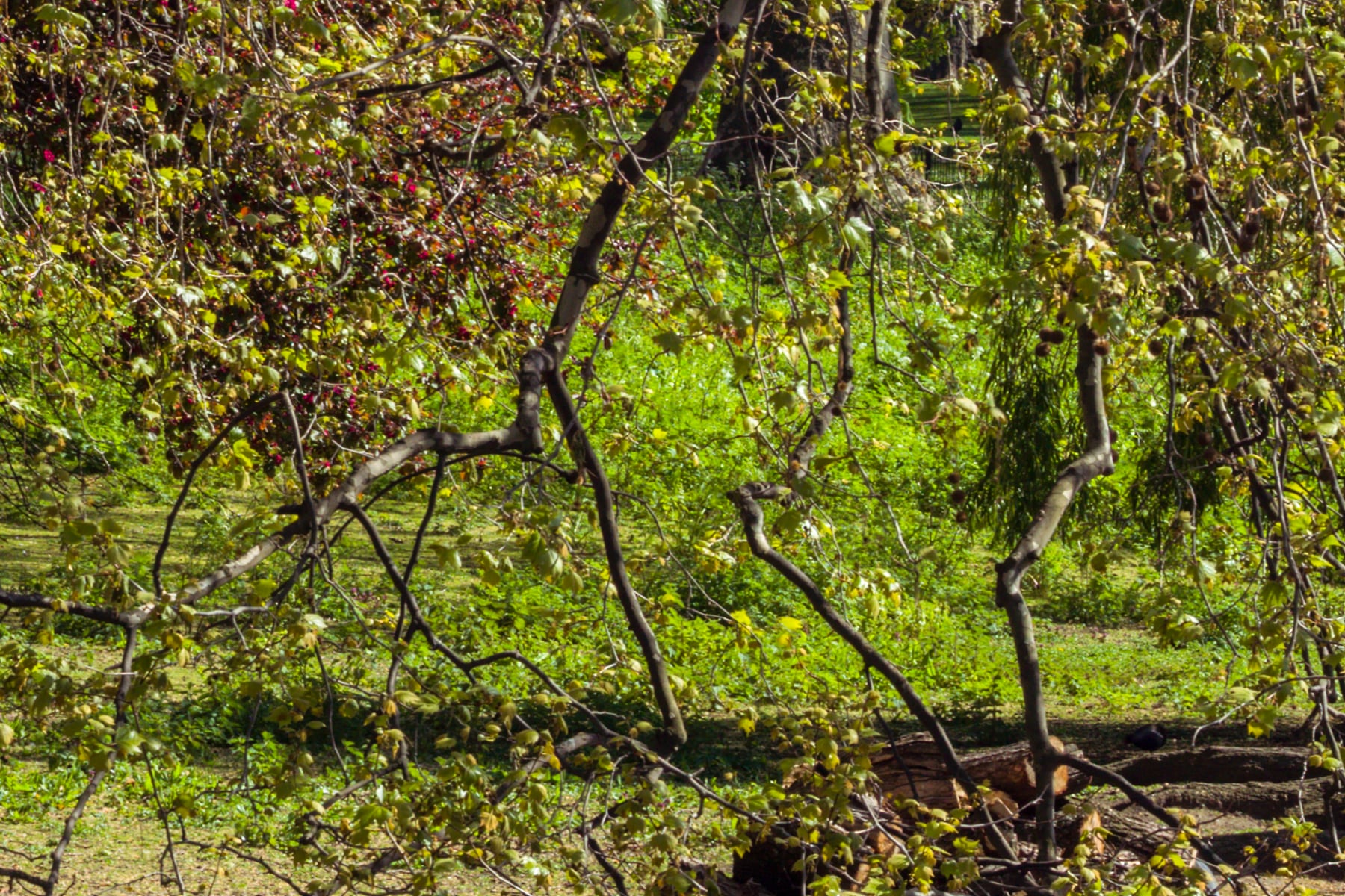 The photograph showcases the harmonious blend of nature and urban elements, with London's historic buildings and modern landmarks providing a stunning backdrop to the park's verdant splendour. The variety of trees, each in a unique shade of green or autumnal hue, adds a rich and diverse dimension to the composition, making the scene even more captivating.
