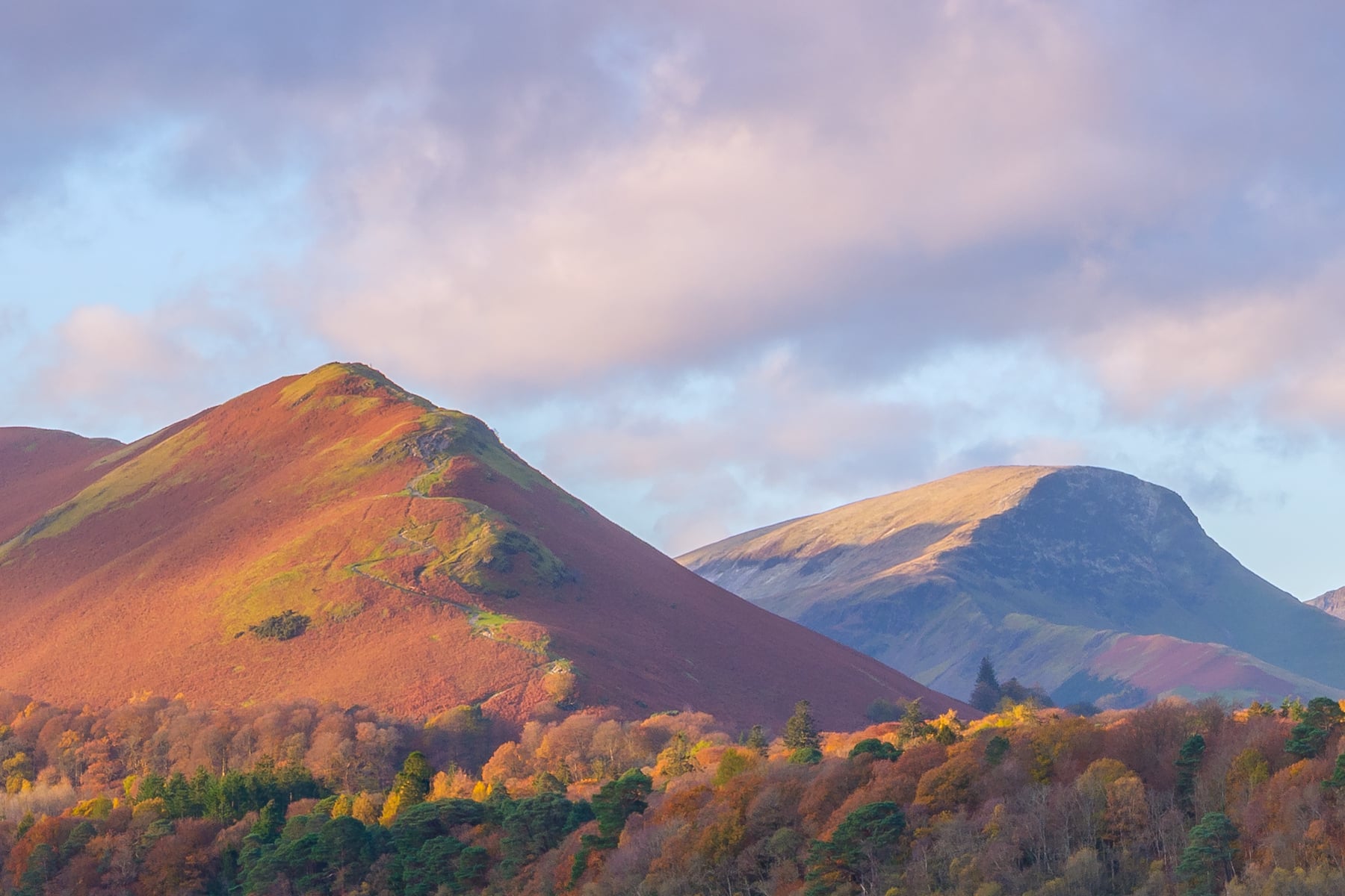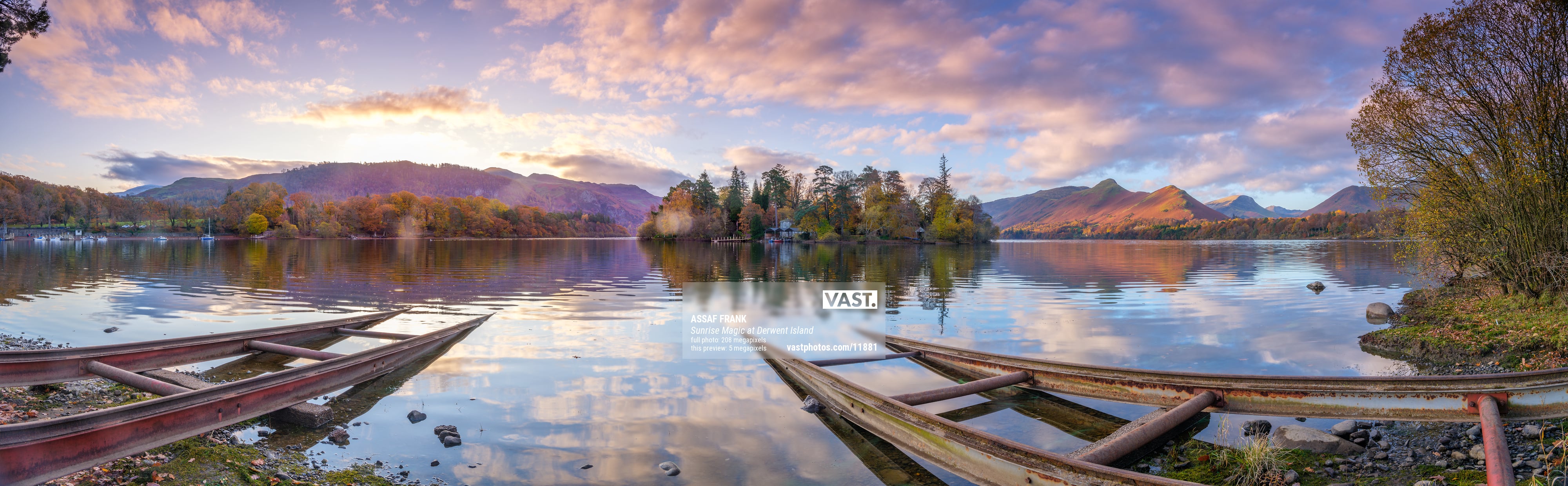 This breathtaking panoramic image captures the serene beauty of Derwent Island at sunrise, located on Derwentwater in the Lake District. The calm waters of Derwentwater mirror the sky's delicate hues, ranging from soft pinks to golden yellows, as the sun begins to rise behind the distant mountains. The reflection in the water is almost perfect, creating a sense of symmetry and tranquillity that epitomizes the natural splendour of this area.