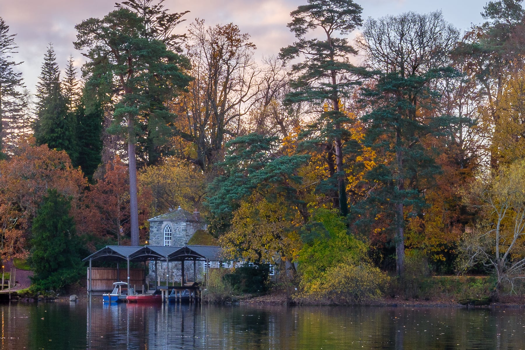 In the foreground, the remnants of old boat rails lead the viewer’s eye towards the picturesque island, emphasising the human connection to this natural landscape. The island, dotted with lush trees and a quaint building, sits peacefully amidst the lake, surrounded by autumnal foliage that adds a splash of color to the scene. The distant mountains, tinged with the warm light of dawn, provide a stunning backdrop, adding depth and majesty to the composition.