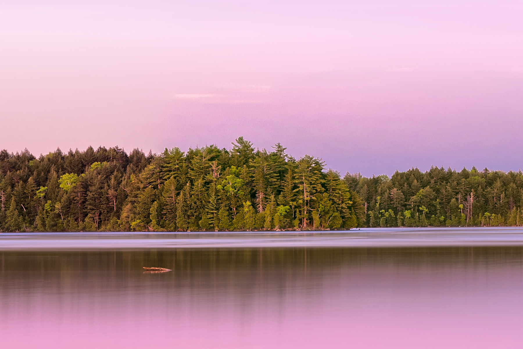I arrived about an hour before sunset and had plenty of time to just sit and take in the scene before setting up the camera. It is an amazingly tranquil and quiet view. I didn’t see the eagles, but there were a couple of loons in the distance making their customary haunting call at sunset. I chose the framing of my image from the dam on the far side of the lake 1.6 miles away to the fallen tree 160ft away that had not yet succumbed to the water’s depths, leaving a couple logs at my feet as a foreground, and waited to see what magic light might transpire. I didn’t have to wait long and I was rewarded with a beautiful palette of pinks and blues as the sun set below the trees behind me.