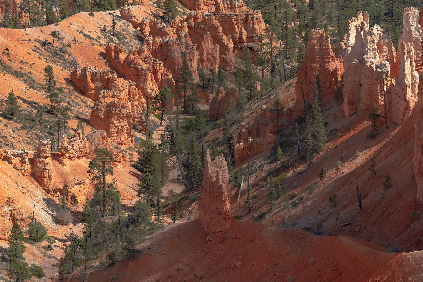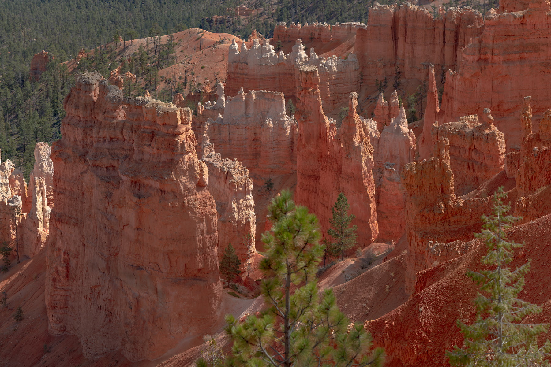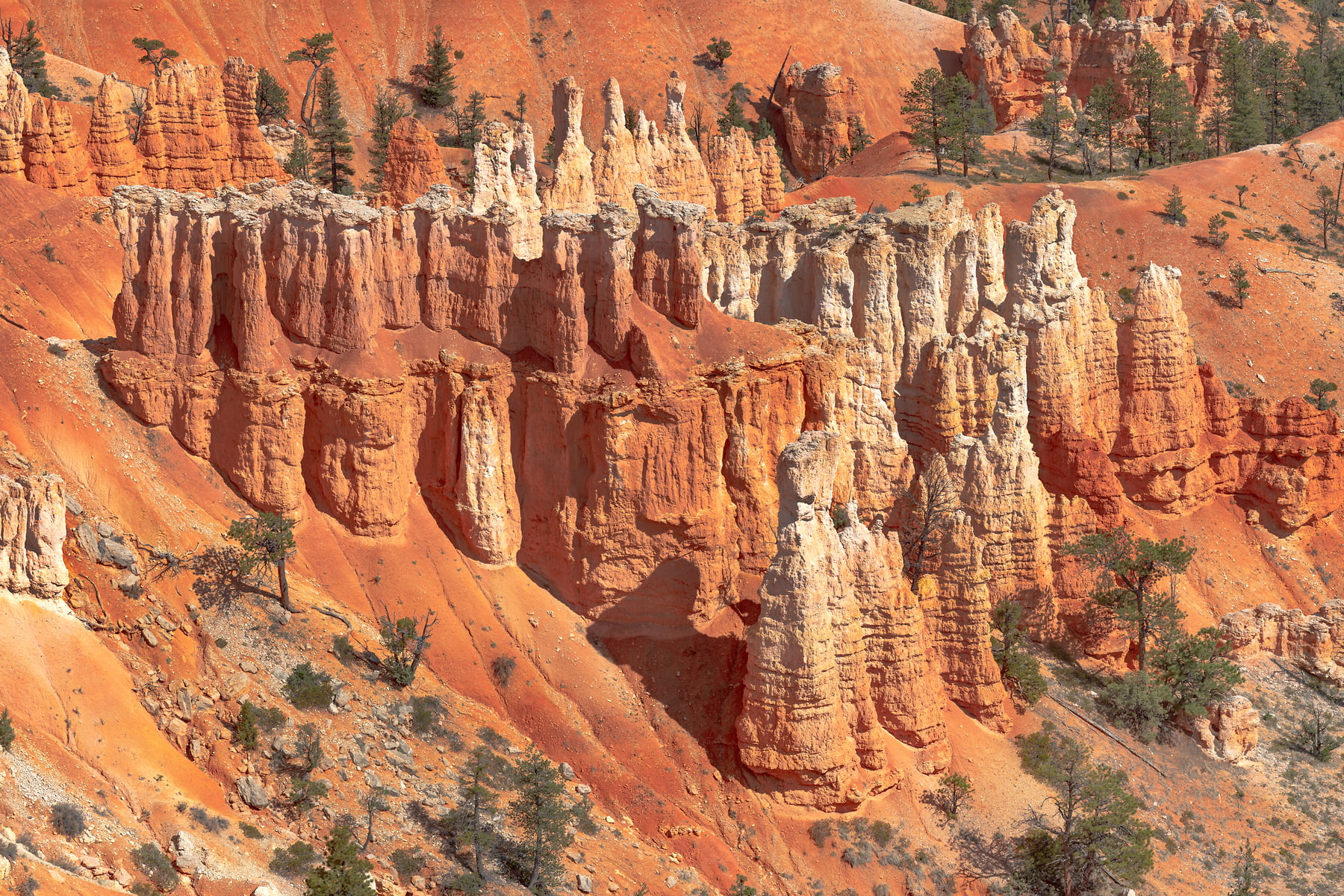Sunset Point offers vistas of some of the most famous and breathtaking of Bryce Canyon's hoodoos. Few places are the colors of Bryce Canyon's rock better displayed than from Sunset Point. Called the Claron Formation, this unique rock is primarily composed of limestone deposited in a large freshwater lake, known to geologists as Lake Claron. Iron oxide minerals supply the vibrant red, oranges, and yellows of the lower half of the cliffs which geologists call the Pink Member. As its geologic names suggest, here too patches of pink and purple caused by manganese oxides add to the rainbow of color. The change from orange to white marks the beginning of the Upper Member. This section of limestone is purer; its lack of color is caused by the absence of mineral impurities.