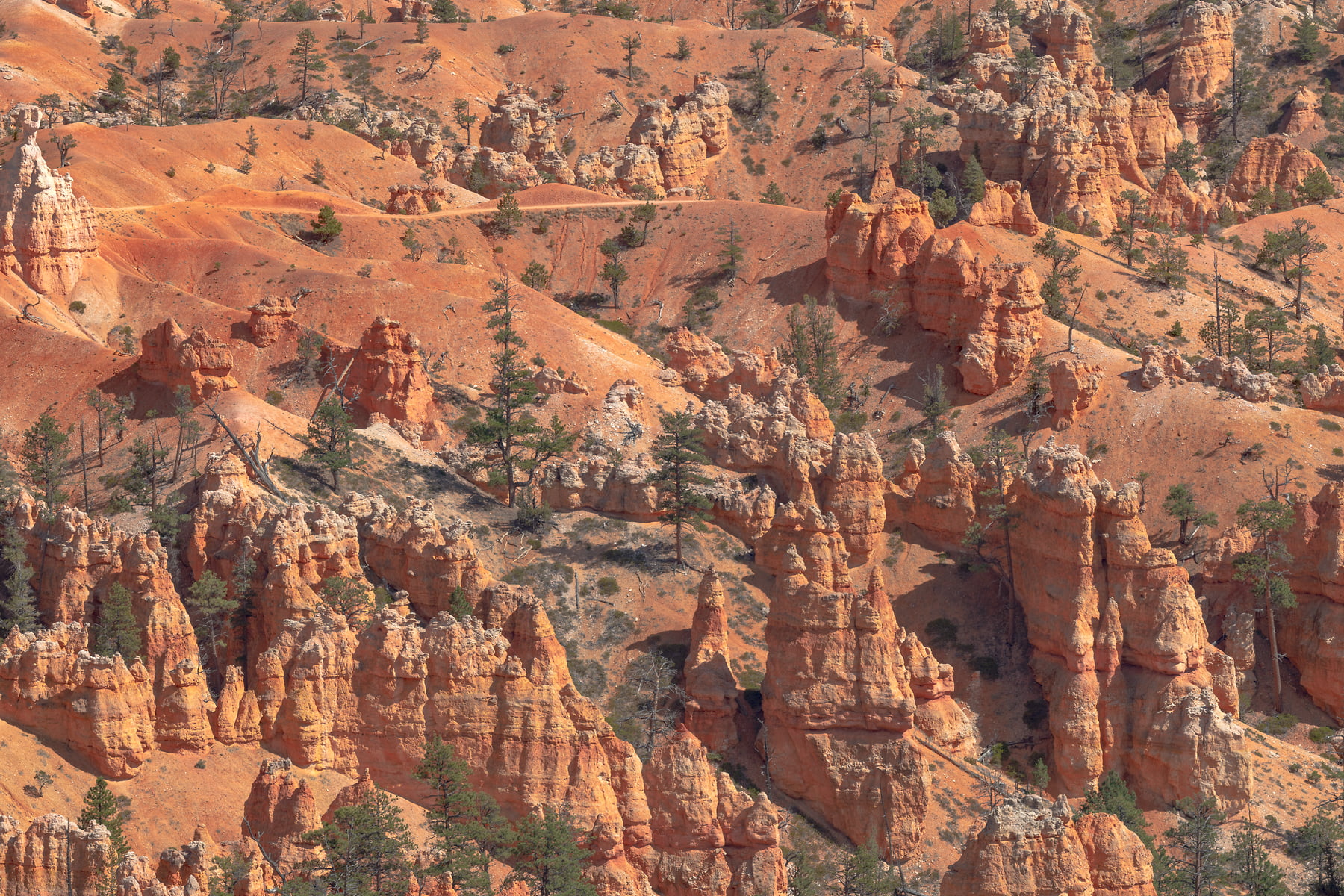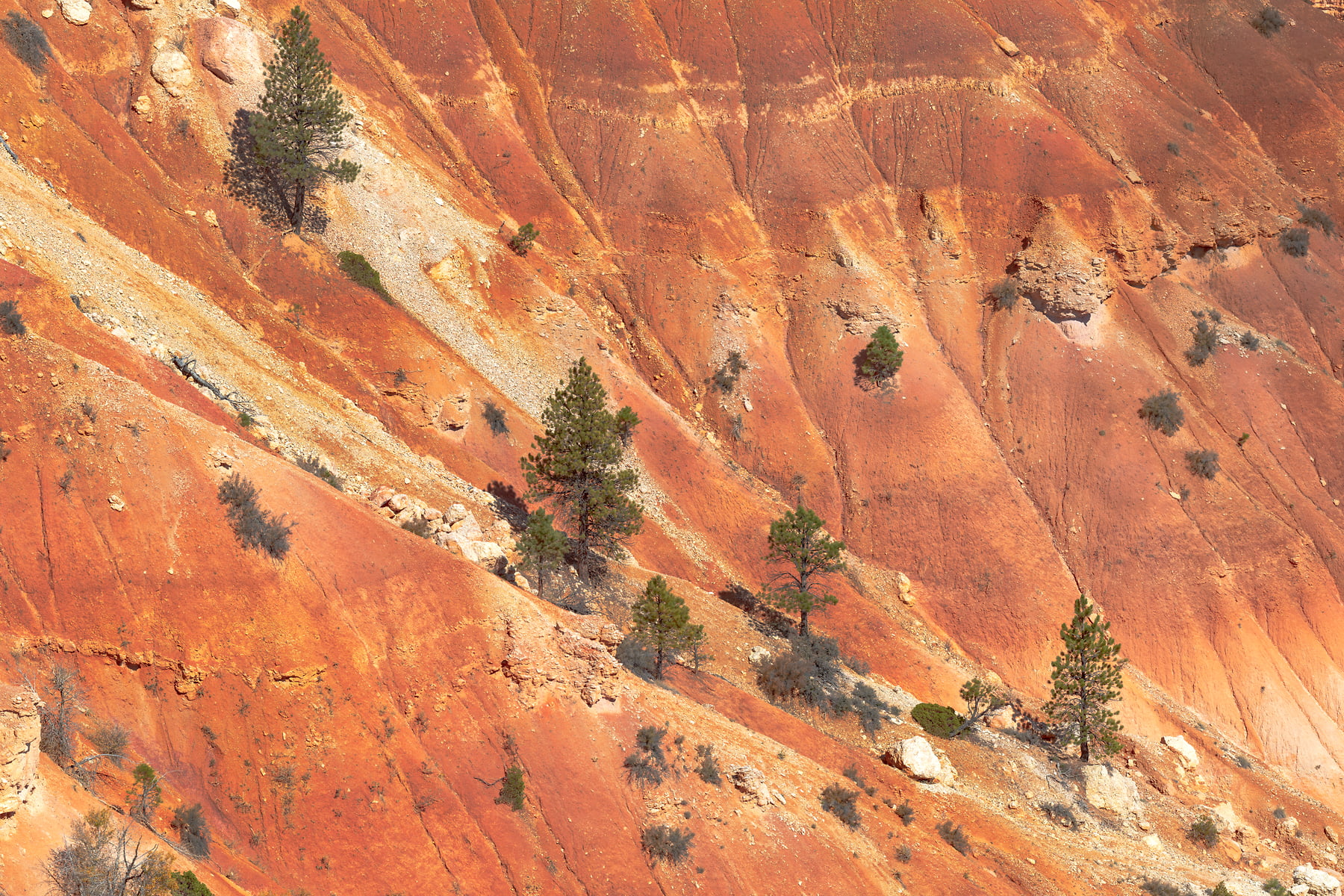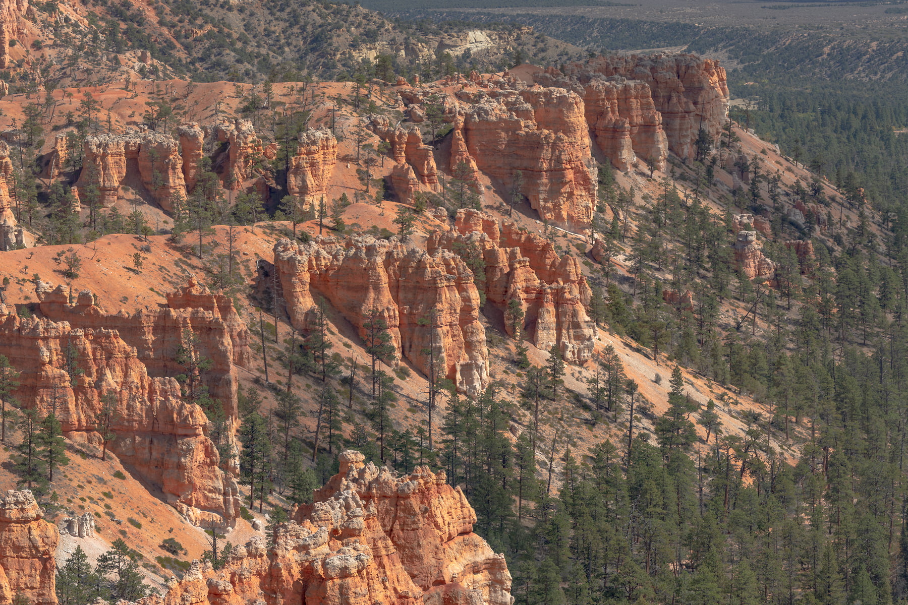 Sunset Point offers vistas of some of the most famous and breathtaking of Bryce Canyon's hoodoos. Few places are the colors of Bryce Canyon's rock better displayed than from Sunset Point. Called the Claron Formation, this unique rock is primarily composed of limestone deposited in a large freshwater lake, known to geologists as Lake Claron. Iron oxide minerals supply the vibrant red, oranges, and yellows of the lower half of the cliffs which geologists call the Pink Member. As its geologic names suggest, here too patches of pink and purple caused by manganese oxides add to the rainbow of color. The change from orange to white marks the beginning of the Upper Member. This section of limestone is purer; its lack of color is caused by the absence of mineral impurities.