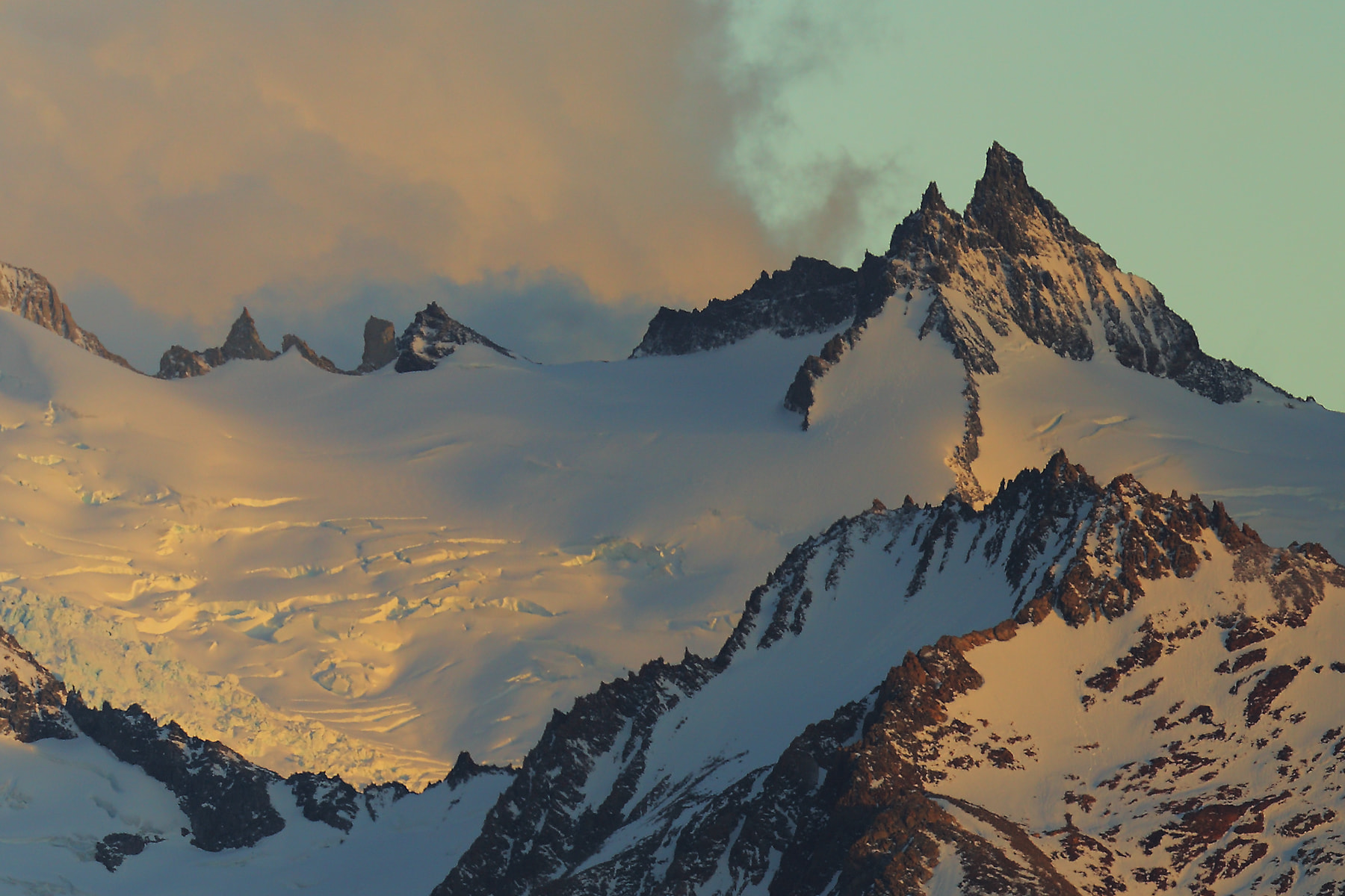 Early morning on the road to El Chalten, Argentina, Patagonia. The sun is rising just on the fortress peaks and here I like the gentle mix of soft light and shadows bringing the atmosphere.