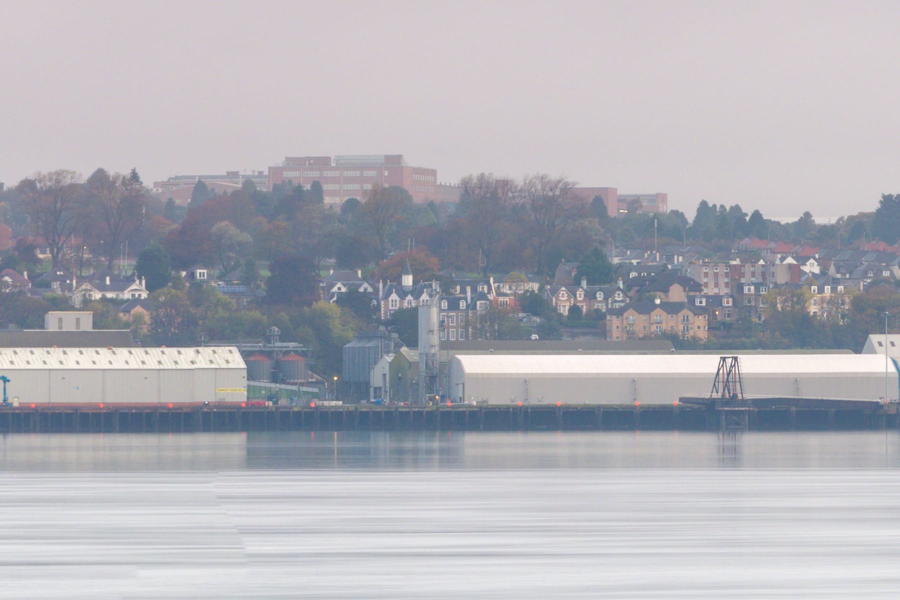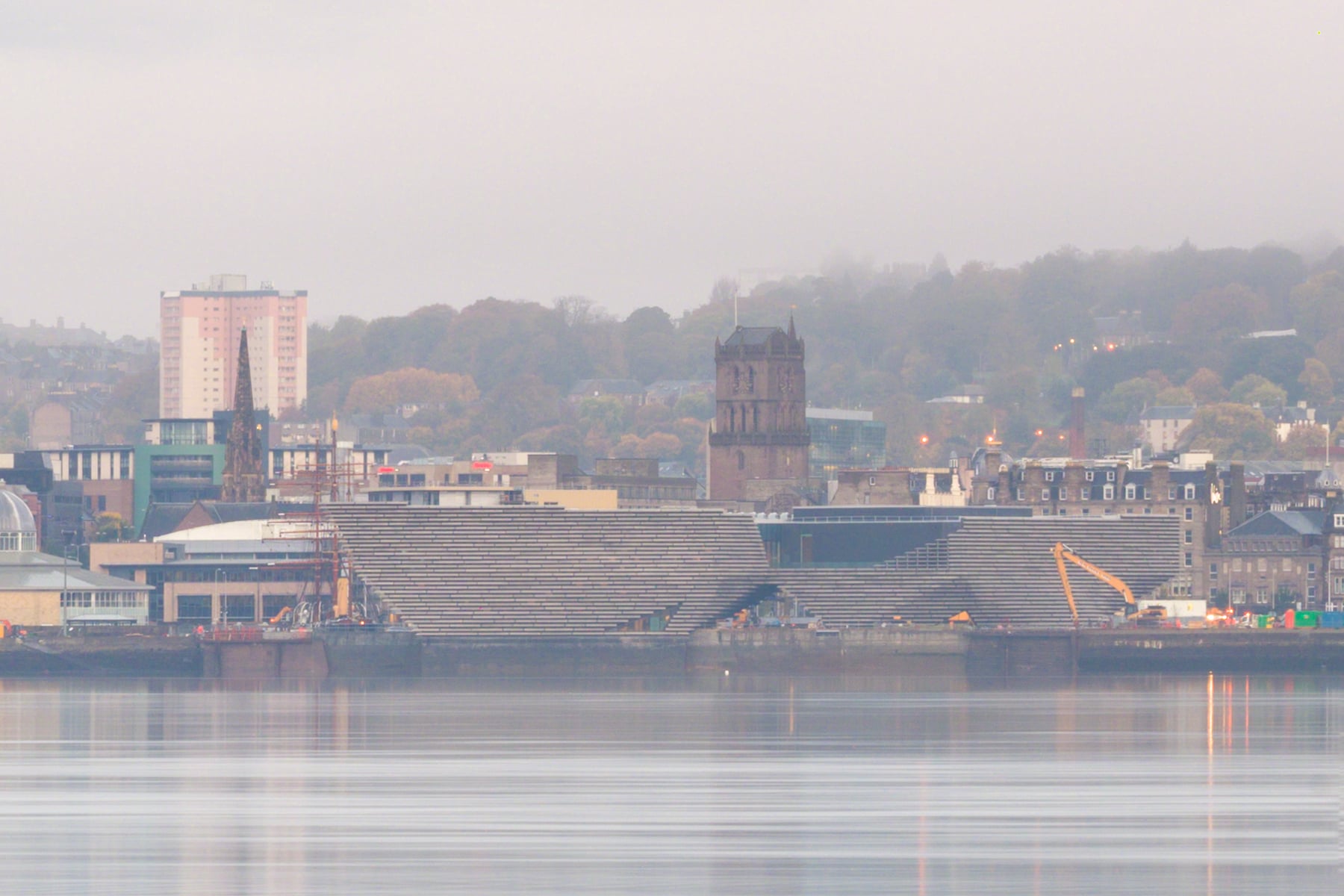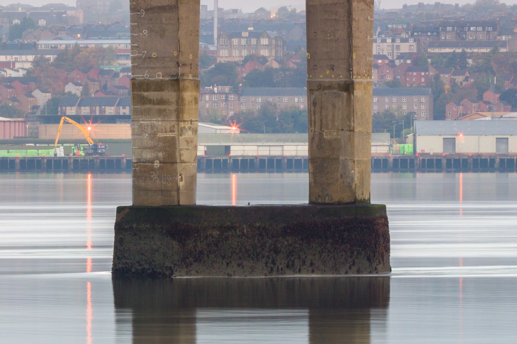 The cityscape of Dundee is visible in the distance, its buildings and structures subtly outlined against the muted tones of the sky and water. The bridge's long, slender supports create a sense of depth and perspective, drawing the viewer's eye along its length towards the horizon.