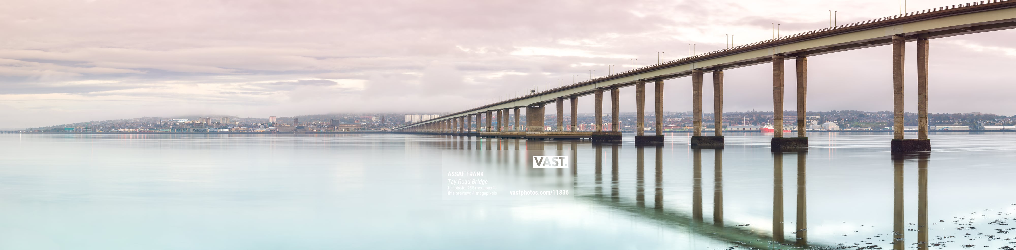 This panoramic photograph beautifully captures the Tay Road Bridge stretching over the River Tay in Dundee, Scotland. The bridge extends gracefully across the calm waters, creating a series of symmetrical reflections that enhance the serene and expansive feel of the scene. The overcast sky casts a soft, diffused light, giving the image a tranquil and contemplative atmosphere.